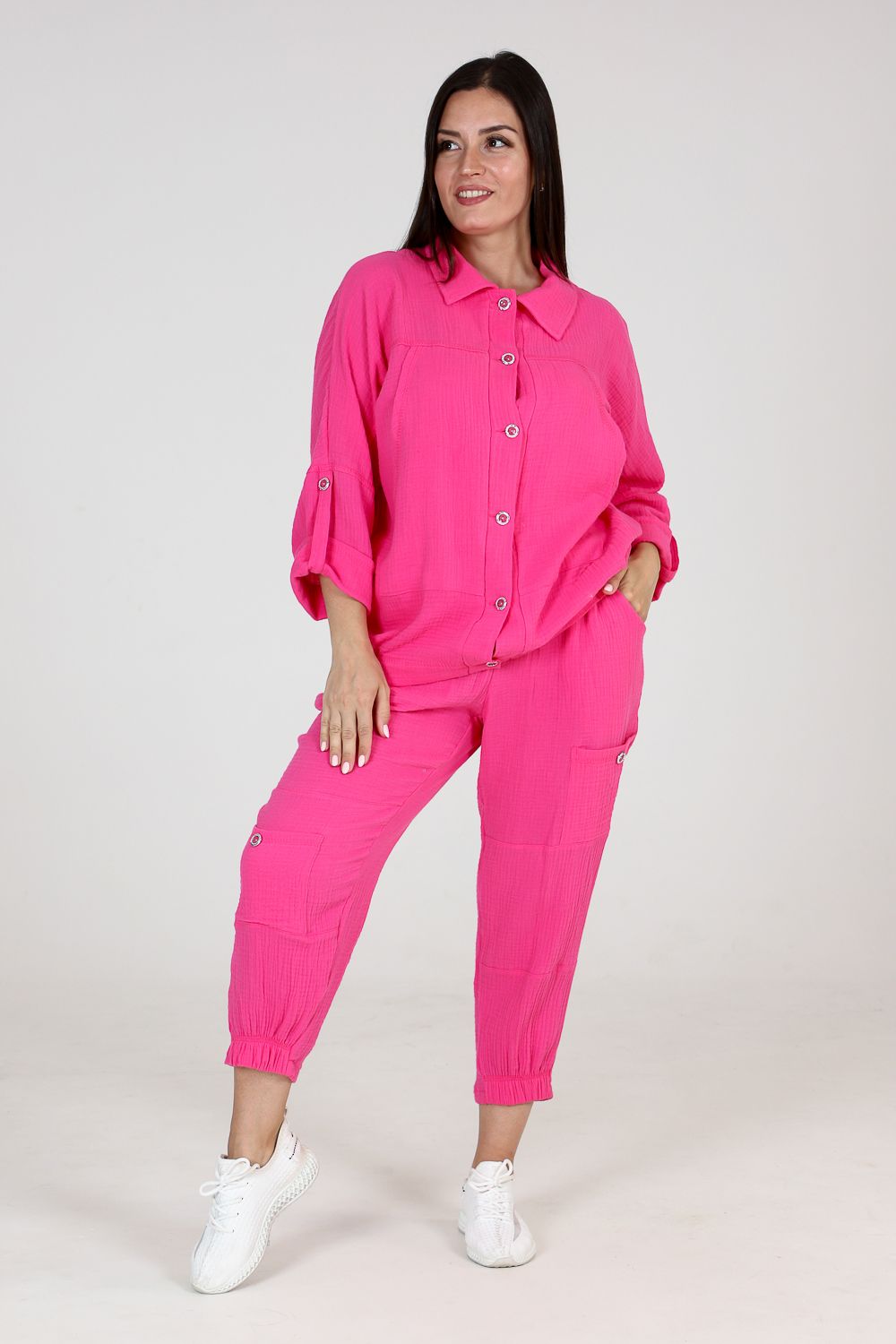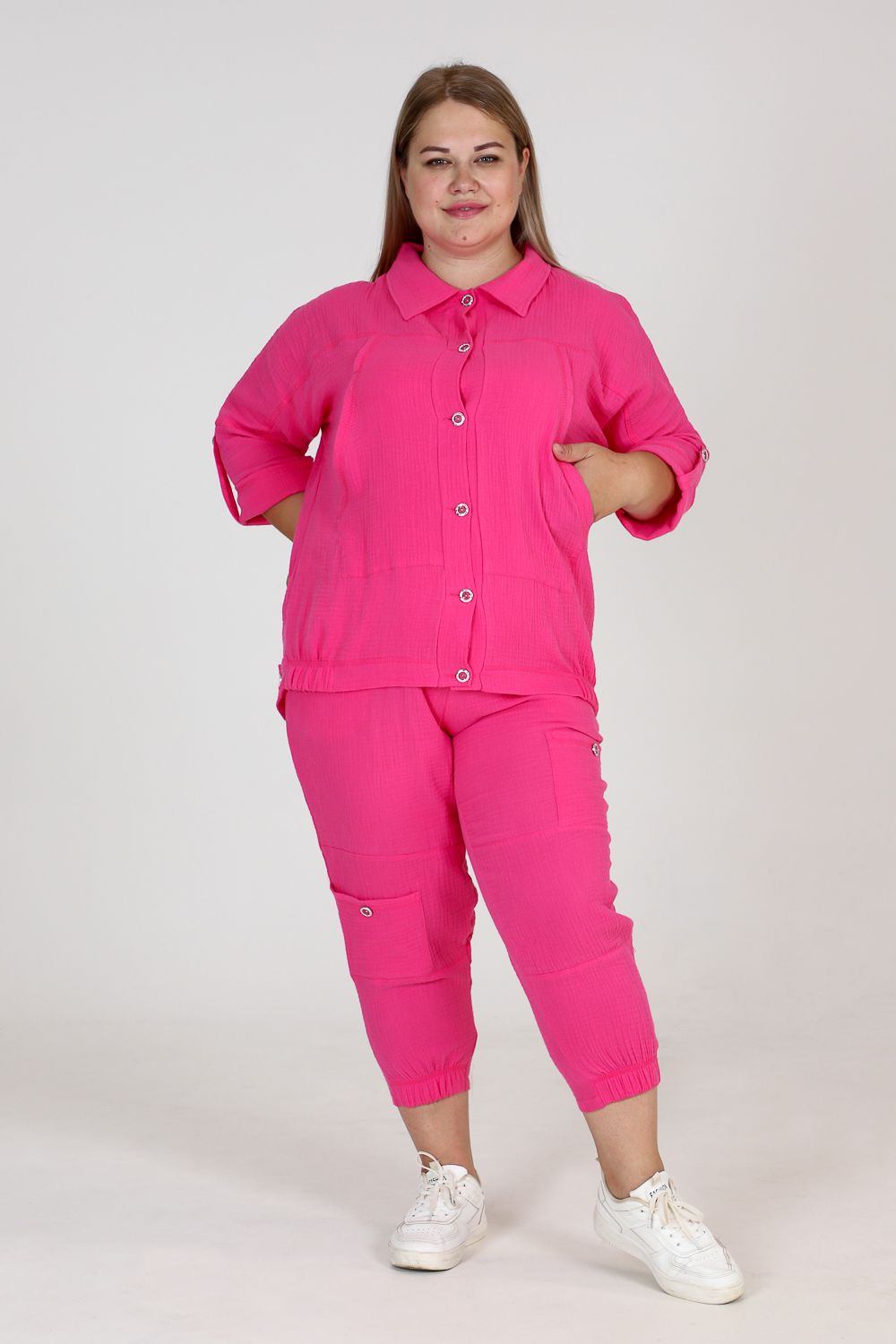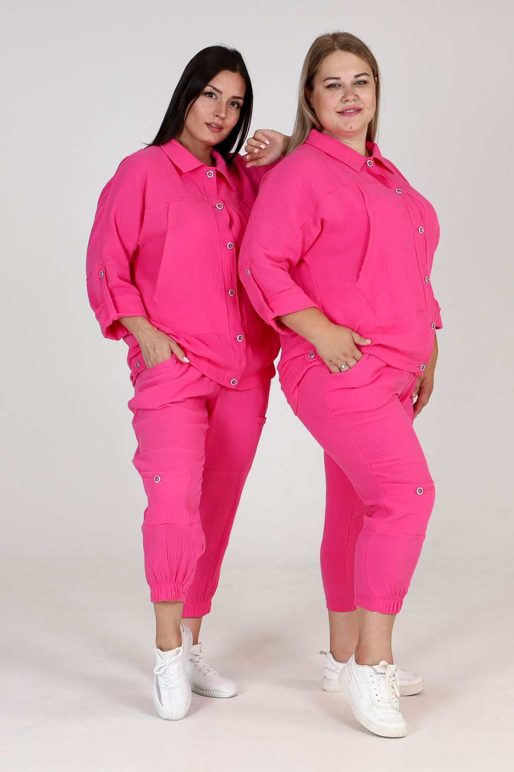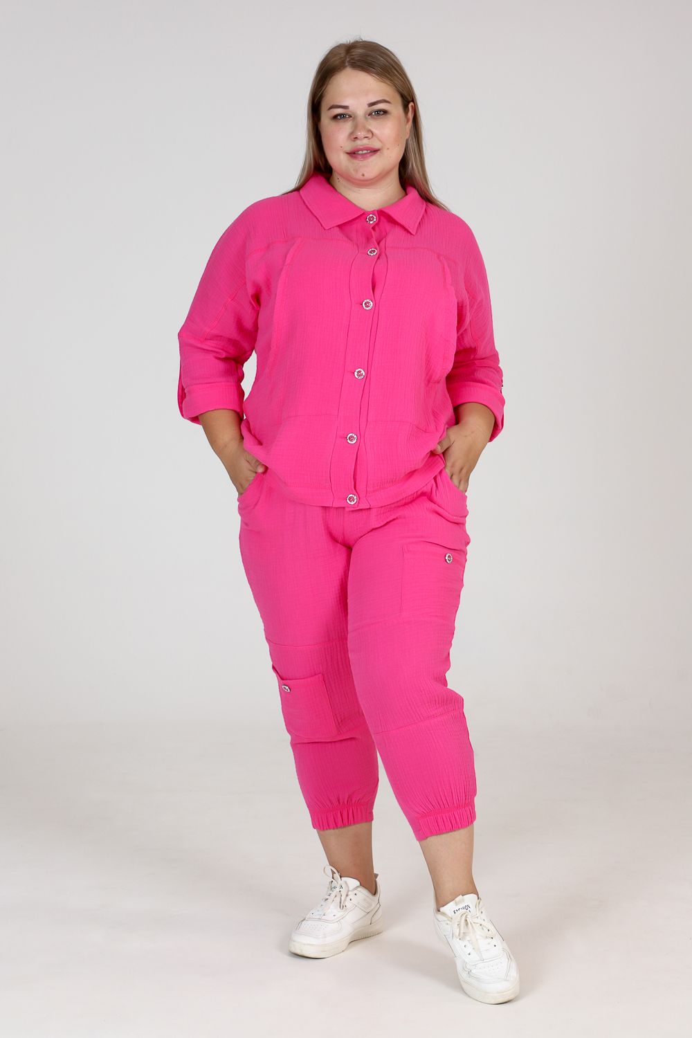 Костюм женский: Куртка и брюки. Куртка прямого силуэта, воротник втачной, на полочке кокетка и накладной карман типа "кенгуру", застежка на планке на петли - пуговицы (петли с глазком). Рукав цельнокроенный со швом с манжетой и хлястом. Внизу полочки пояс, сбоку пояса резинка. На спинке кокетка, по центру декоративная складка с двумя пуговицами. Внизу бокового две декоративные паты с пуговицами. Брюки свободные по бедрам, внизу передние половинки брюк собраны на резинку. Передняя часть брюк состоит из трех частей. В верхней части внутренние накладные карманы. Накладной карман на верхней левой и средней правой частях брюк. Пояс выполнен на многоигольной машине.