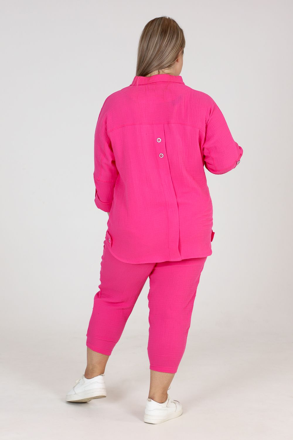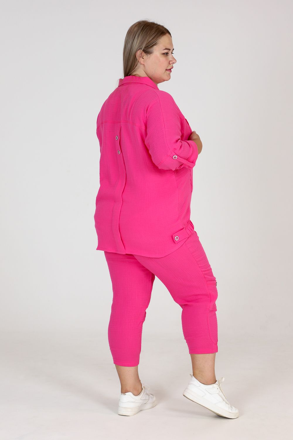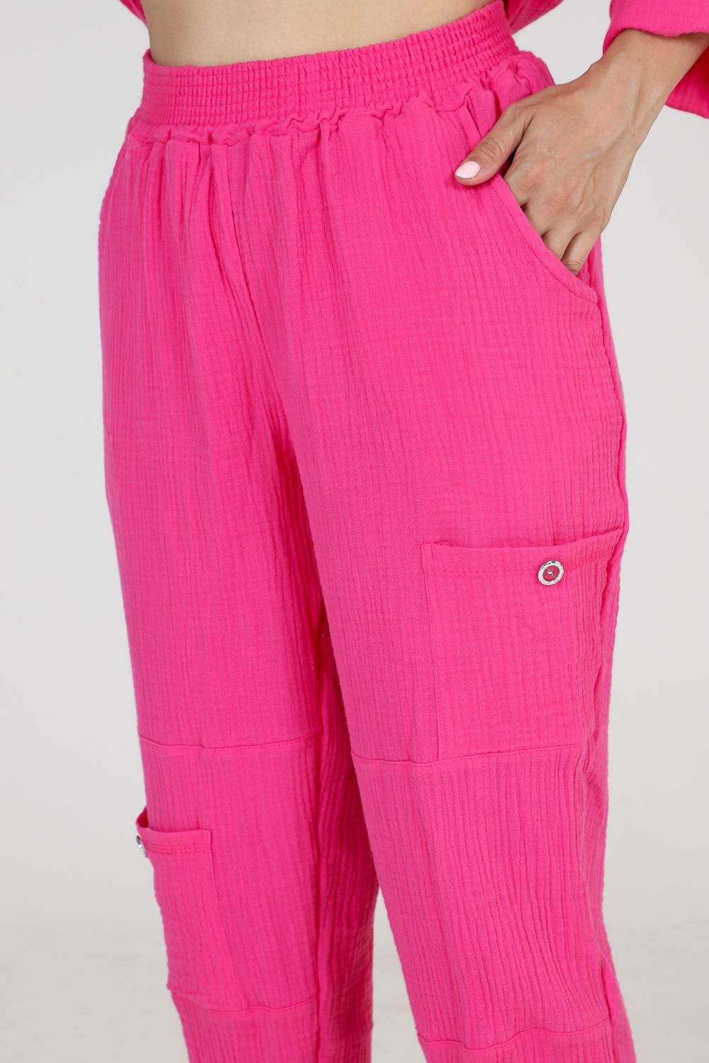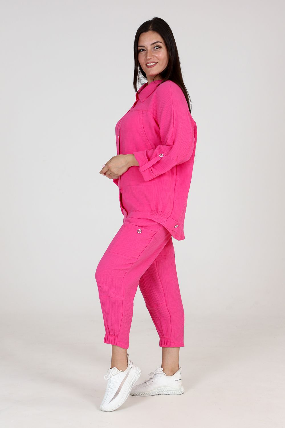 Костюм женский: Куртка и брюки. Куртка прямого силуэта, воротник втачной, на полочке кокетка и накладной карман типа "кенгуру", застежка на планке на петли - пуговицы (петли с глазком). Рукав цельнокроенный со швом с манжетой и хлястом. Внизу полочки пояс, сбоку пояса резинка. На спинке кокетка, по центру декоративная складка с двумя пуговицами. Внизу бокового две декоративные паты с пуговицами. Брюки свободные по бедрам, внизу передние половинки брюк собраны на резинку. Передняя часть брюк состоит из трех частей. В верхней части внутренние накладные карманы. Накладной карман на верхней левой и средней правой частях брюк. Пояс выполнен на многоигольной машине.