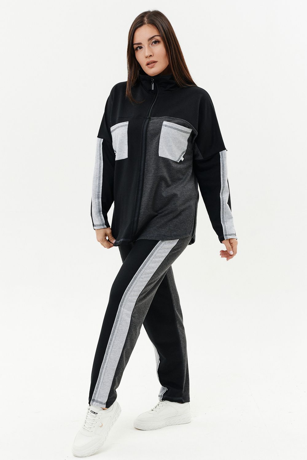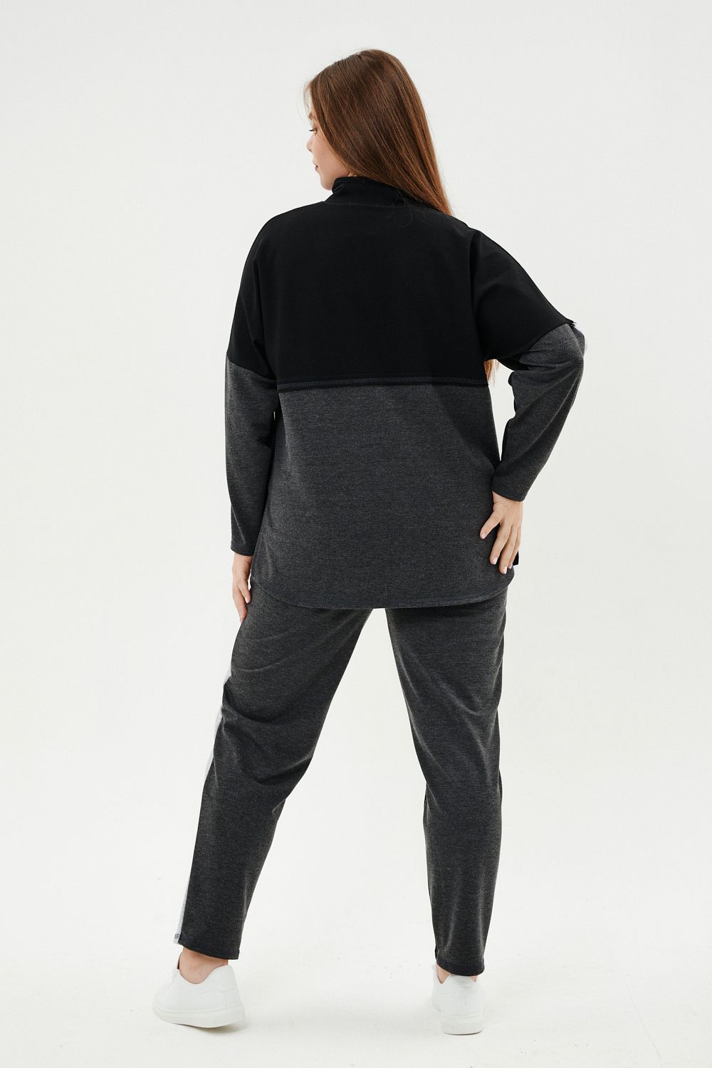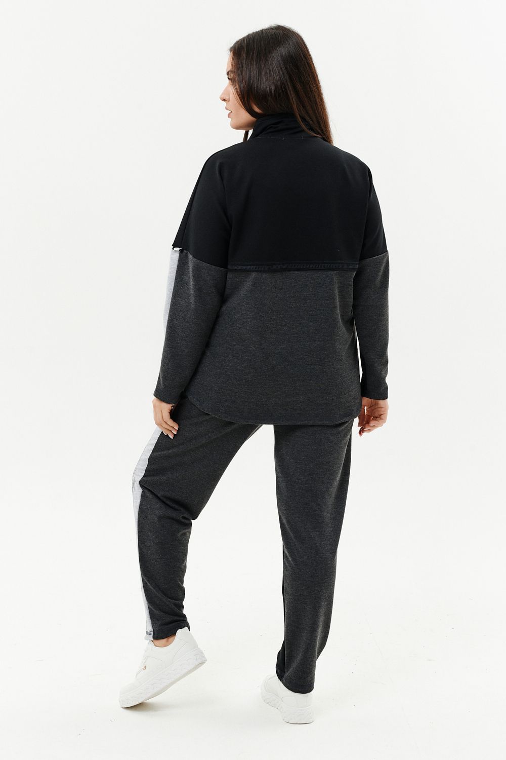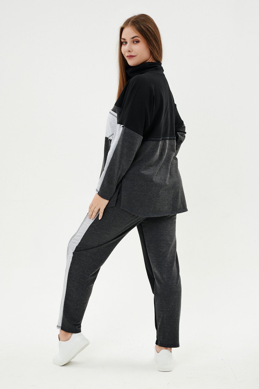 Костюм женский: толстовка и брюки. Толстовка прямого силуэта, брюки свободные по бедрам, зауженные к низу. Рукав цельнокроенный со швом. Воротник-стойка застегивается на тесьму-молнию. Карман "кенгуру". В костюме удачно сочетается однотонный футер с меланжированным. На спинке и полочке кокетки. Нагрудные карманы, лампасы на рукавах и брюках из контрастной отделочной ткани. На передних половинках брюк внутренние карманы.