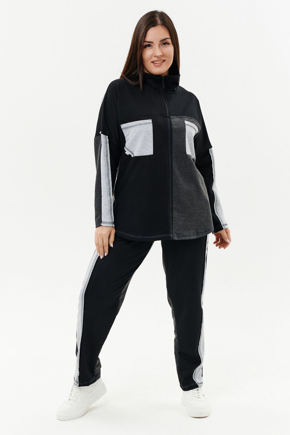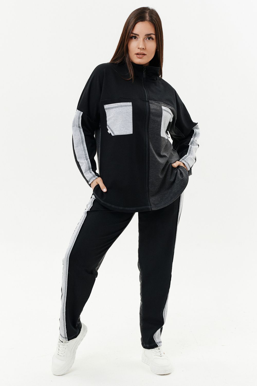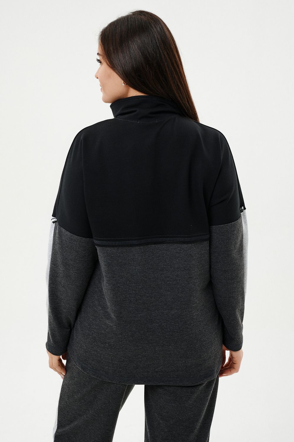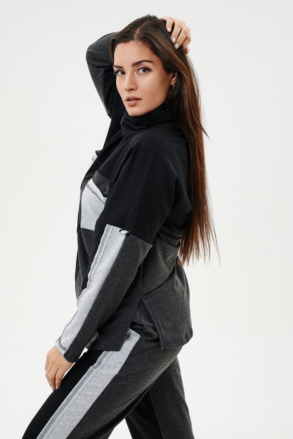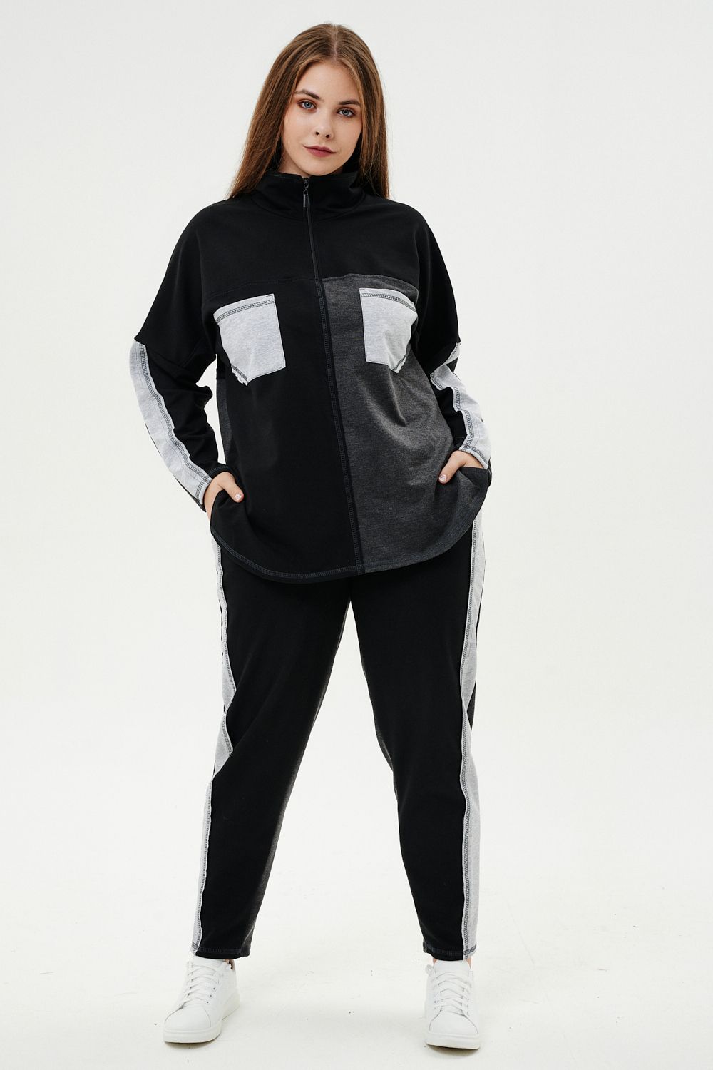 Костюм женский: толстовка и брюки. Толстовка прямого силуэта, брюки свободные по бедрам, зауженные к низу. Рукав цельнокроенный со швом. Воротник-стойка застегивается на тесьму-молнию. Карман "кенгуру". В костюме удачно сочетается однотонный футер с меланжированным. На спинке и полочке кокетки. Нагрудные карманы, лампасы на рукавах и брюках из контрастной отделочной ткани. На передних половинках брюк внутренние карманы.