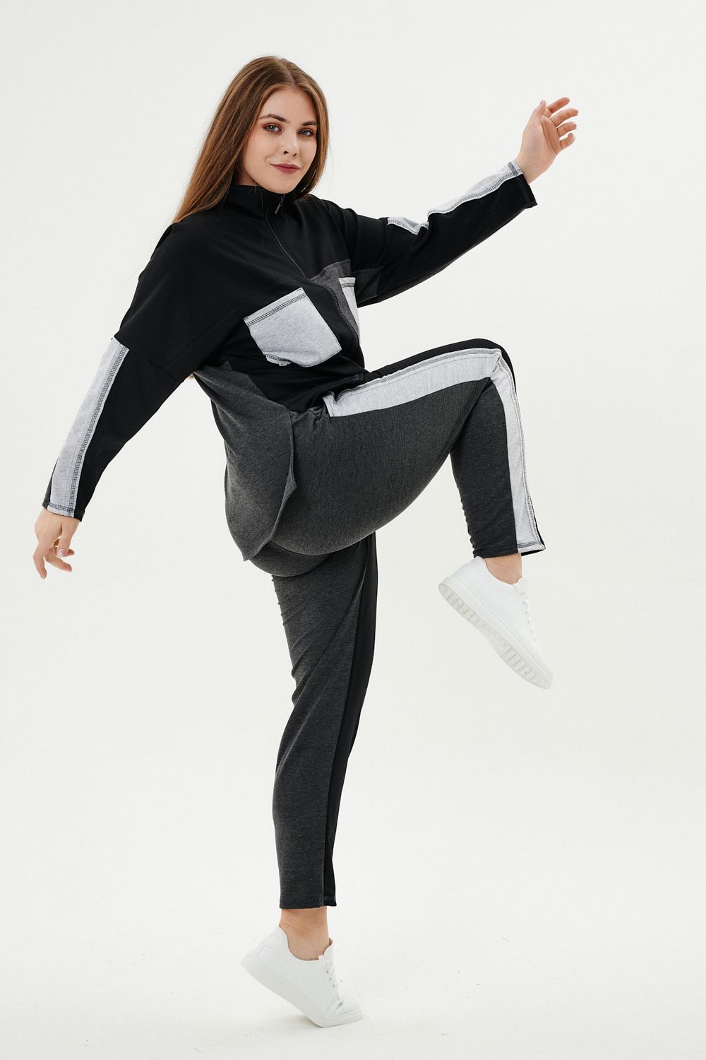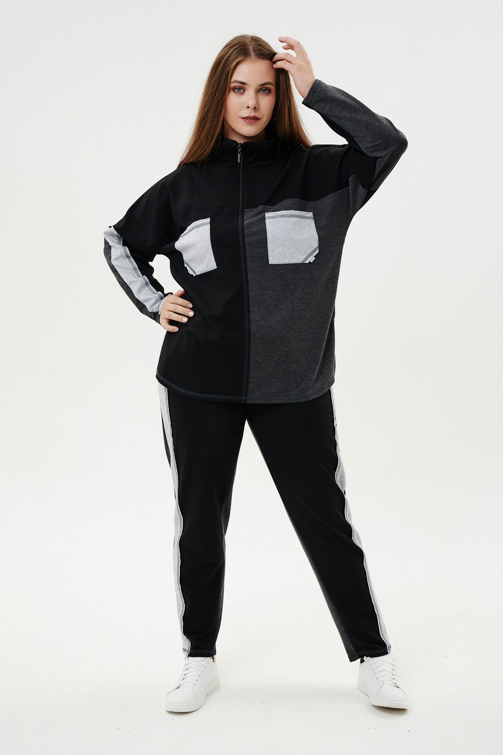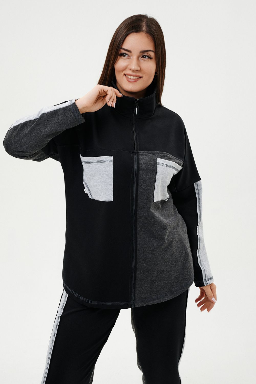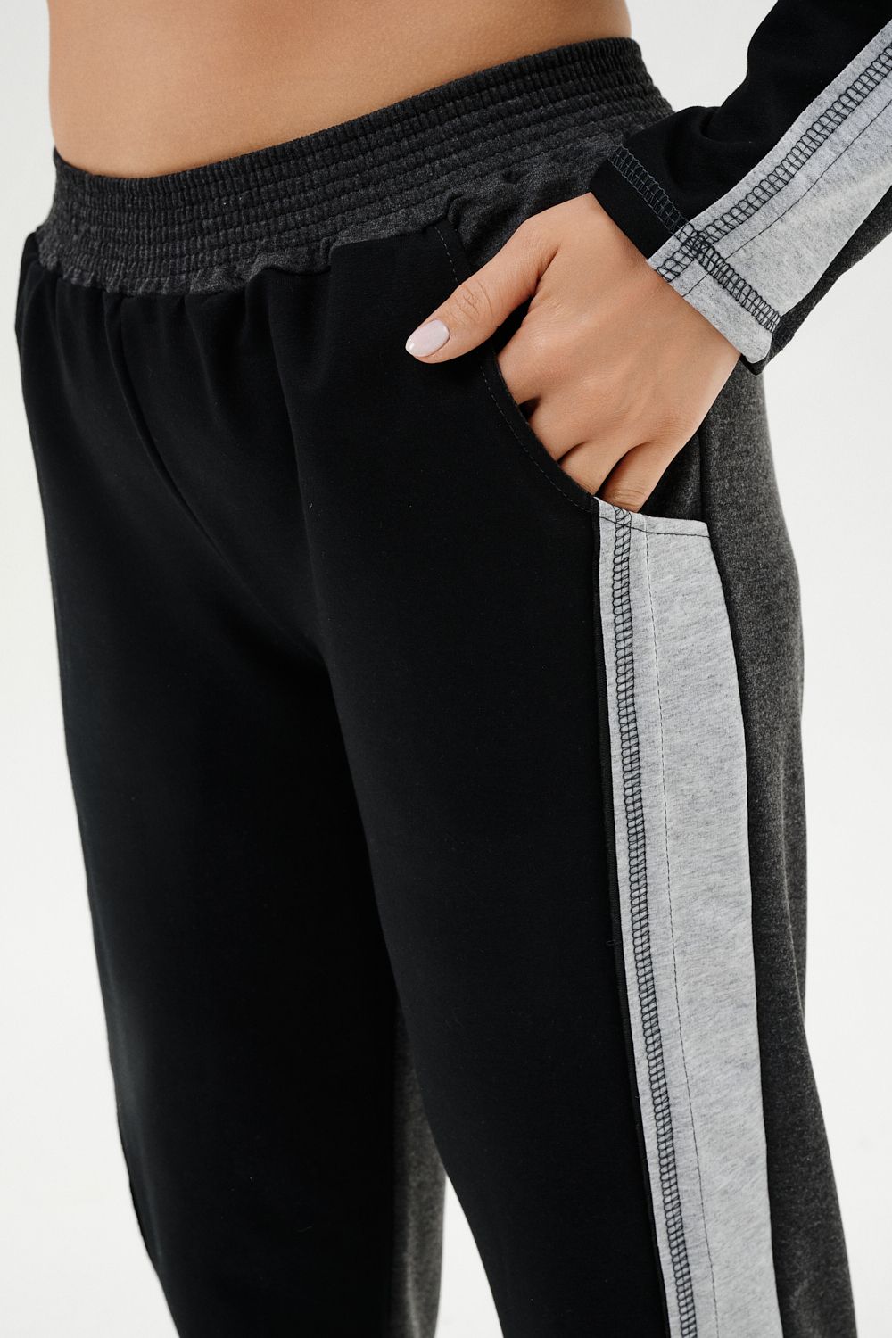 Костюм женский: толстовка и брюки. Толстовка прямого силуэта, брюки свободные по бедрам, зауженные к низу. Рукав цельнокроенный со швом. Воротник-стойка застегивается на тесьму-молнию. Карман "кенгуру". В костюме удачно сочетается однотонный футер с меланжированным. На спинке и полочке кокетки. Нагрудные карманы, лампасы на рукавах и брюках из контрастной отделочной ткани. На передних половинках брюк внутренние карманы.