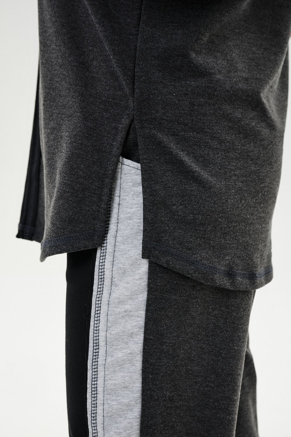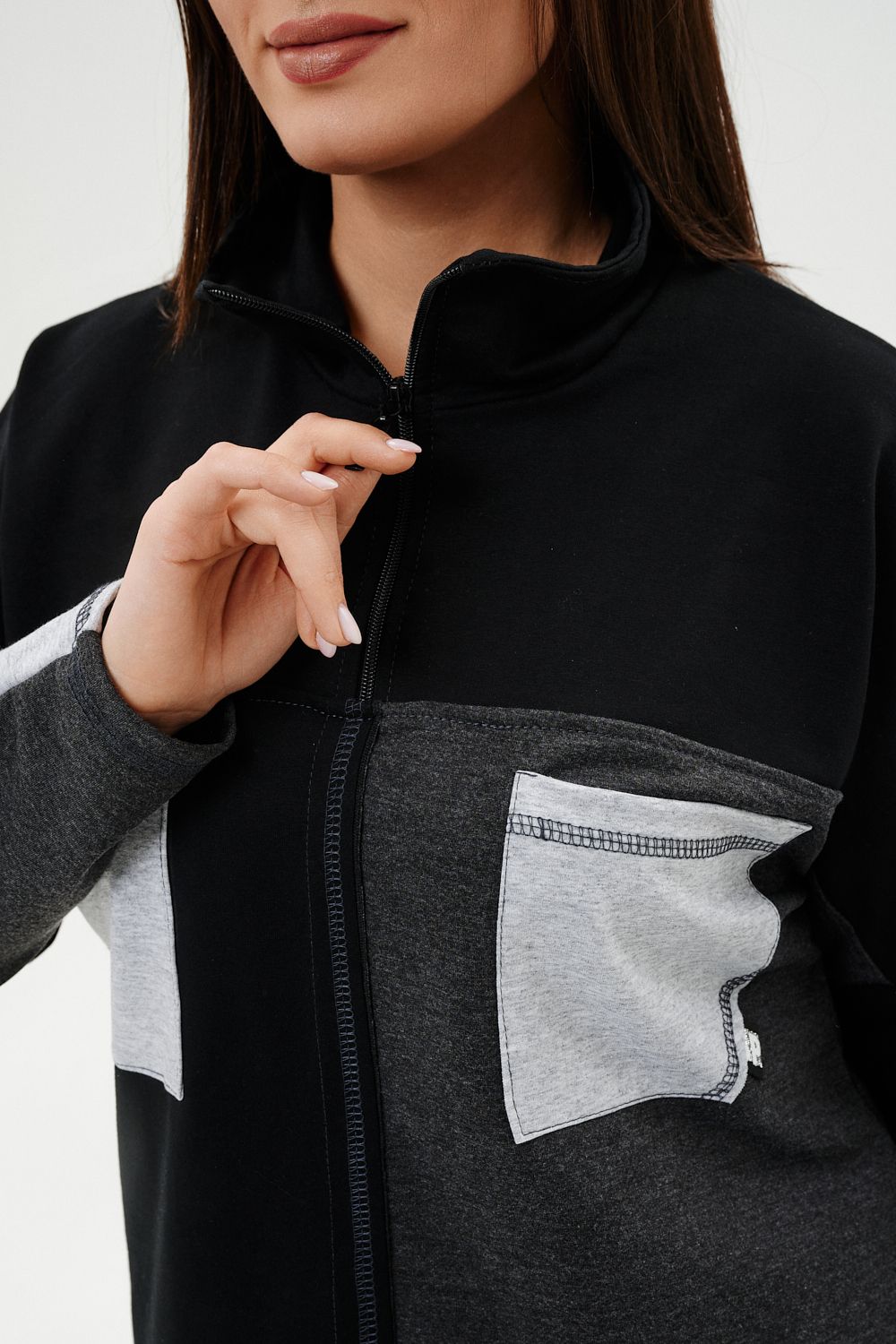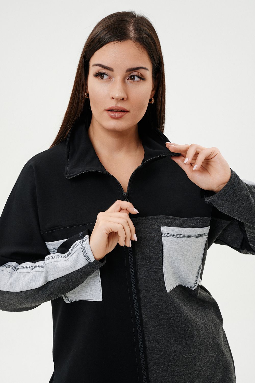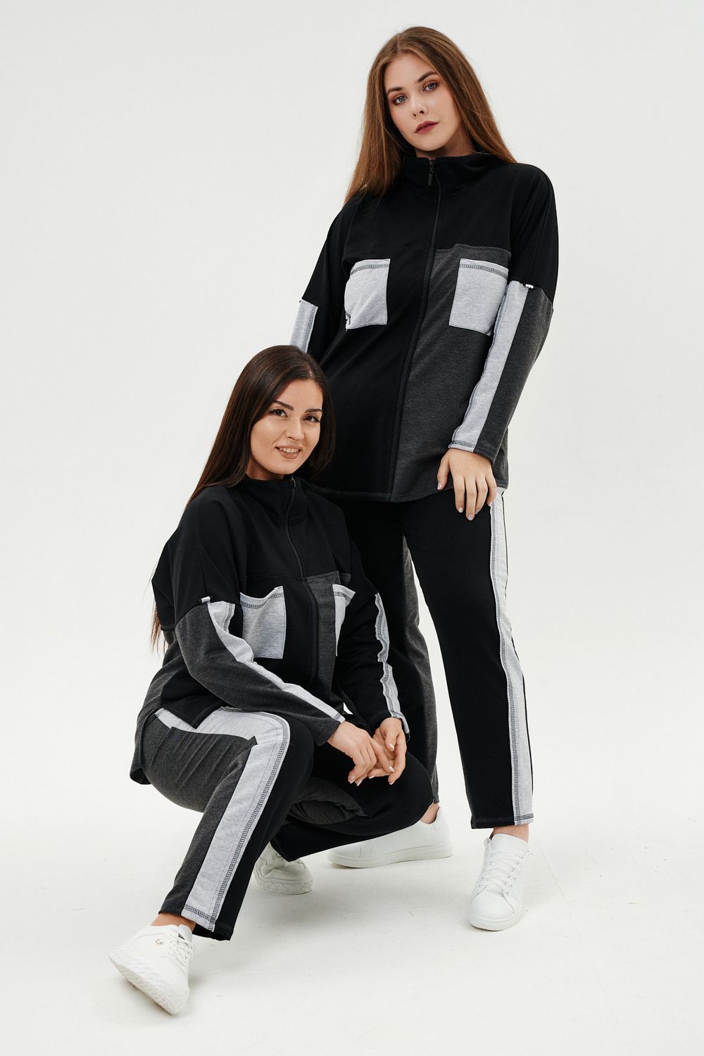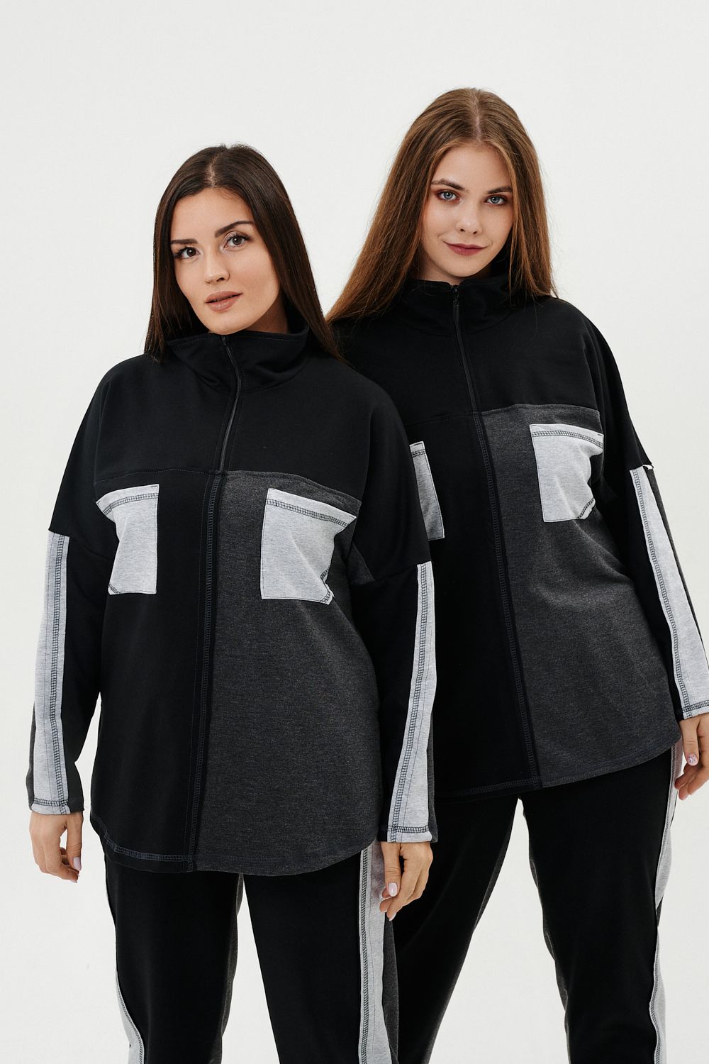 Костюм женский: толстовка и брюки. Толстовка прямого силуэта, брюки свободные по бедрам, зауженные к низу. Рукав цельнокроенный со швом. Воротник-стойка застегивается на тесьму-молнию. Карман "кенгуру". В костюме удачно сочетается однотонный футер с меланжированным. На спинке и полочке кокетки. Нагрудные карманы, лампасы на рукавах и брюках из контрастной отделочной ткани. На передних половинках брюк внутренние карманы.