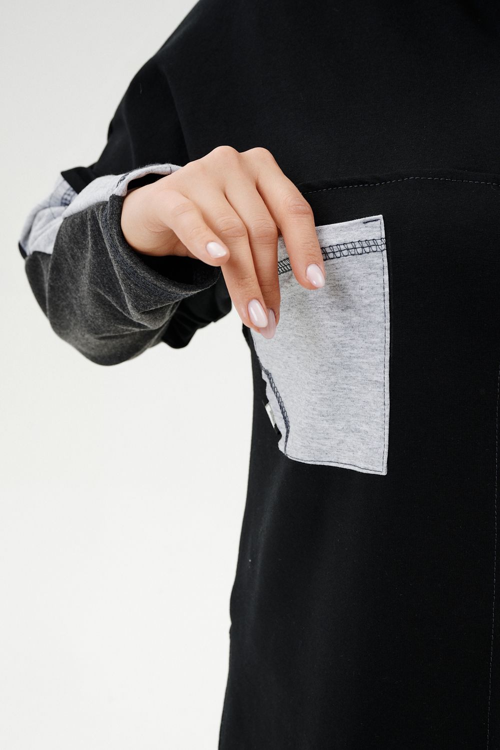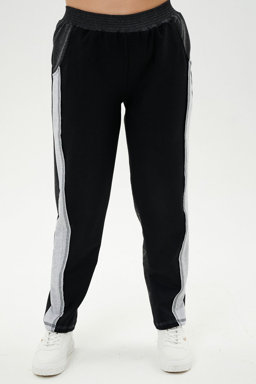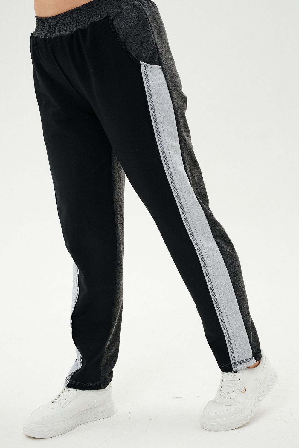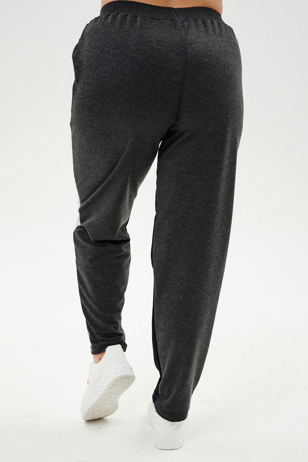 Костюм женский: толстовка и брюки. Толстовка прямого силуэта, брюки свободные по бедрам, зауженные к низу. Рукав цельнокроенный со швом. Воротник-стойка застегивается на тесьму-молнию. Карман "кенгуру". В костюме удачно сочетается однотонный футер с меланжированным. На спинке и полочке кокетки. Нагрудные карманы, лампасы на рукавах и брюках из контрастной отделочной ткани. На передних половинках брюк внутренние карманы.
