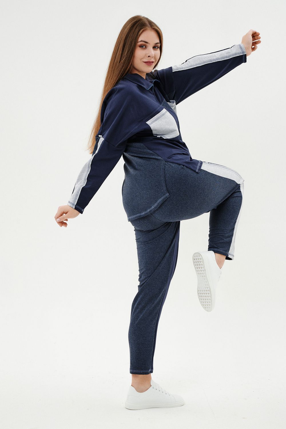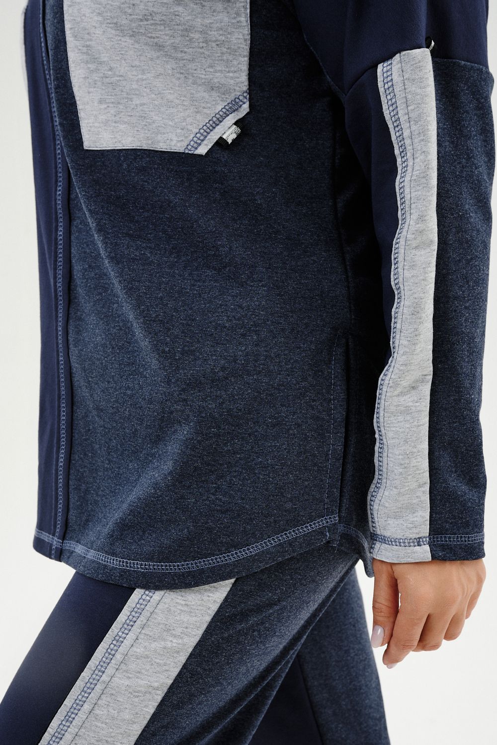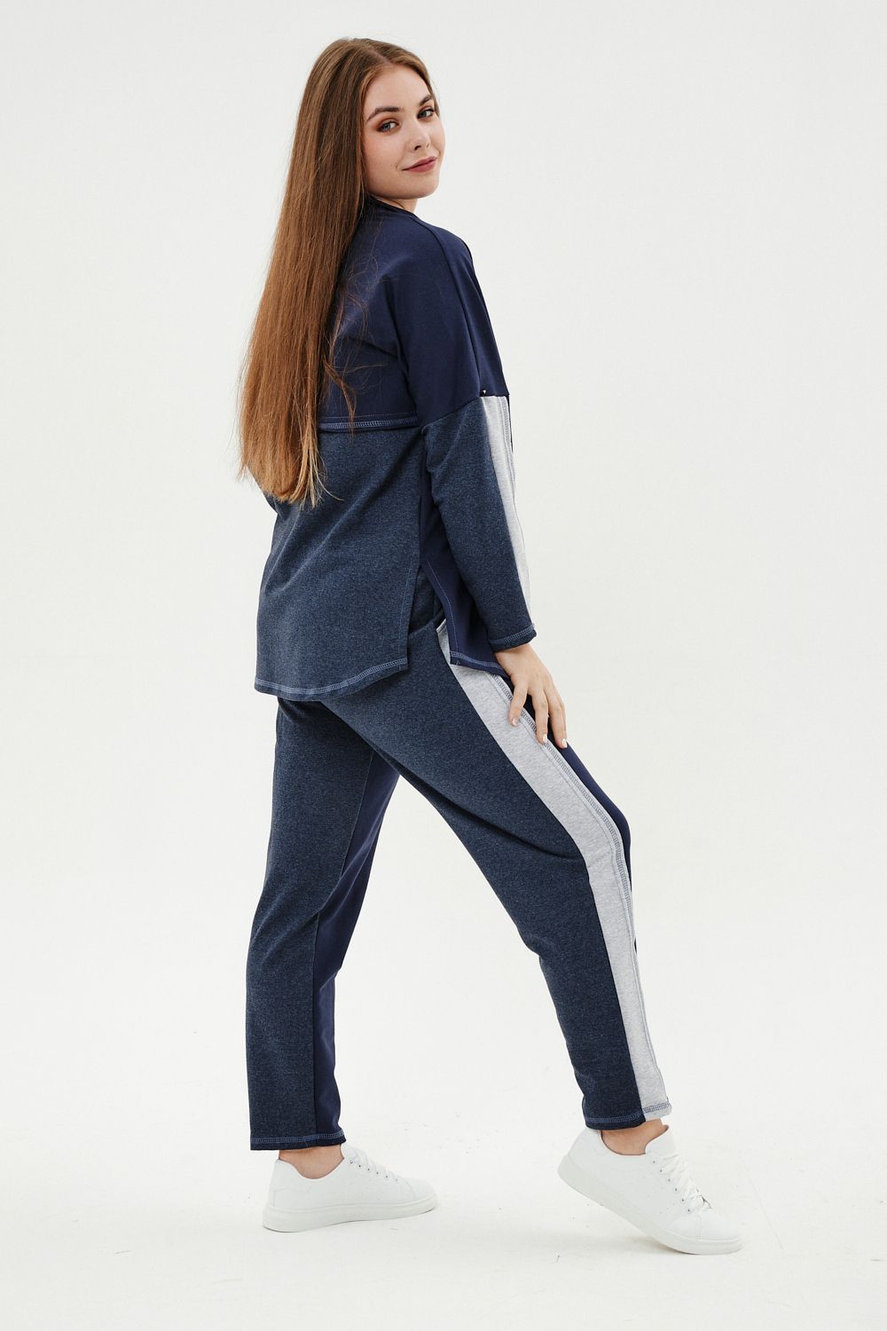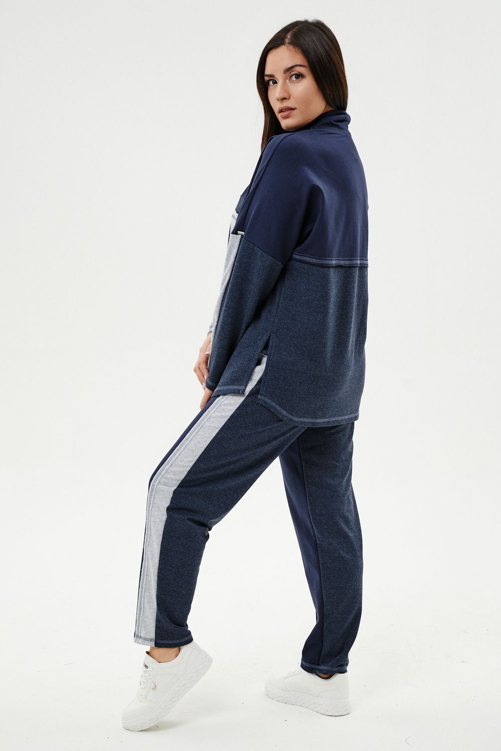 Костюм женский: толстовка и брюки. Толстовка прямого силуэта, брюки свободные по бедрам, зауженные к низу. Рукав цельнокроенный со швом. Воротник-стойка застегивается на тесьму-молнию. Карман "кенгуру". В костюме удачно сочетается однотонный футер с меланжированным. На спинке и полочке кокетки. Нагрудные карманы, лампасы на рукавах и брюках из контрастной отделочной ткани. На передних половинках брюк внутренние карманы.