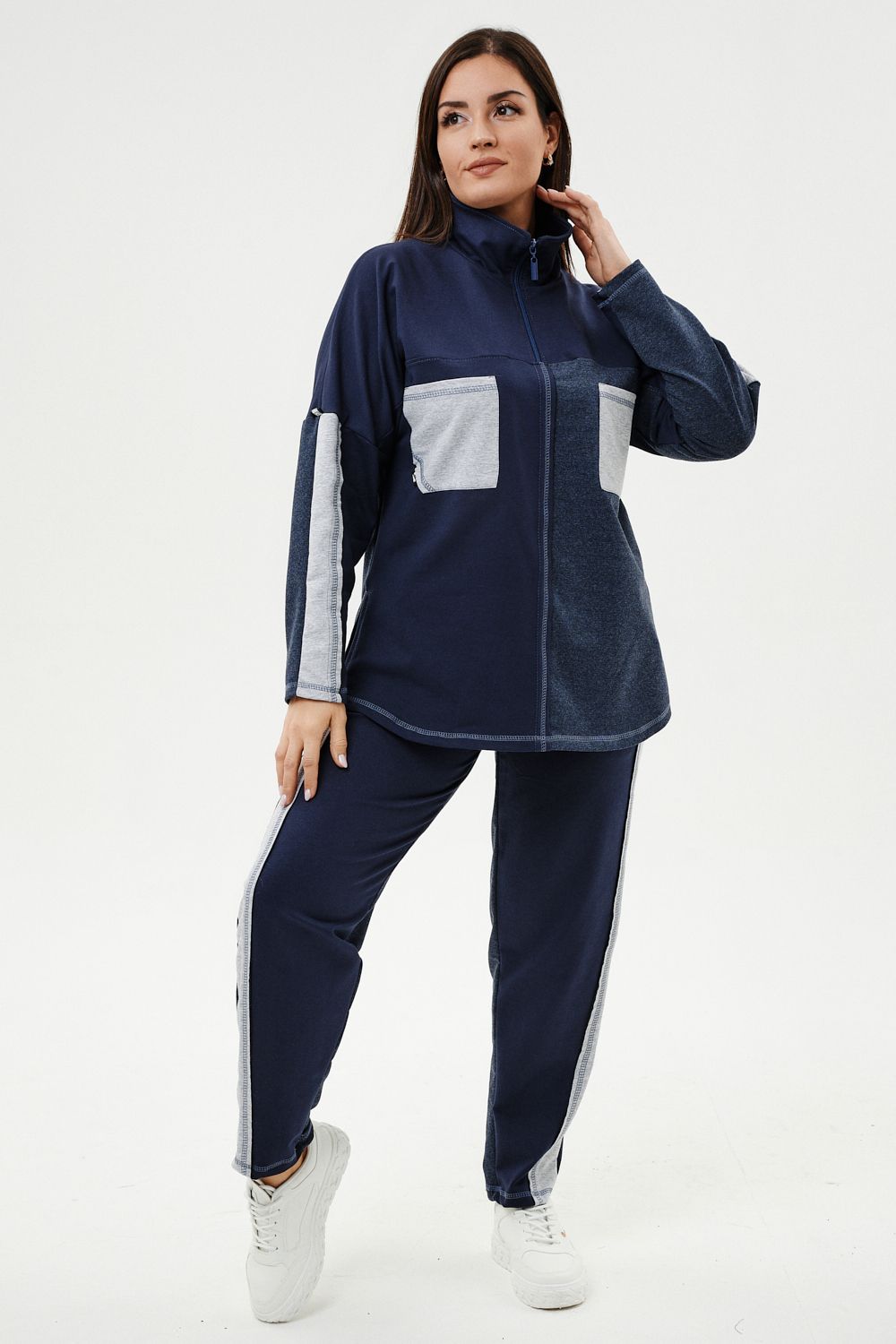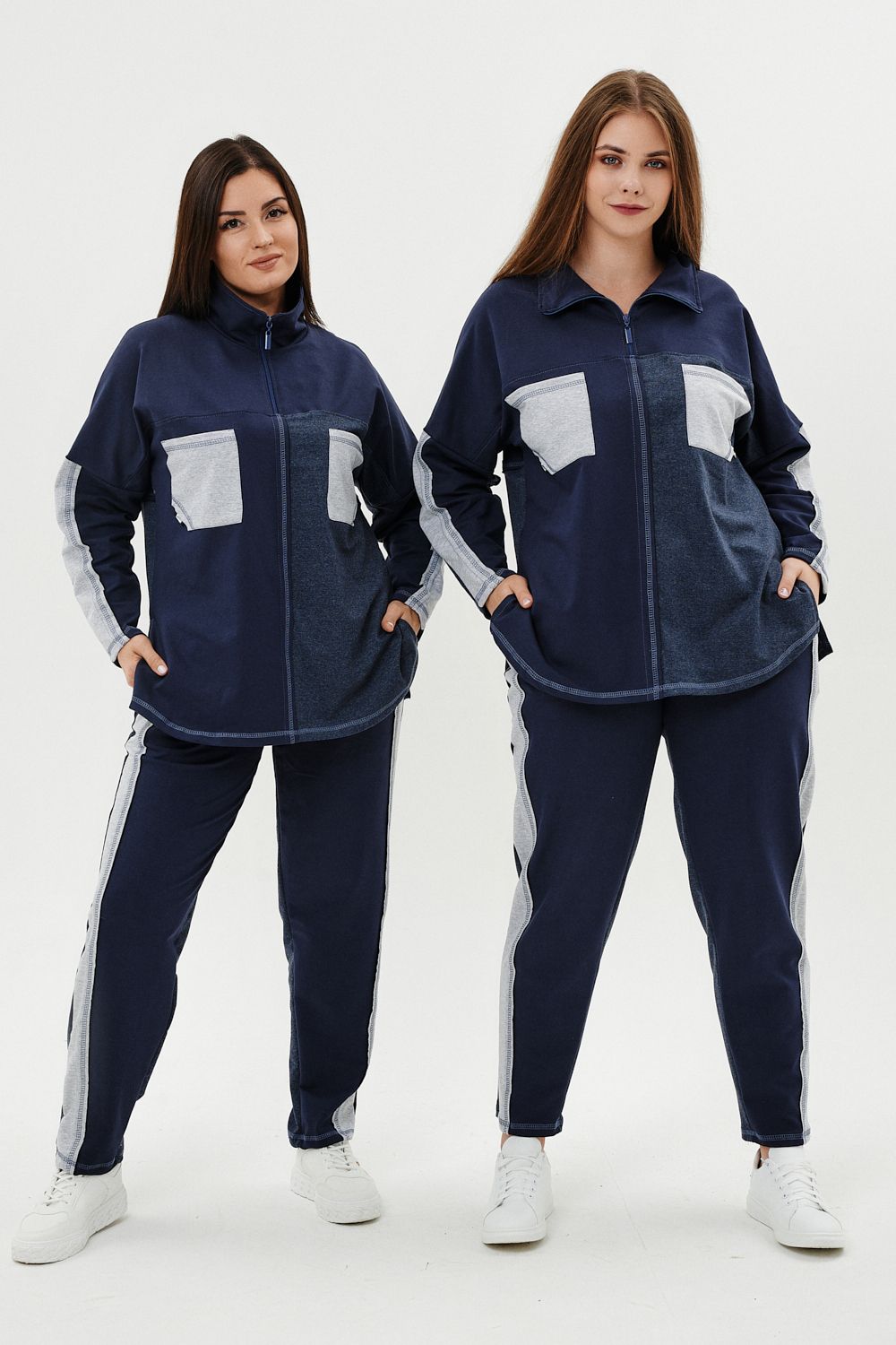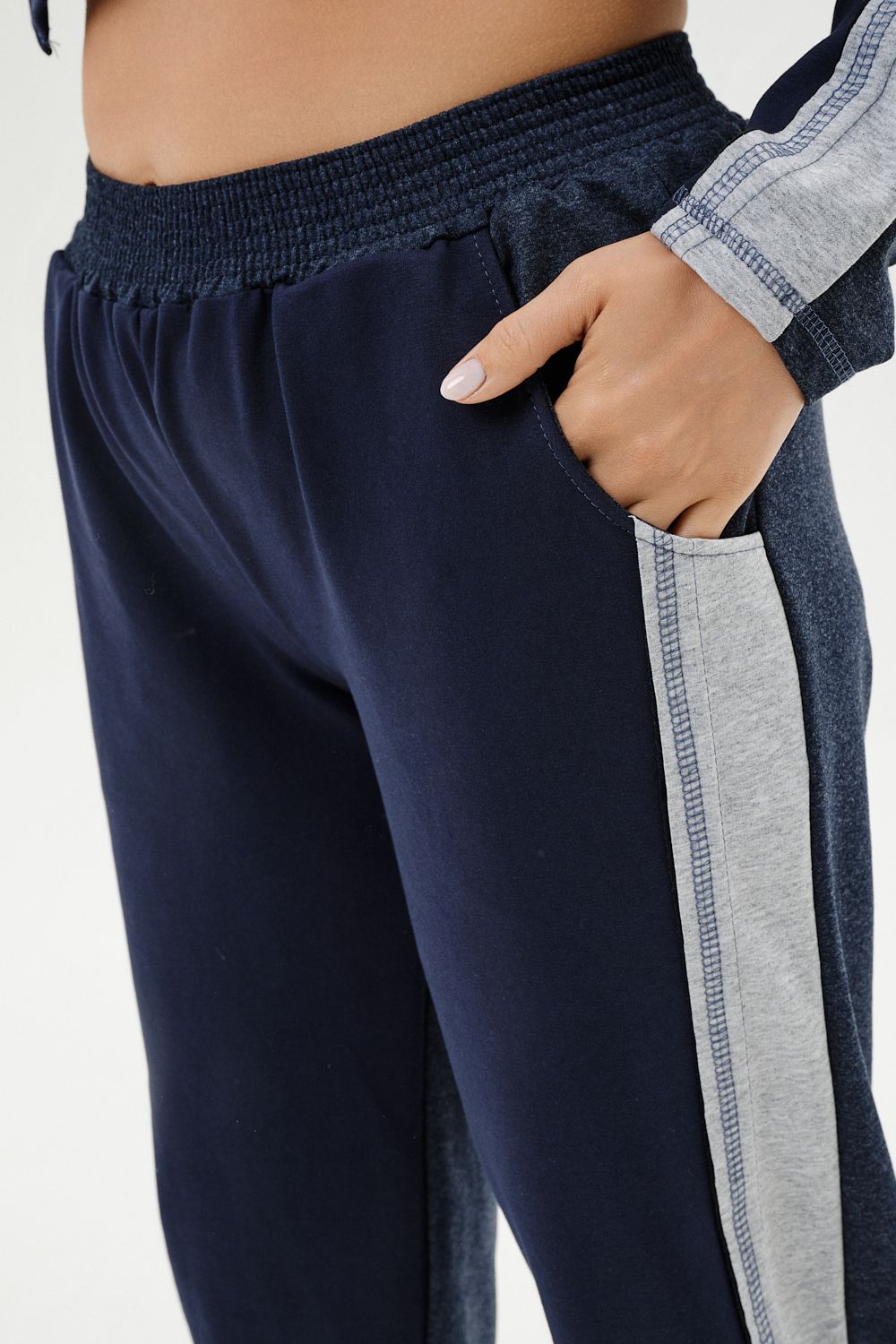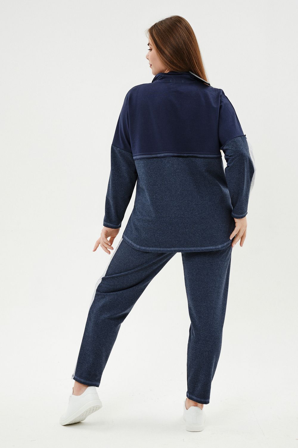 Костюм женский: толстовка и брюки. Толстовка прямого силуэта, брюки свободные по бедрам, зауженные к низу. Рукав цельнокроенный со швом. Воротник-стойка застегивается на тесьму-молнию. Карман "кенгуру". В костюме удачно сочетается однотонный футер с меланжированным. На спинке и полочке кокетки. Нагрудные карманы, лампасы на рукавах и брюках из контрастной отделочной ткани. На передних половинках брюк внутренние карманы.