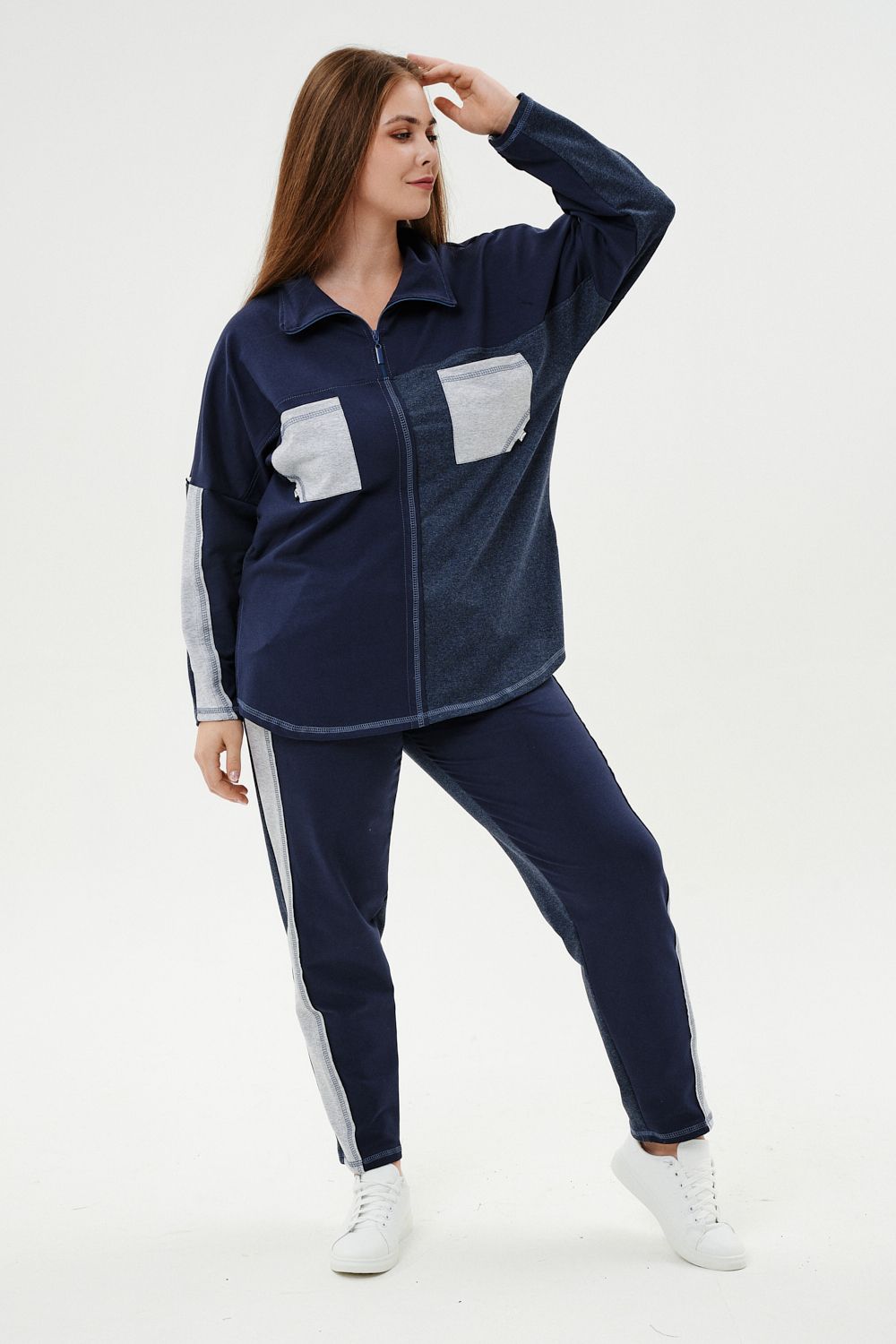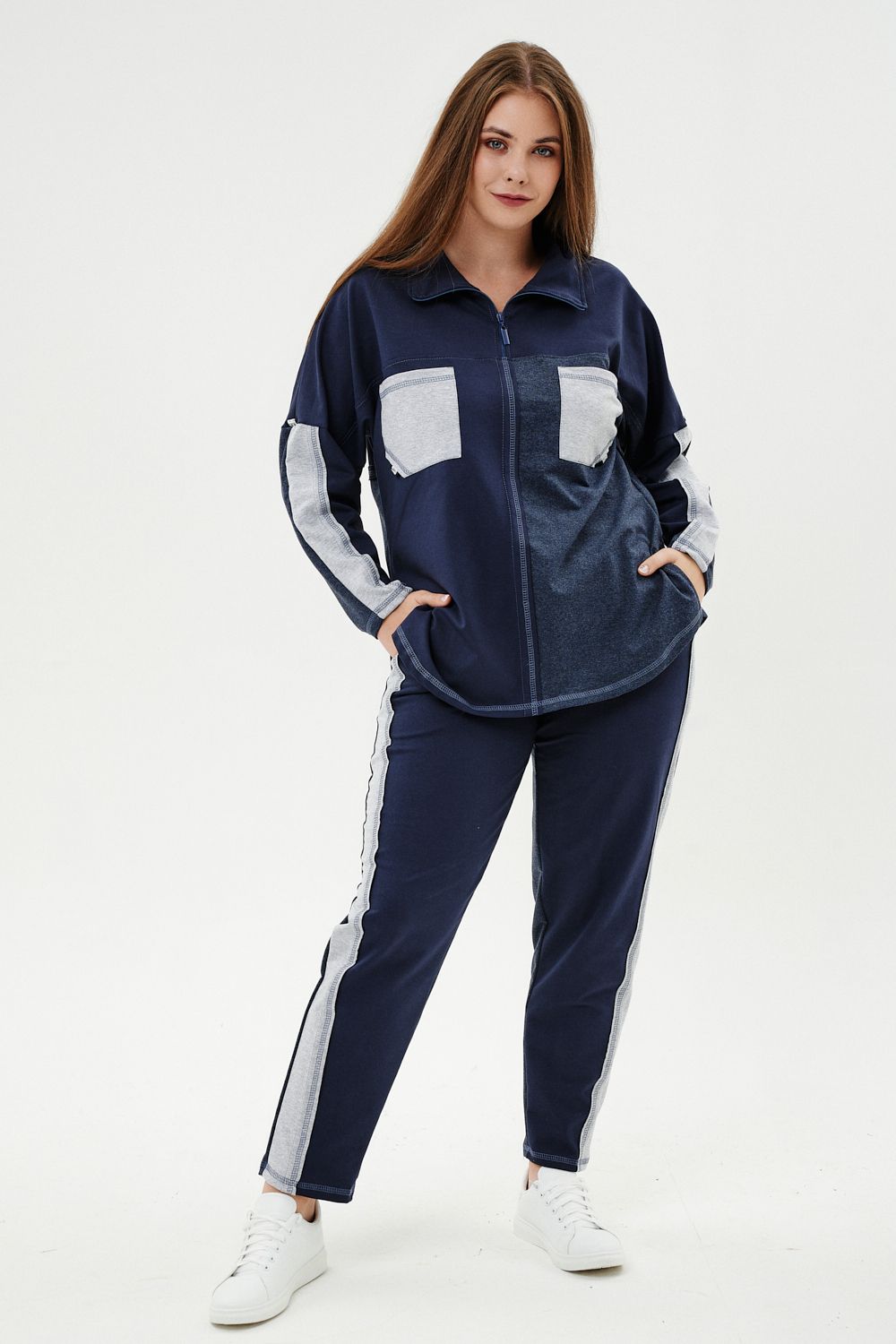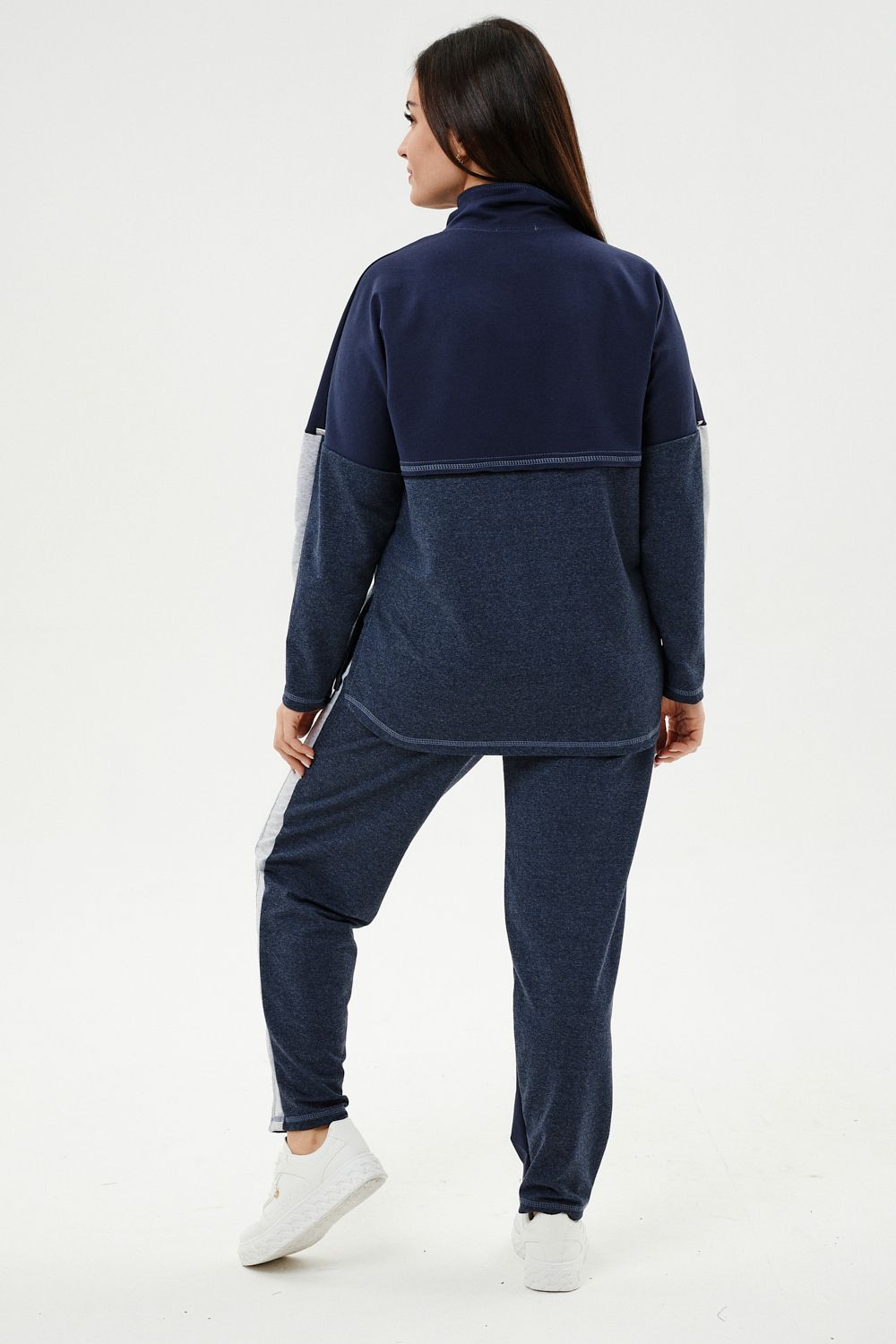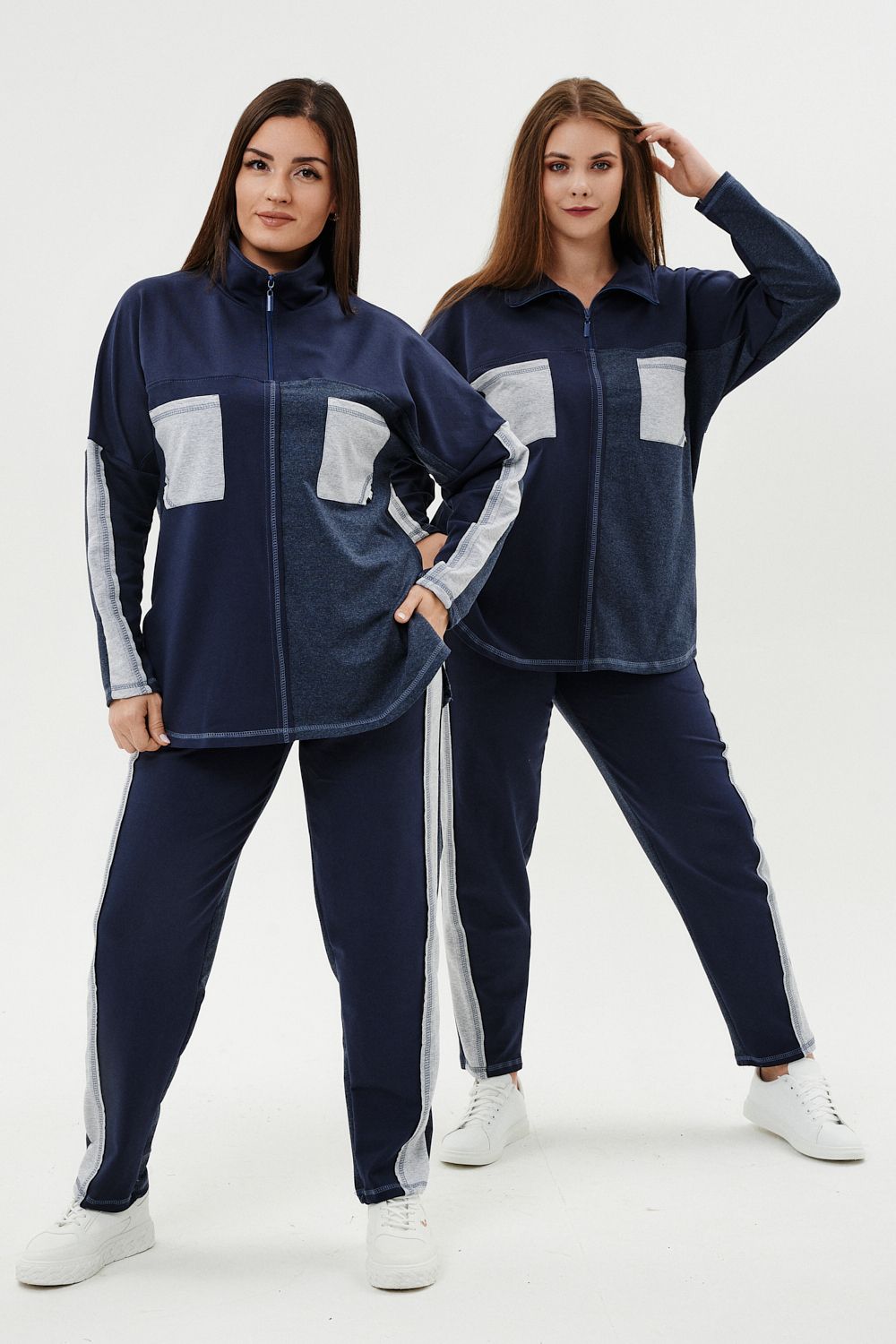 Костюм женский: толстовка и брюки. Толстовка прямого силуэта, брюки свободные по бедрам, зауженные к низу. Рукав цельнокроенный со швом. Воротник-стойка застегивается на тесьму-молнию. Карман "кенгуру". В костюме удачно сочетается однотонный футер с меланжированным. На спинке и полочке кокетки. Нагрудные карманы, лампасы на рукавах и брюках из контрастной отделочной ткани. На передних половинках брюк внутренние карманы.