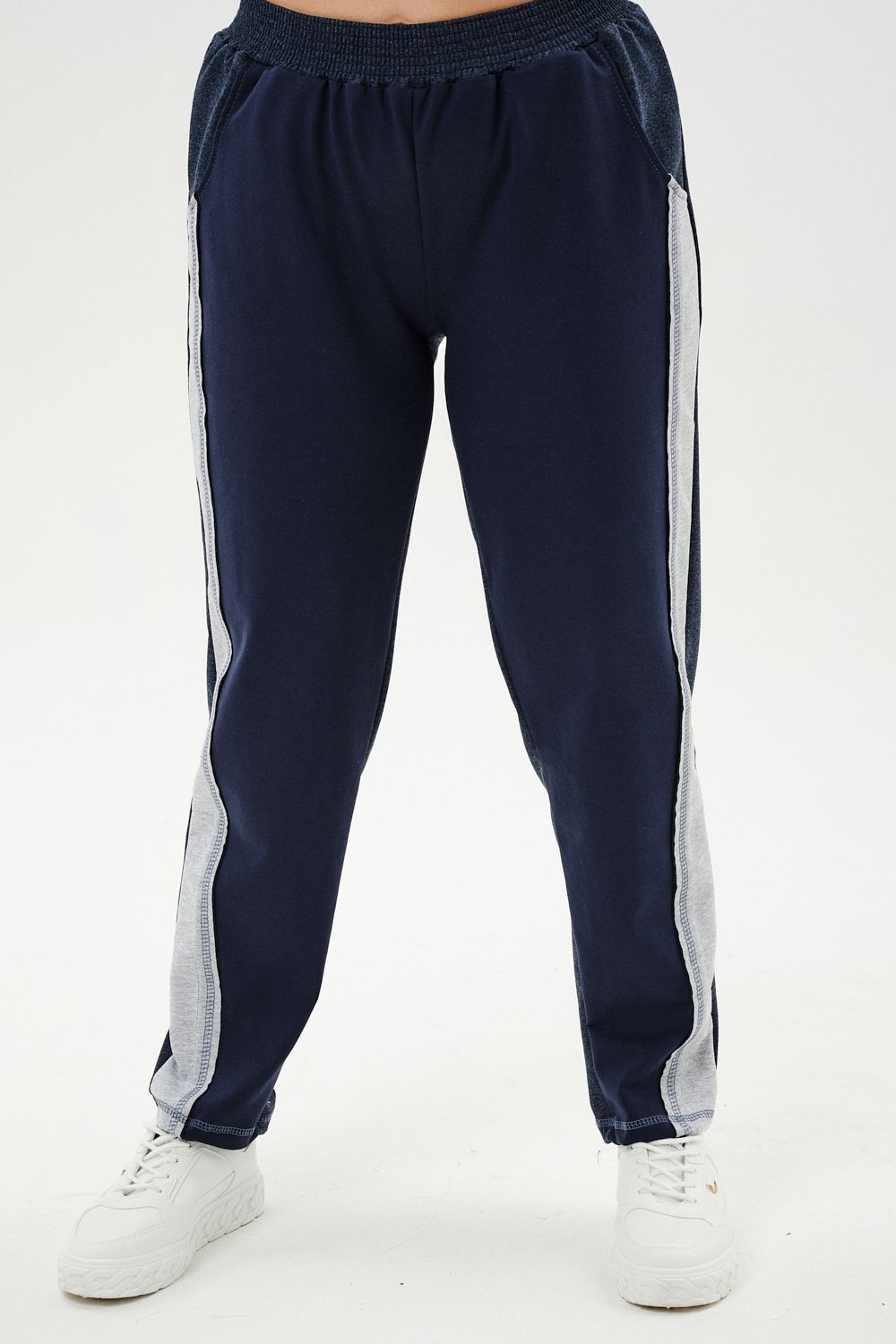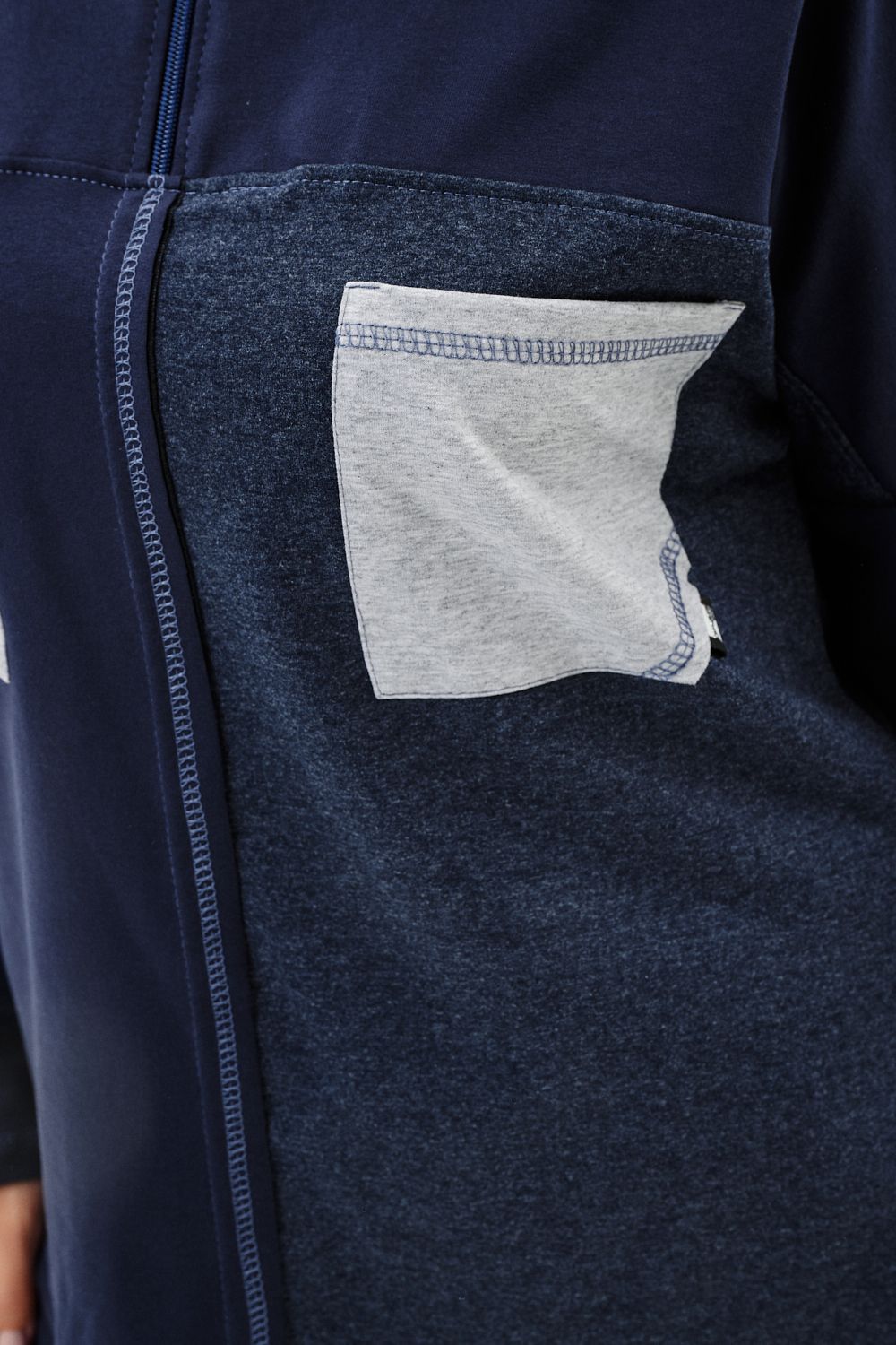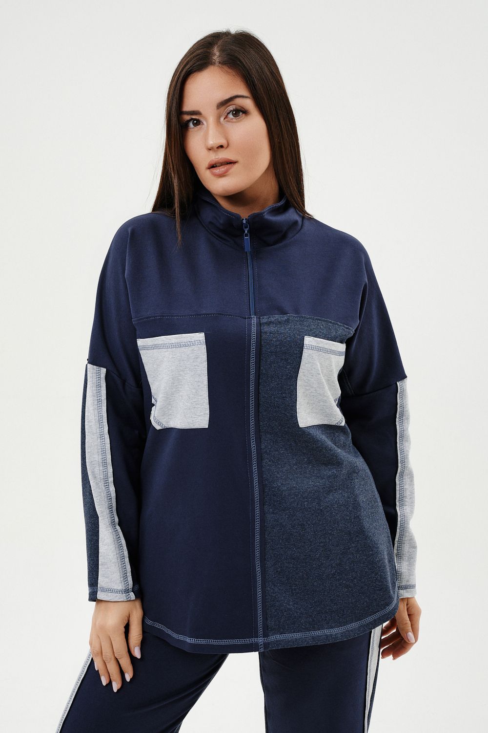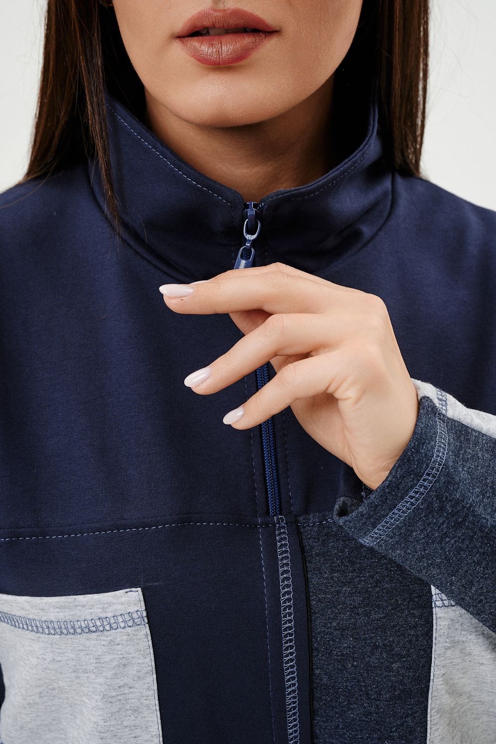 Костюм женский: толстовка и брюки. Толстовка прямого силуэта, брюки свободные по бедрам, зауженные к низу. Рукав цельнокроенный со швом. Воротник-стойка застегивается на тесьму-молнию. Карман "кенгуру". В костюме удачно сочетается однотонный футер с меланжированным. На спинке и полочке кокетки. Нагрудные карманы, лампасы на рукавах и брюках из контрастной отделочной ткани. На передних половинках брюк внутренние карманы.