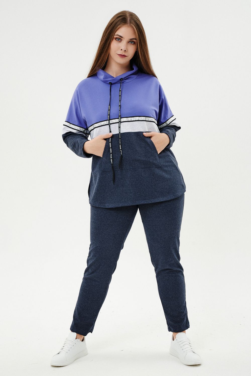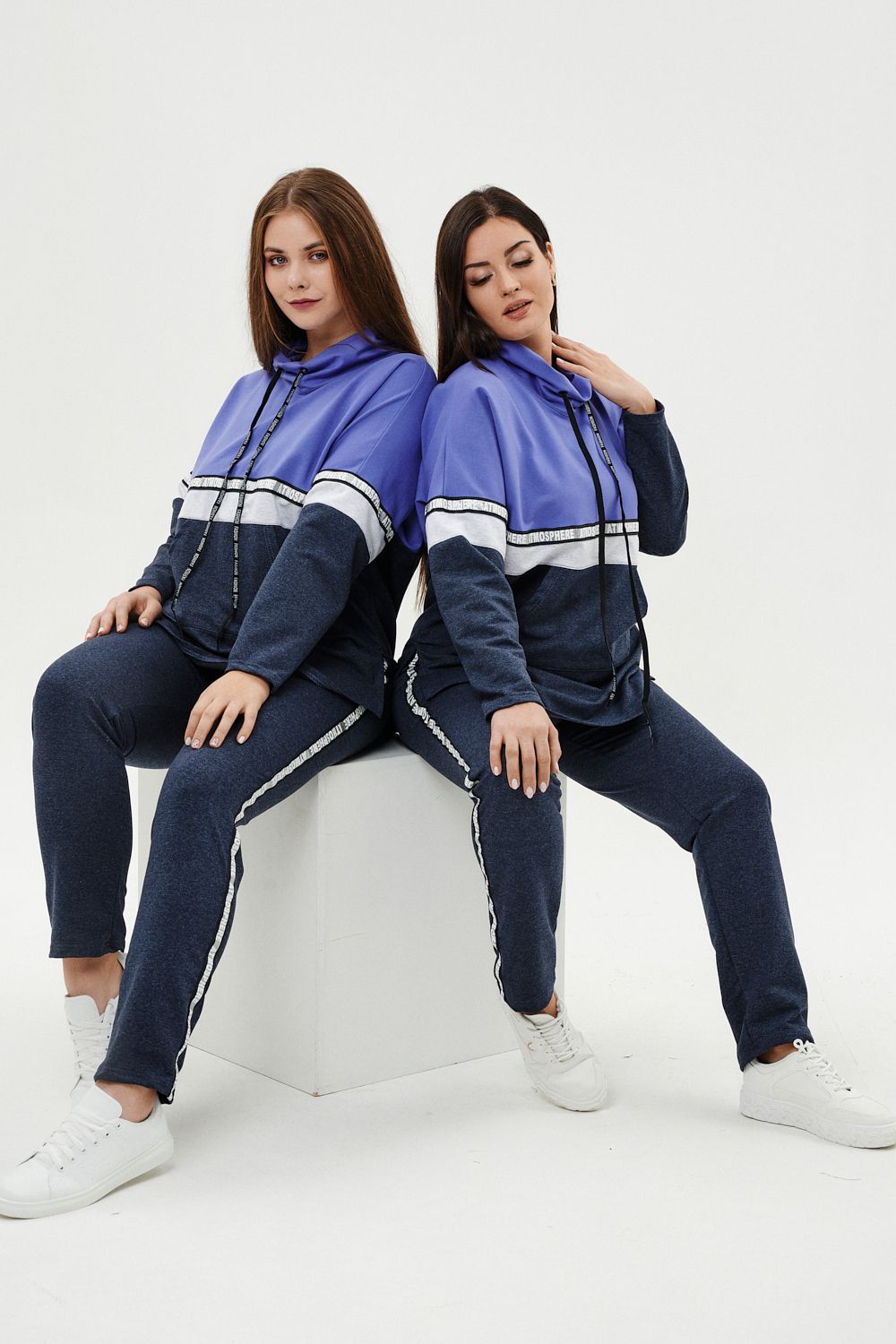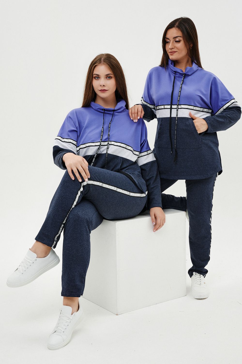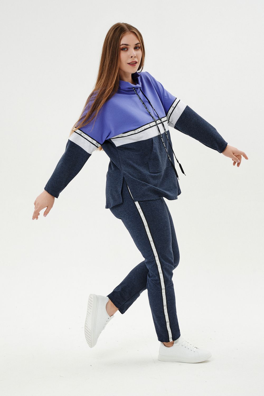Костюм женский: толстовка и брюки. Туника прямого силуэта, брюки облегающие. Воротник стойка - хомут со шнурком. Карман - кенгуру. Верхняя и нижняя часть туники из разных тканей, посередине полочки и рукавов белая отделочная полоса с декоративной тесьмой. Брюки с внутренними карманами и лампасами из декоративной тесьмы.