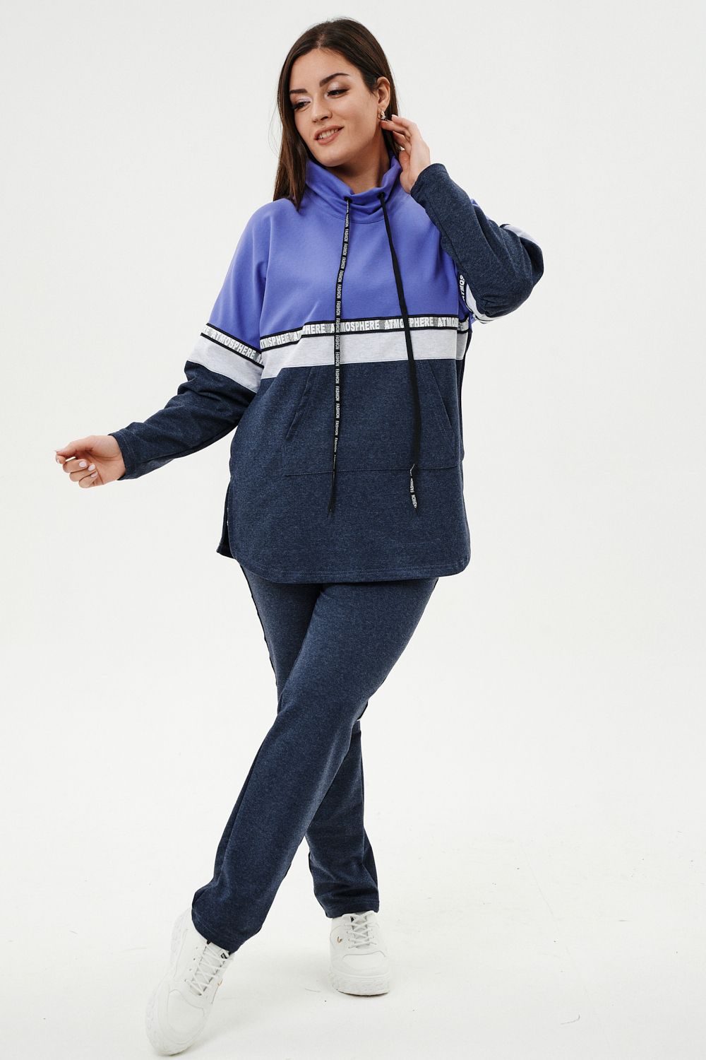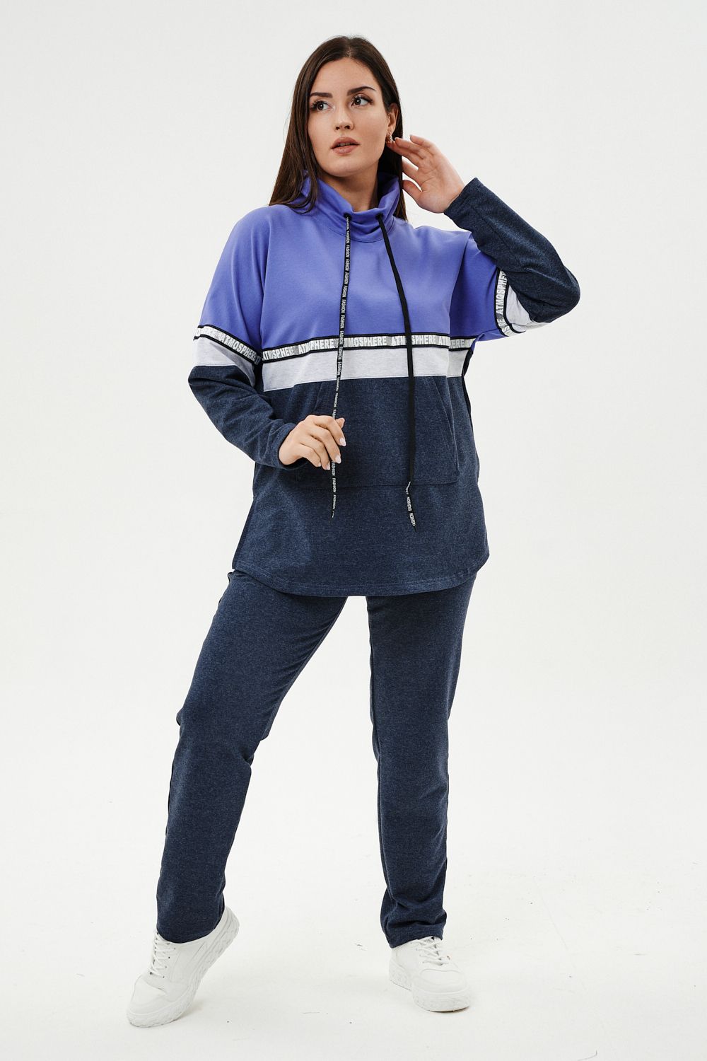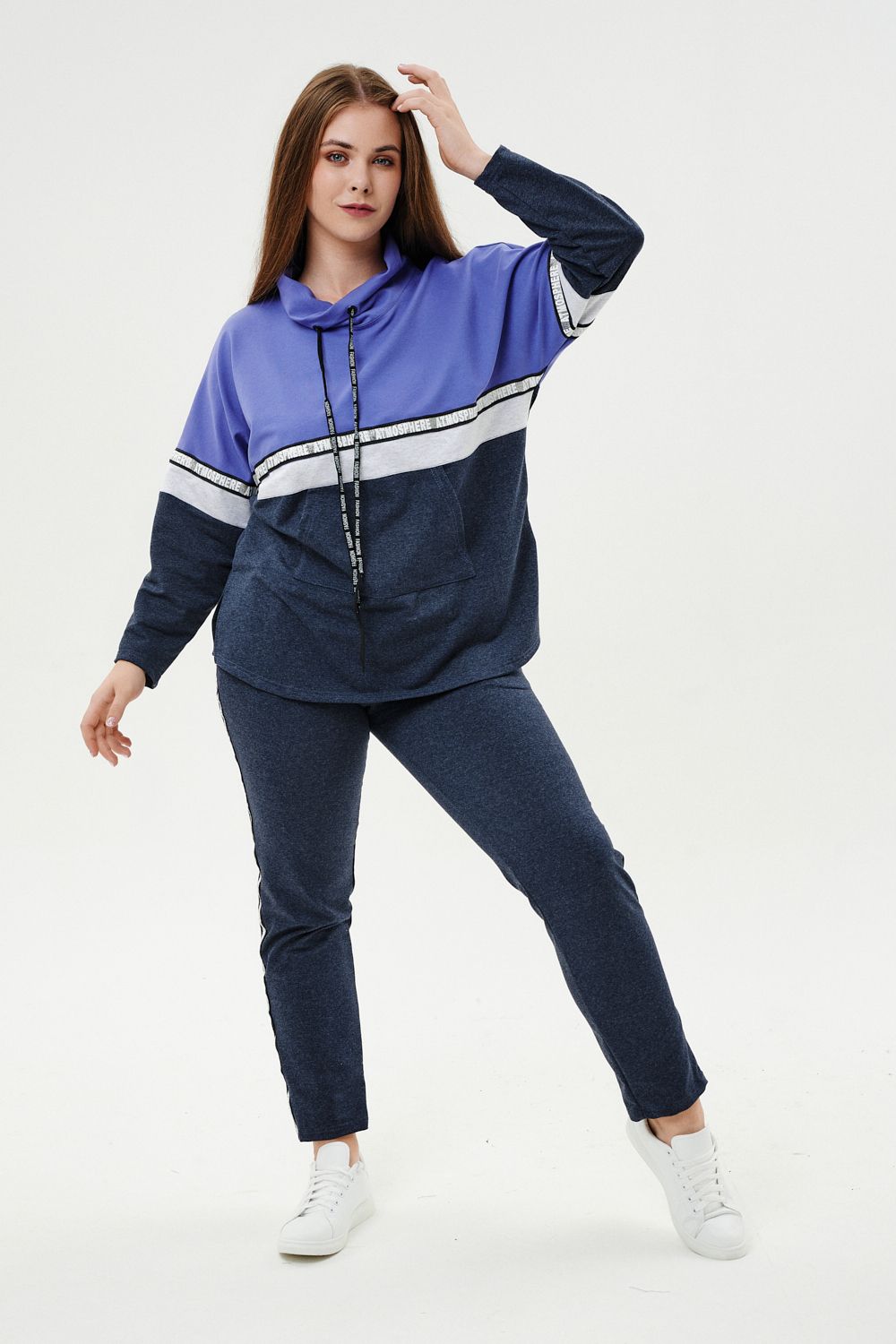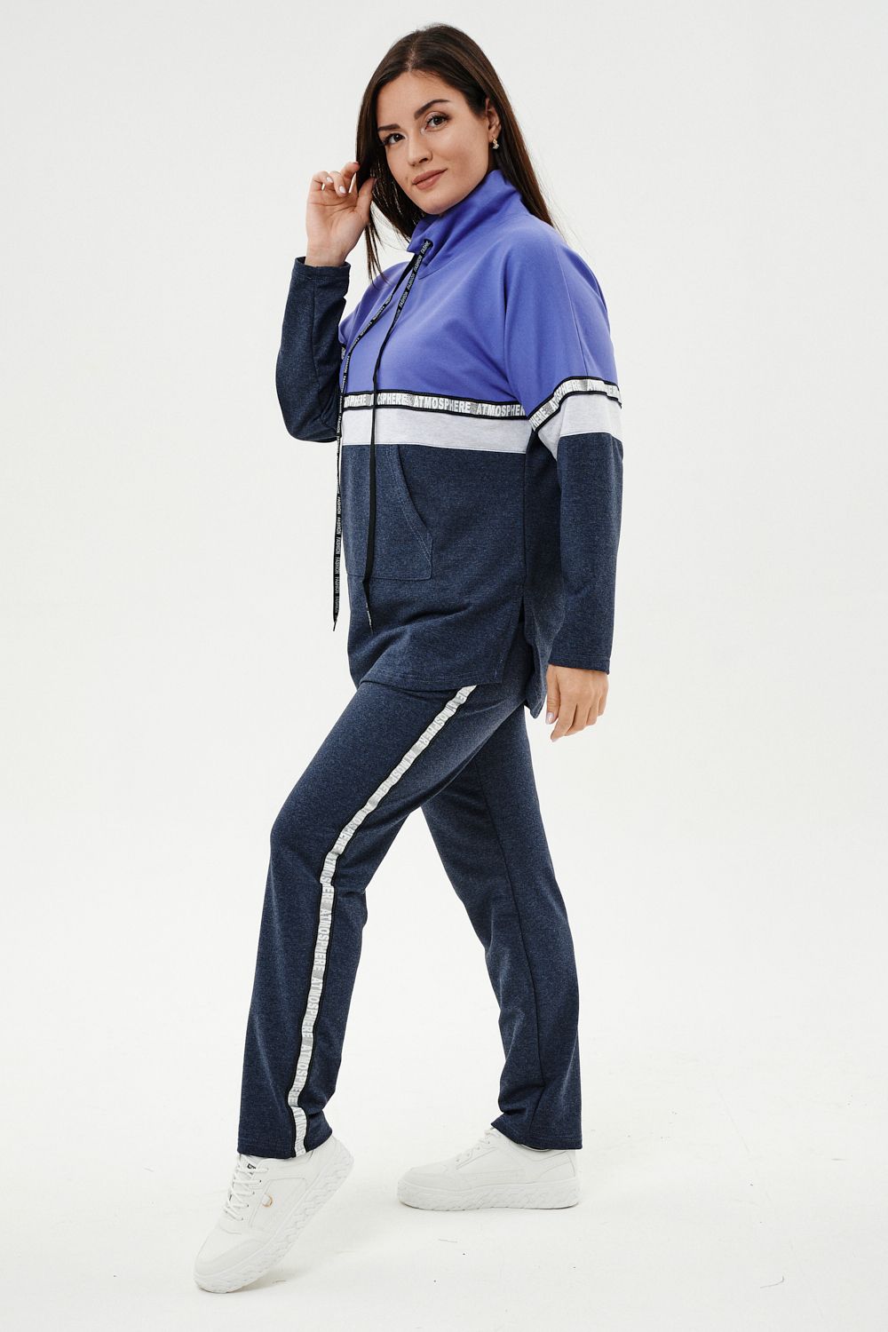 Костюм женский: толстовка и брюки. Туника прямого силуэта, брюки облегающие. Воротник стойка - хомут со шнурком. Карман - кенгуру. Верхняя и нижняя часть туники из разных тканей, посередине полочки и рукавов белая отделочная полоса с декоративной тесьмой. Брюки с внутренними карманами и лампасами из декоративной тесьмы.