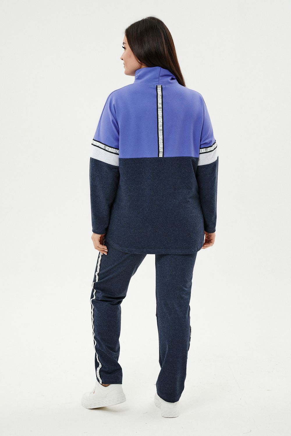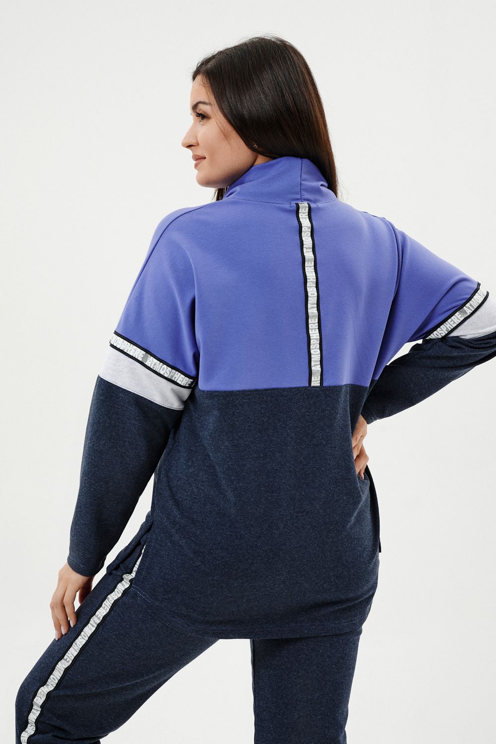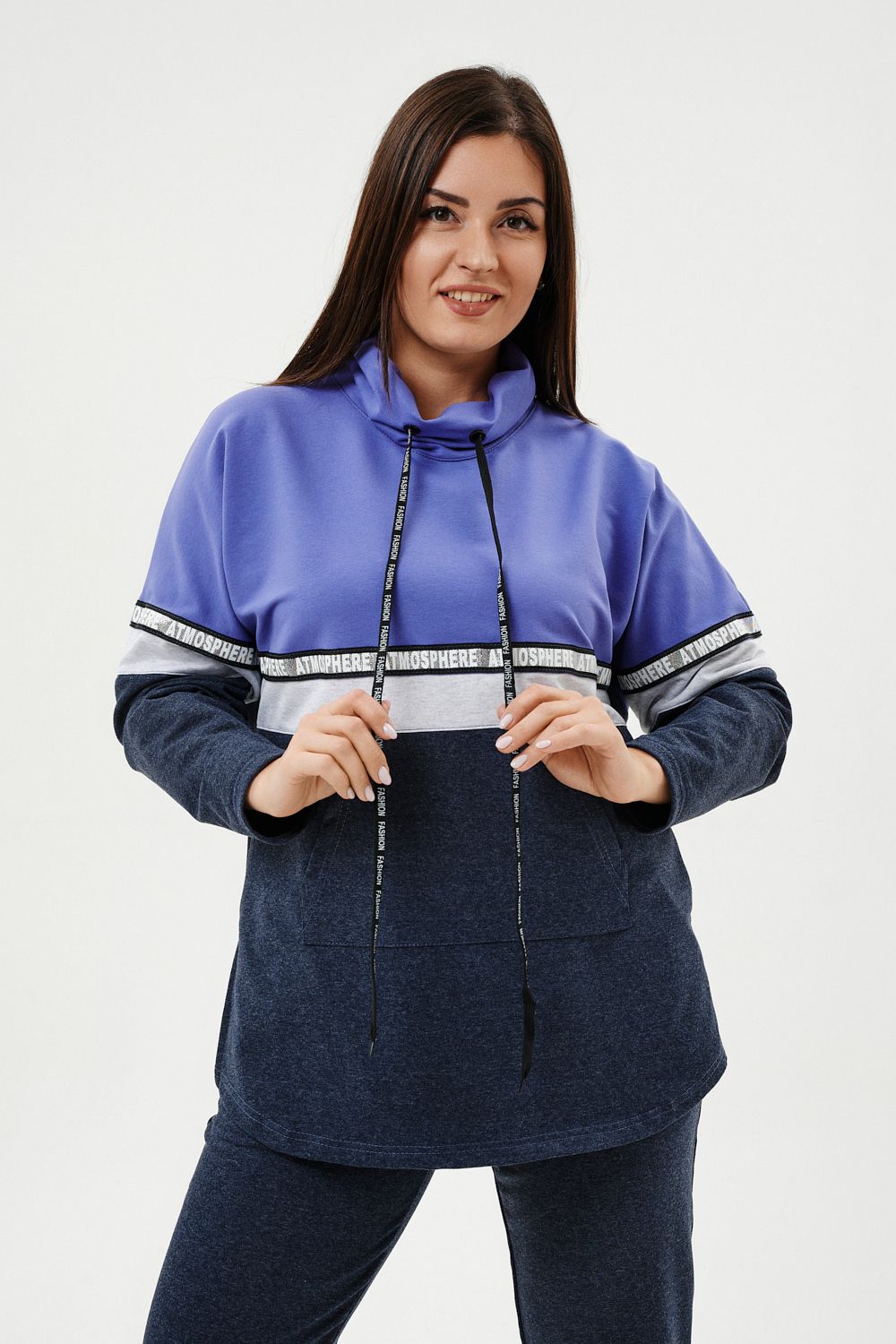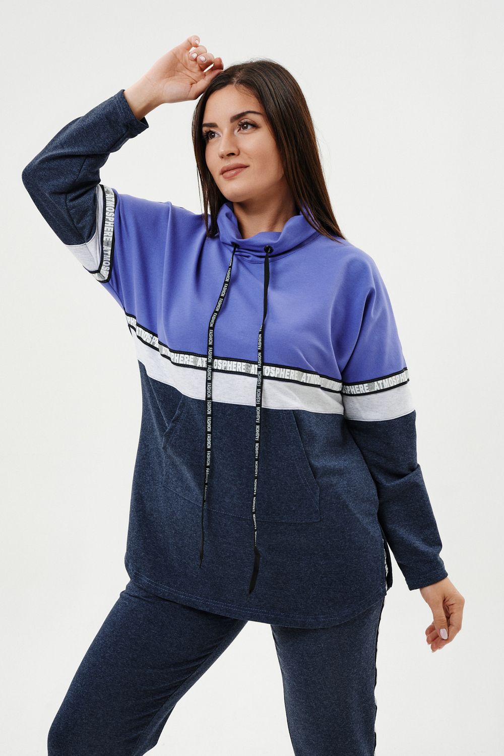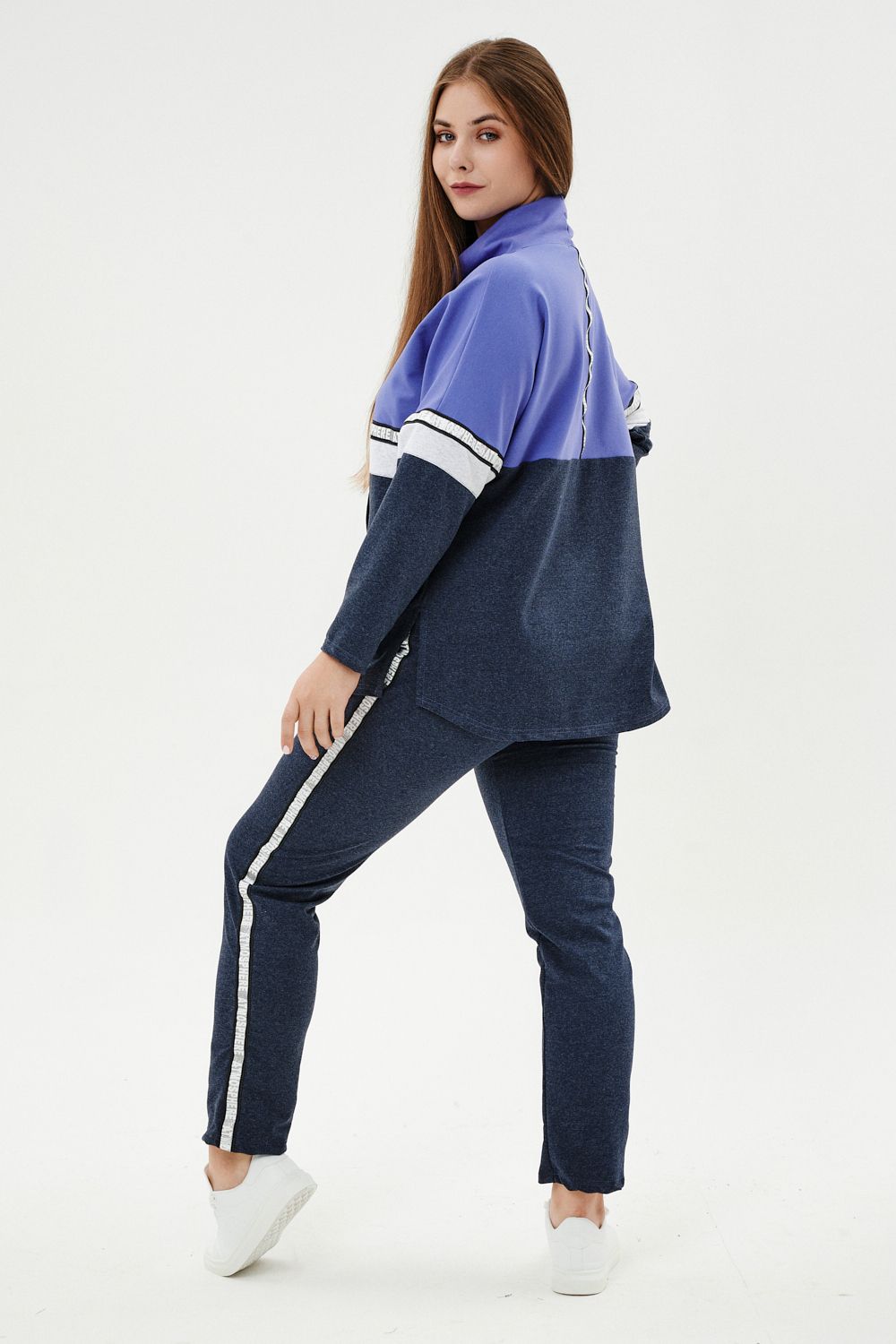 Костюм женский: толстовка и брюки. Туника прямого силуэта, брюки облегающие. Воротник стойка - хомут со шнурком. Карман - кенгуру. Верхняя и нижняя часть туники из разных тканей, посередине полочки и рукавов белая отделочная полоса с декоративной тесьмой. Брюки с внутренними карманами и лампасами из декоративной тесьмы.