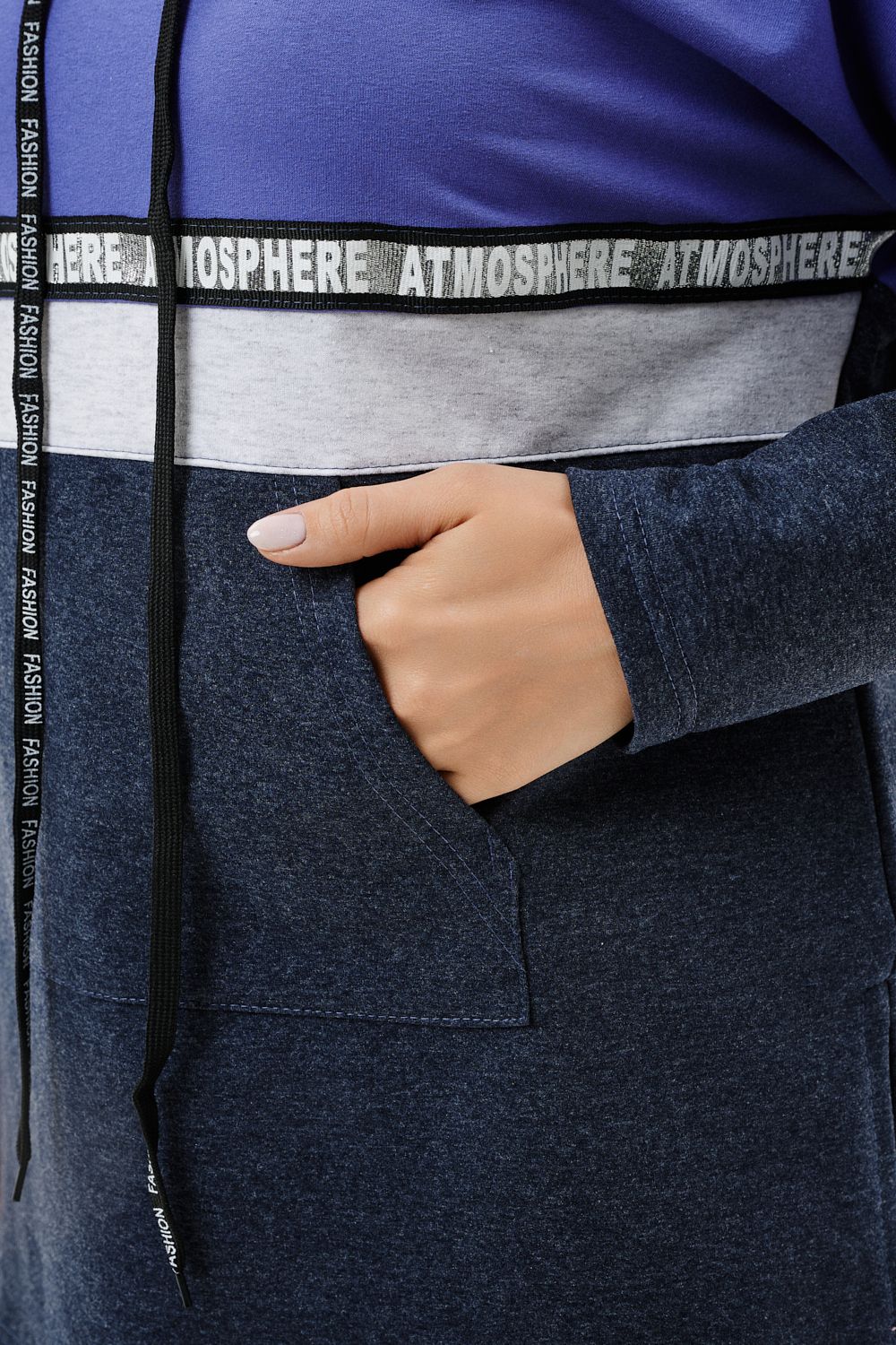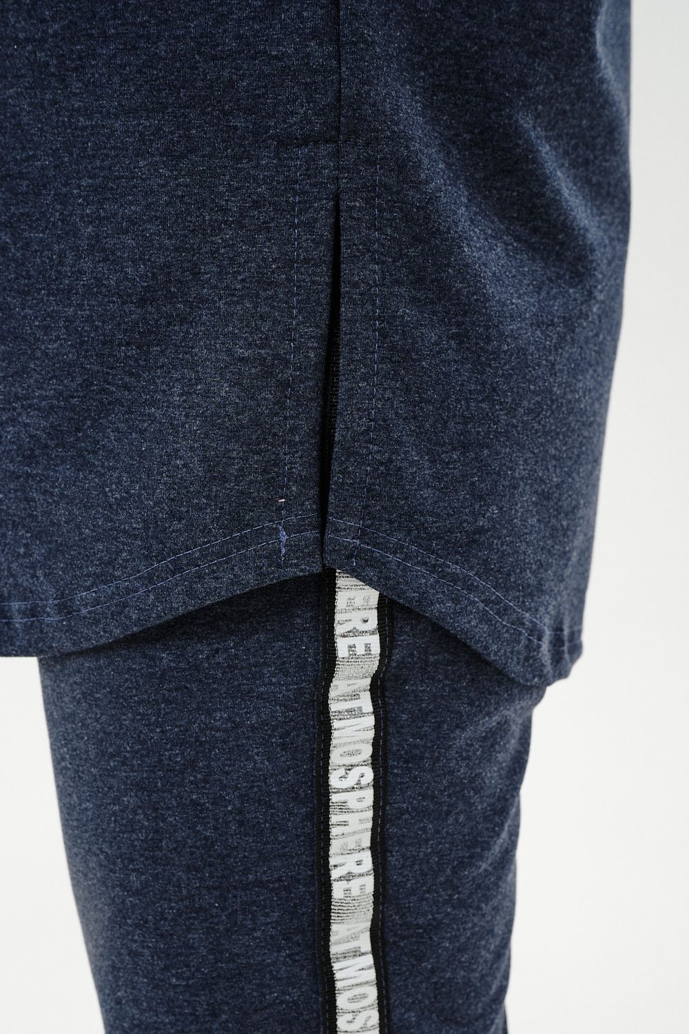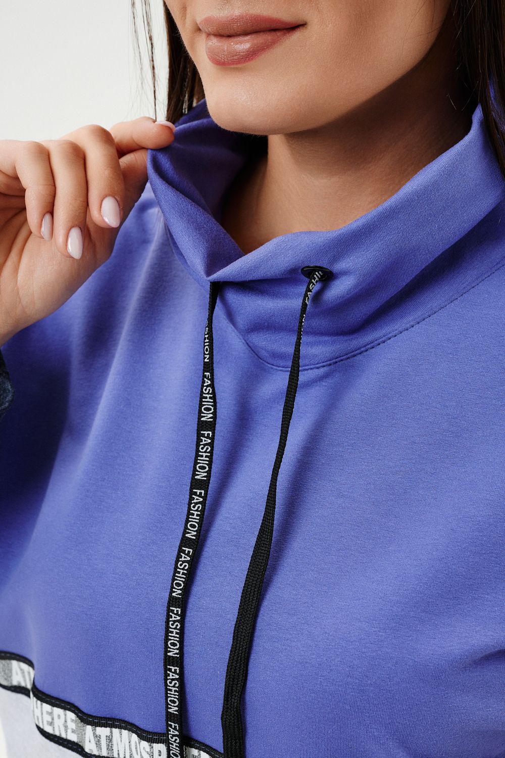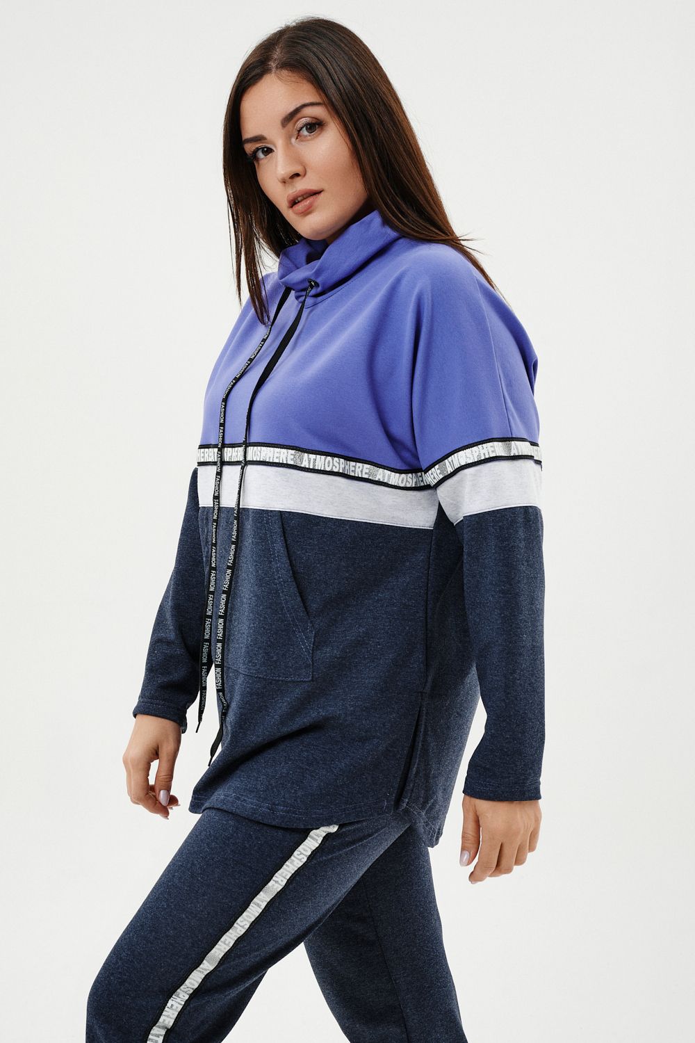 Костюм женский: толстовка и брюки. Туника прямого силуэта, брюки облегающие. Воротник стойка - хомут со шнурком. Карман - кенгуру. Верхняя и нижняя часть туники из разных тканей, посередине полочки и рукавов белая отделочная полоса с декоративной тесьмой. Брюки с внутренними карманами и лампасами из декоративной тесьмы.