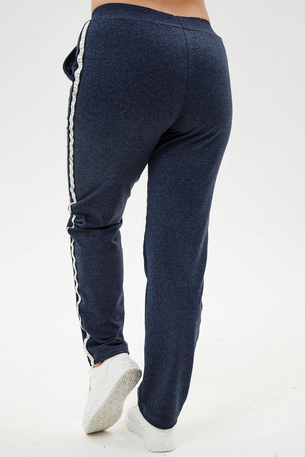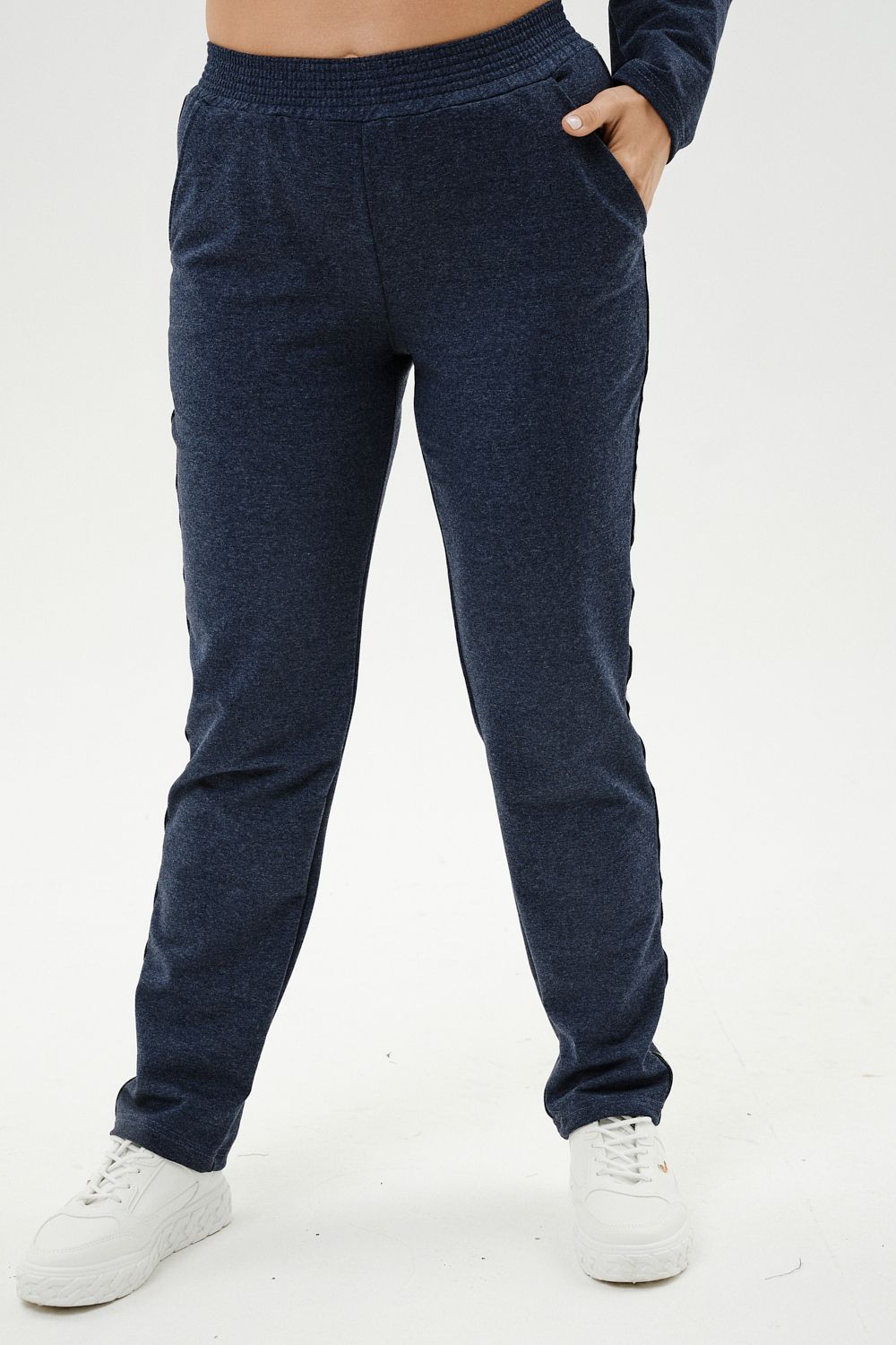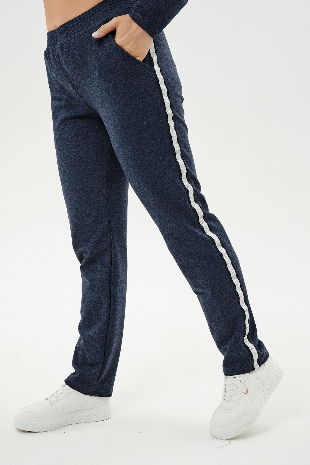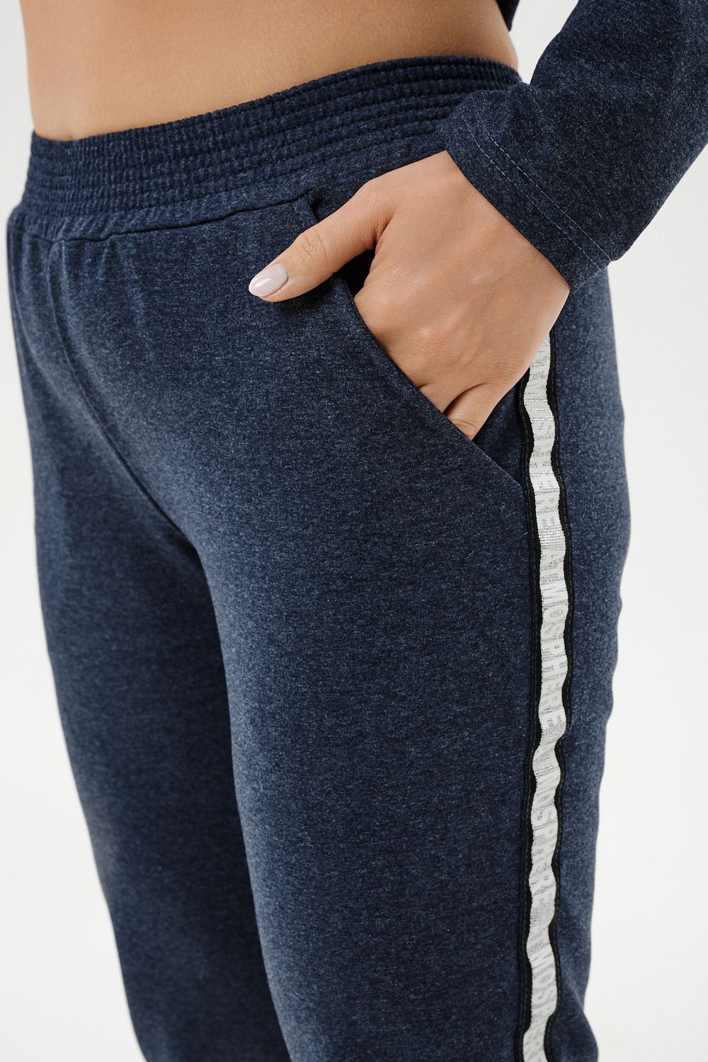 Костюм женский: толстовка и брюки. Туника прямого силуэта, брюки облегающие. Воротник стойка - хомут со шнурком. Карман - кенгуру. Верхняя и нижняя часть туники из разных тканей, посередине полочки и рукавов белая отделочная полоса с декоративной тесьмой. Брюки с внутренними карманами и лампасами из декоративной тесьмы.