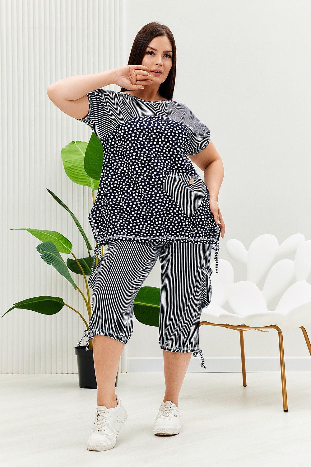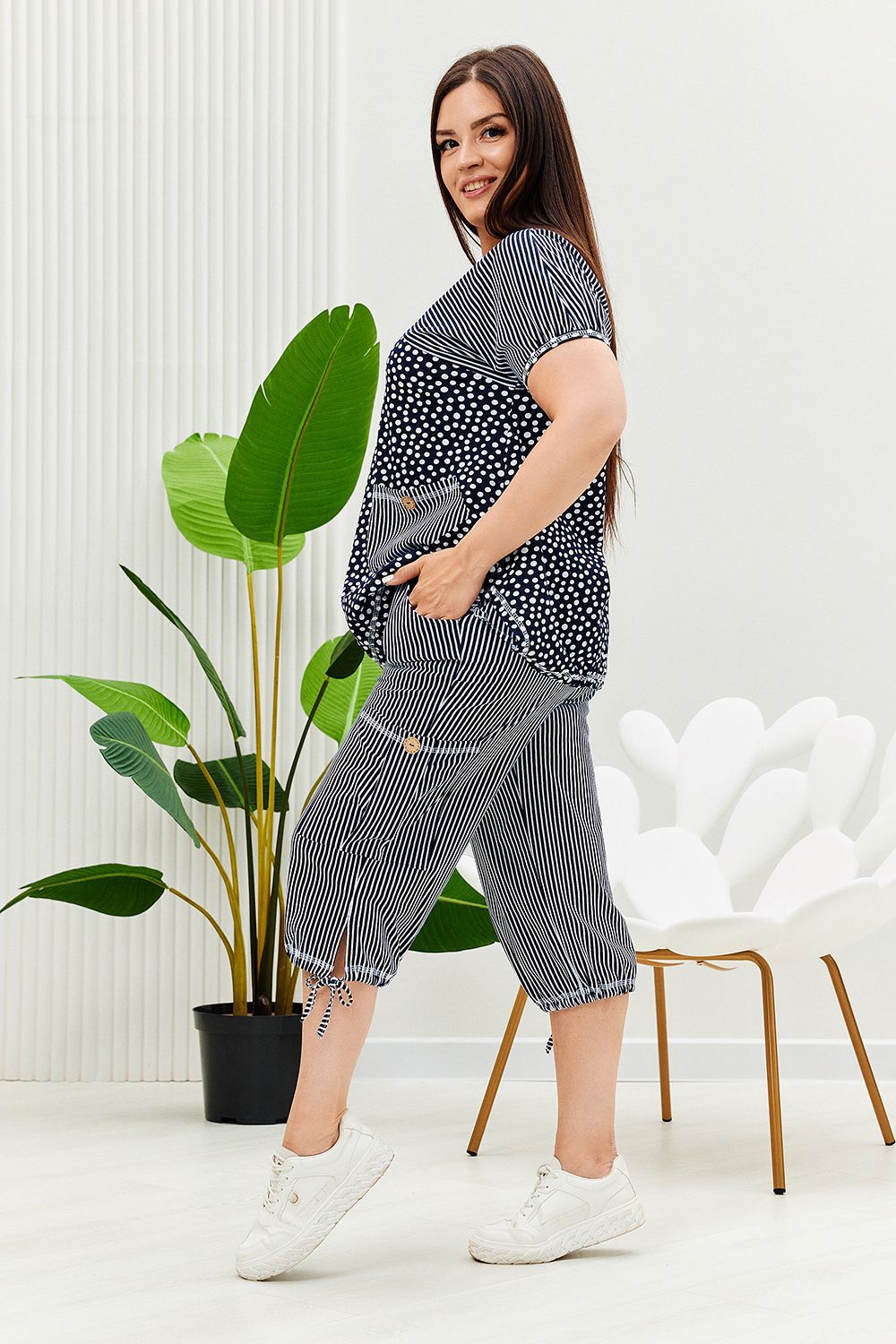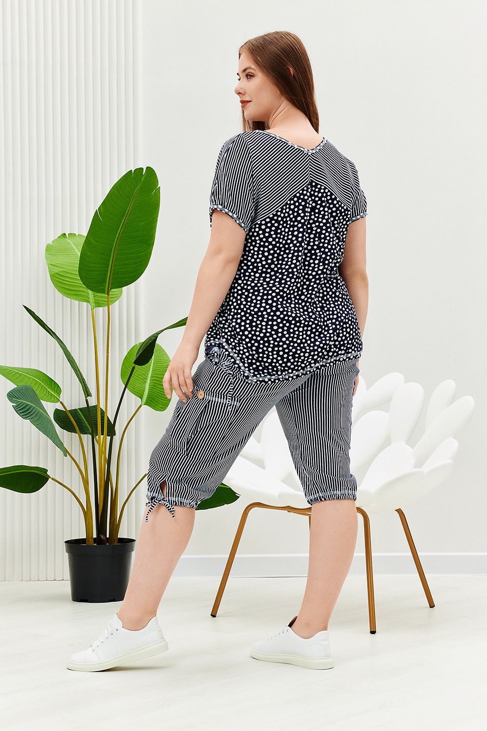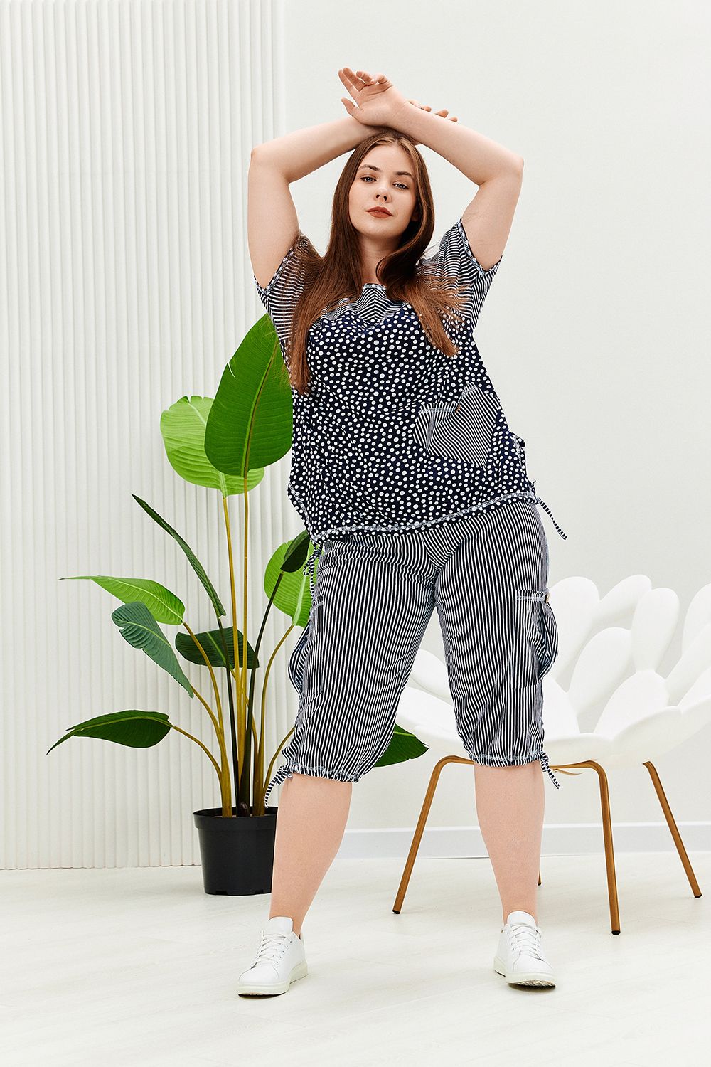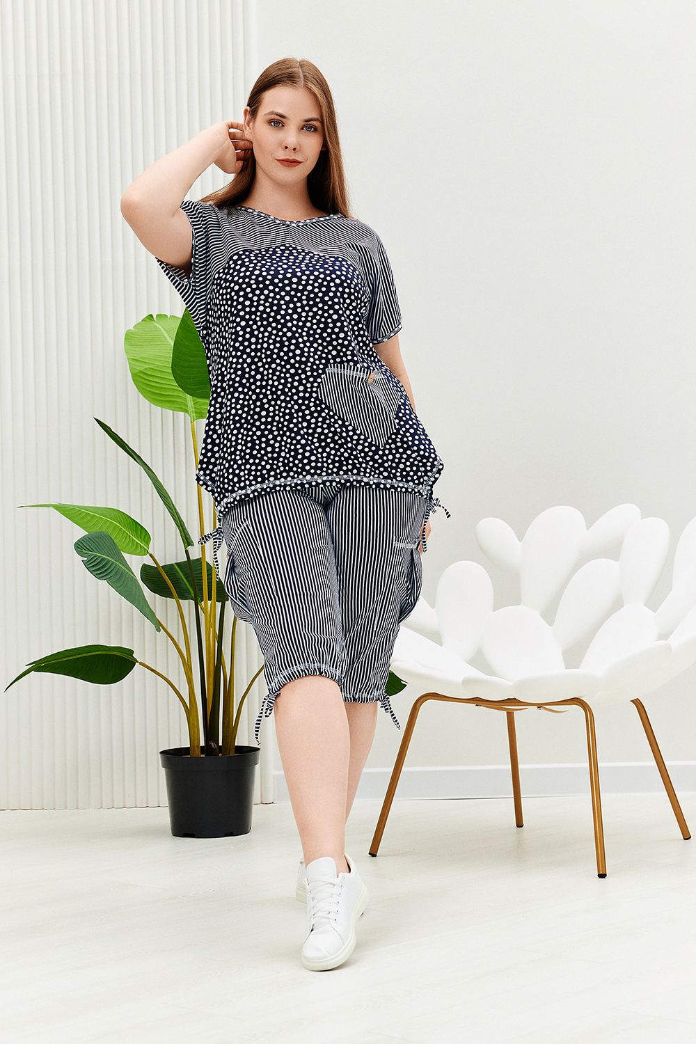 Костюм женский, туника и бриджи. Туника расширенная к низу с боковыми разрезами, низ фиксируется завязками. Горловина Y-образная, рукав короткий цельнокроенный, около плечевого шва небольшая сборка. Кокетка полочки и спинки из двух частей в полоску, соединяющихся под наклоном. На полочке накладной фигурный карман. Бриджи прямого силуэта, внизу брюк разрезы и утяжки. На передних частях внутренние карманы и боковые с бантовой складкой. Пояс выполнен на многоигольной машине.