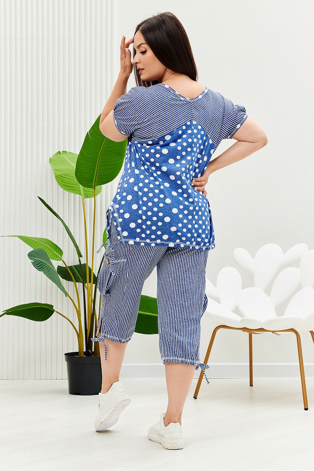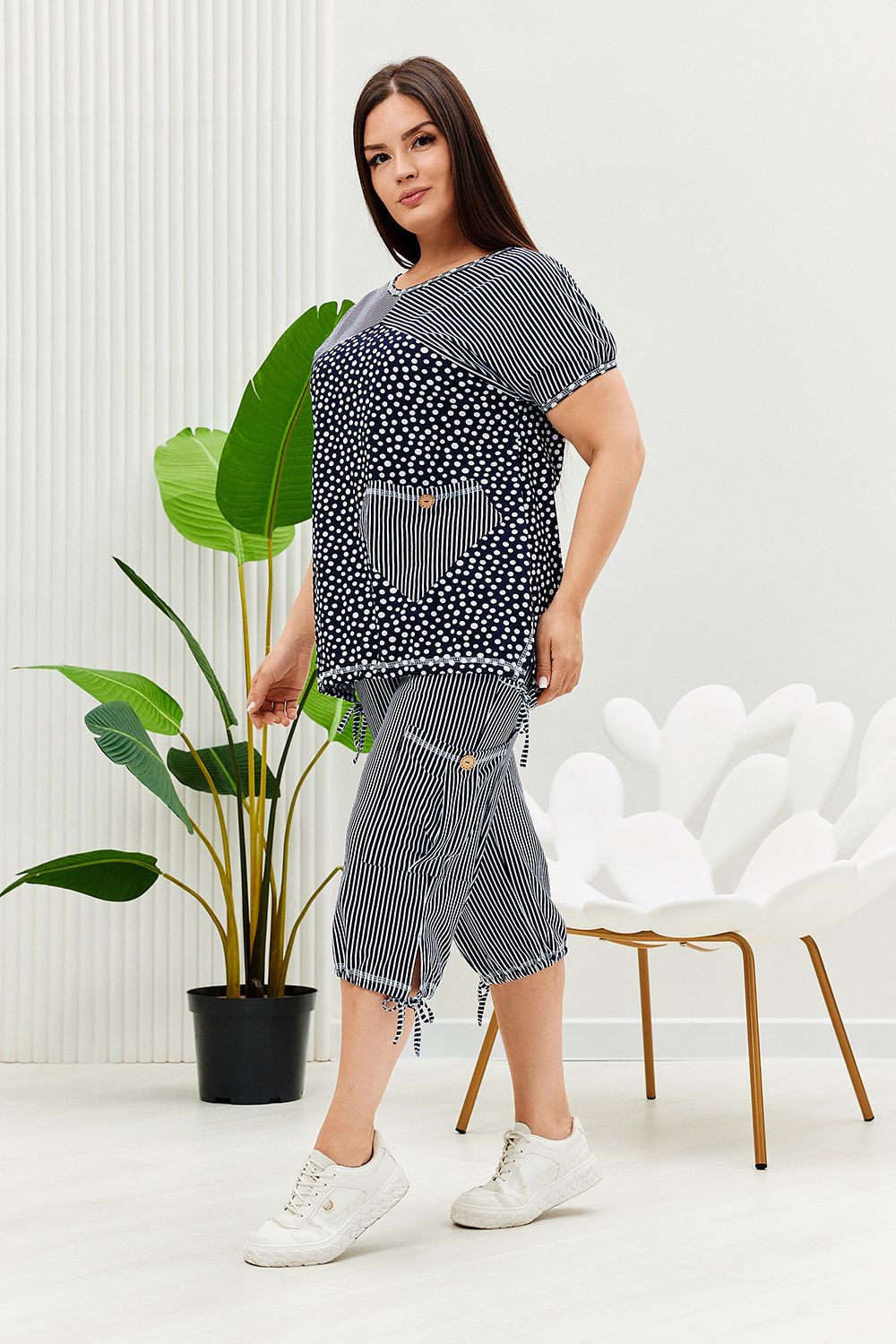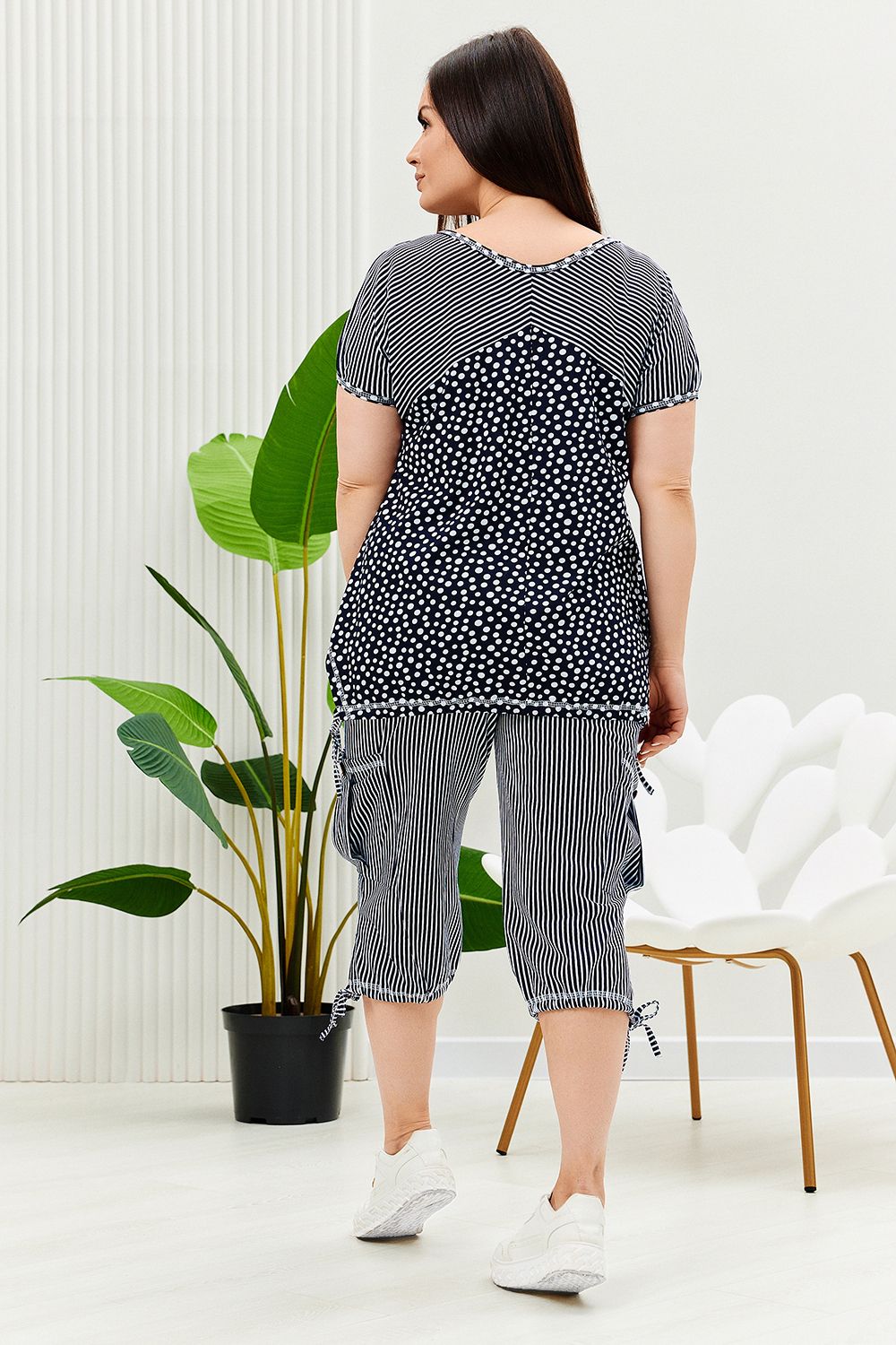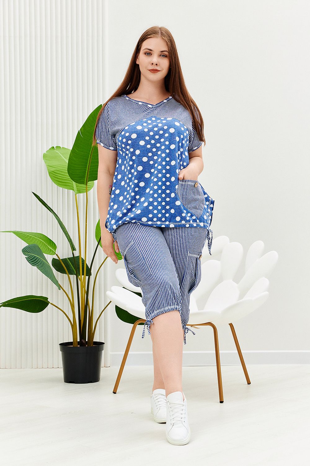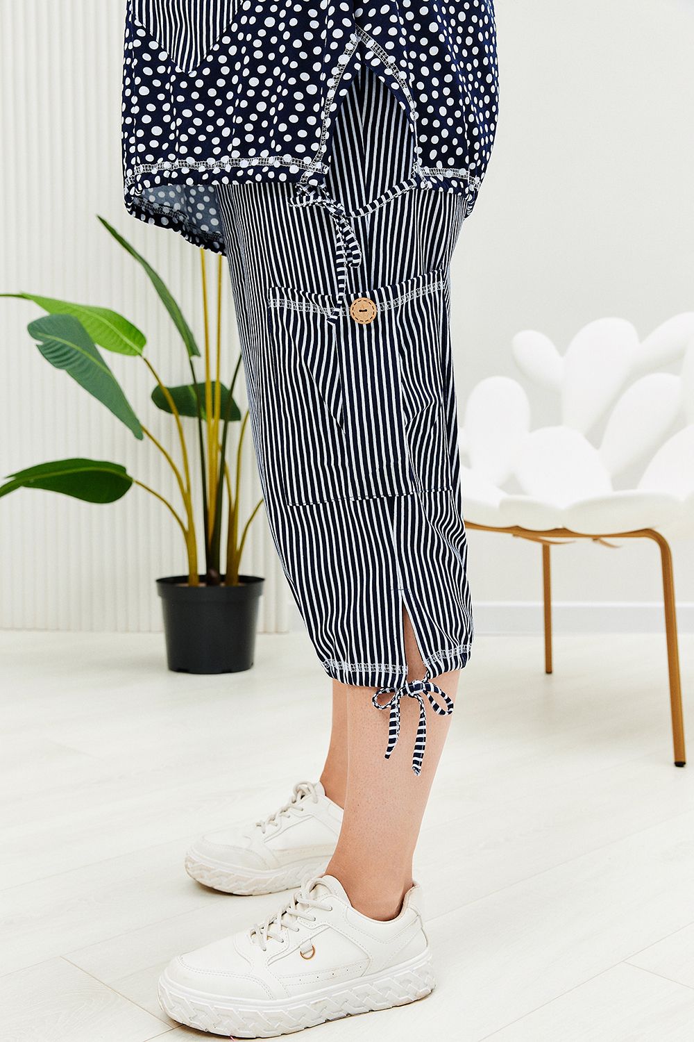 Костюм женский, туника и бриджи. Туника расширенная к низу с боковыми разрезами, низ фиксируется завязками. Горловина Y-образная, рукав короткий цельнокроенный, около плечевого шва небольшая сборка. Кокетка полочки и спинки из двух частей в полоску, соединяющихся под наклоном. На полочке накладной фигурный карман. Бриджи прямого силуэта, внизу брюк разрезы и утяжки. На передних частях внутренние карманы и боковые с бантовой складкой. Пояс выполнен на многоигольной машине.