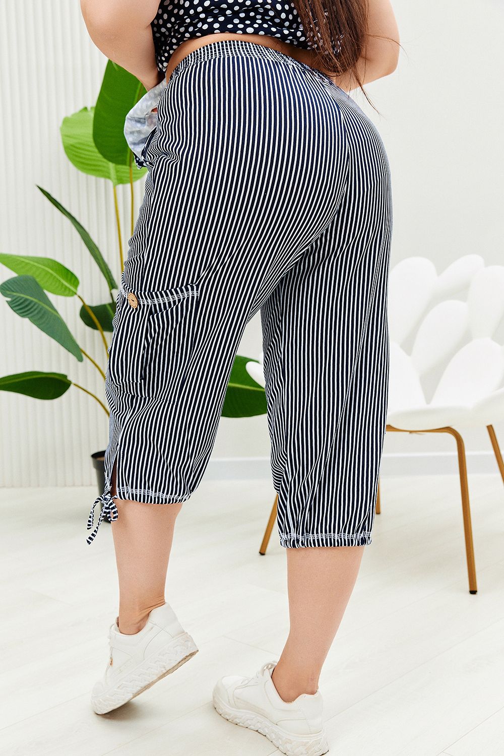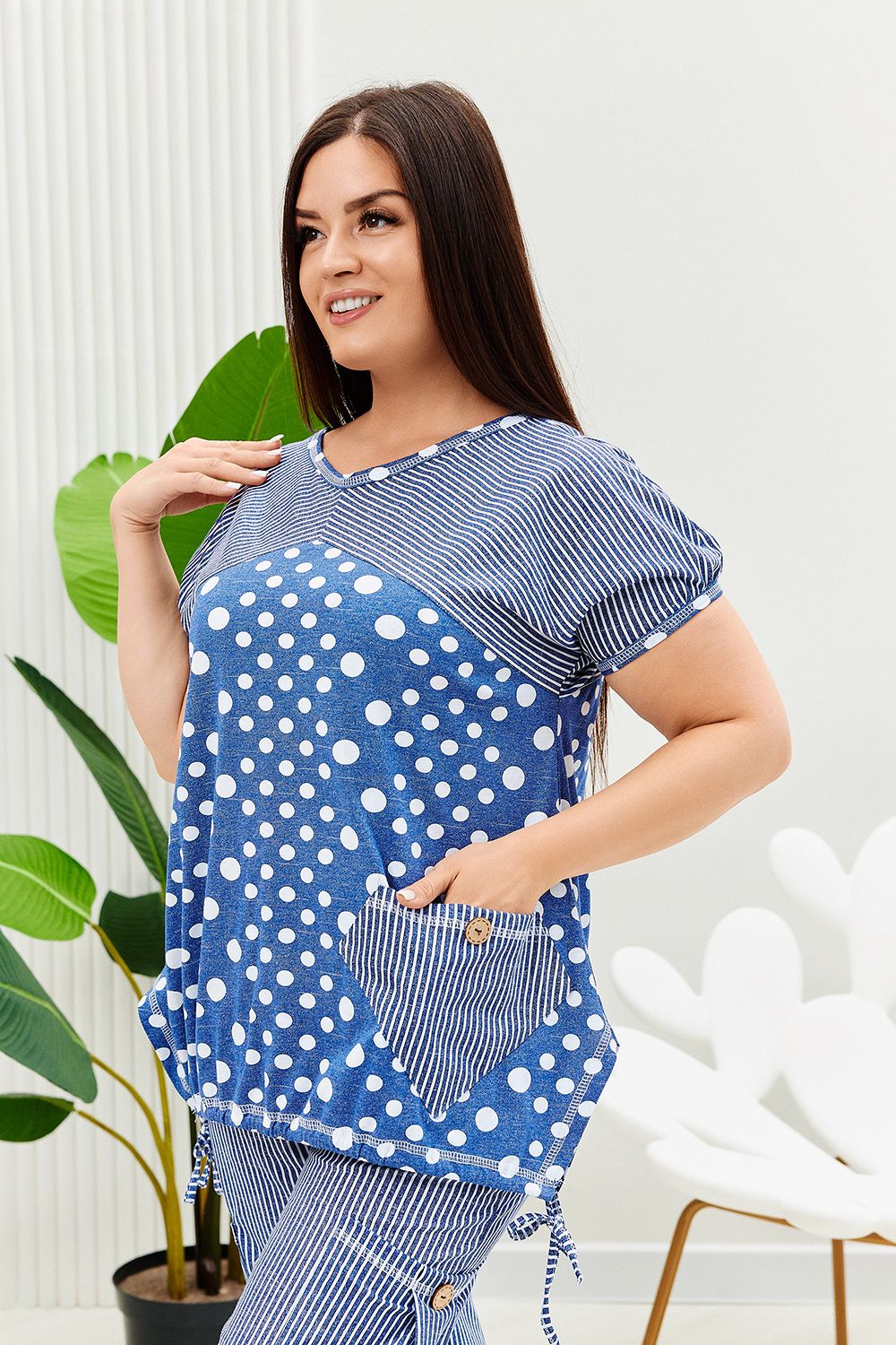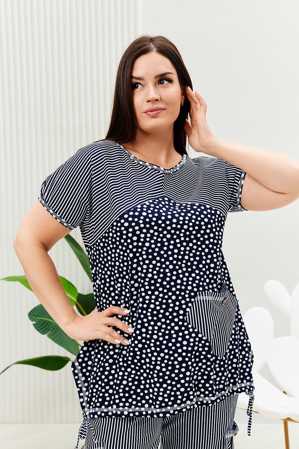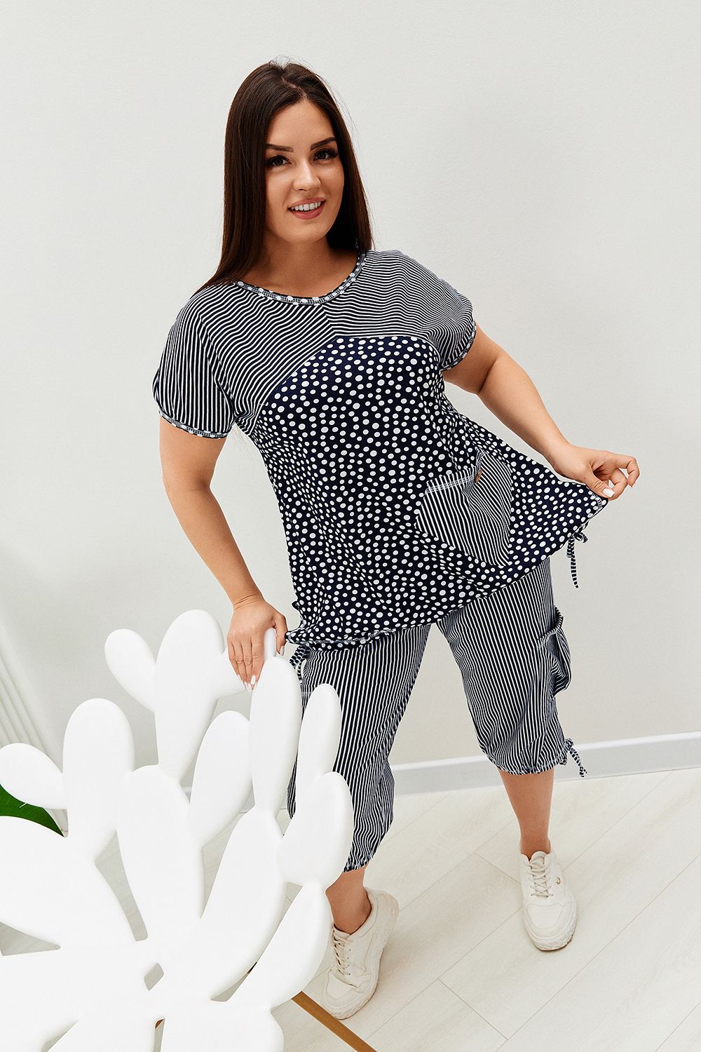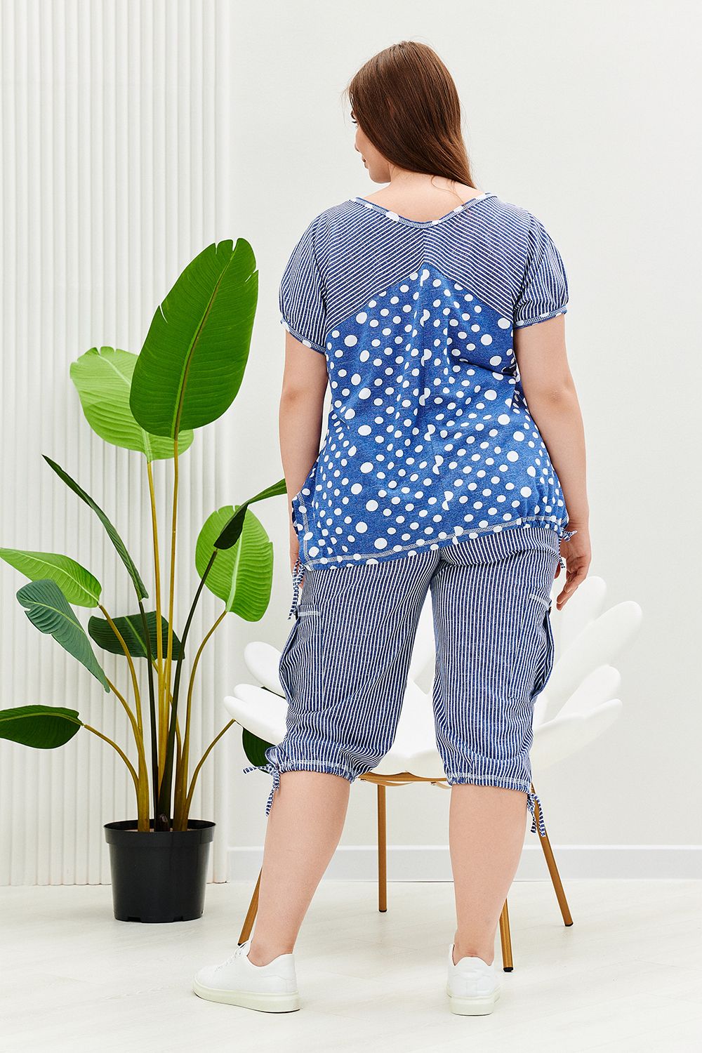 Костюм женский, туника и бриджи. Туника расширенная к низу с боковыми разрезами, низ фиксируется завязками. Горловина Y-образная, рукав короткий цельнокроенный, около плечевого шва небольшая сборка. Кокетка полочки и спинки из двух частей в полоску, соединяющихся под наклоном. На полочке накладной фигурный карман. Бриджи прямого силуэта, внизу брюк разрезы и утяжки. На передних частях внутренние карманы и боковые с бантовой складкой. Пояс выполнен на многоигольной машине.