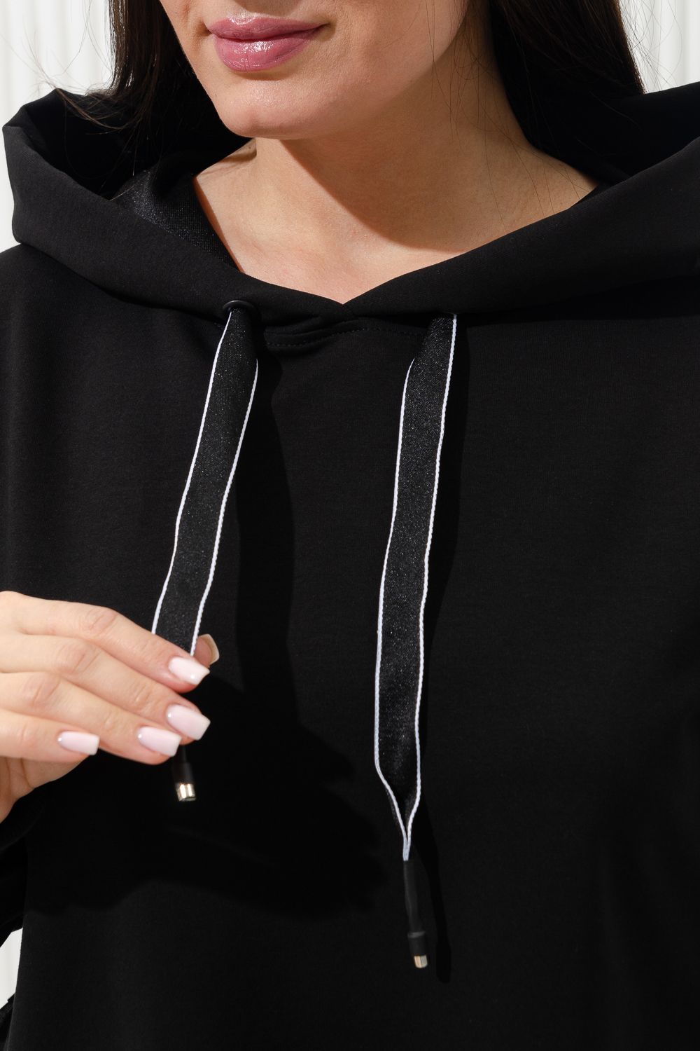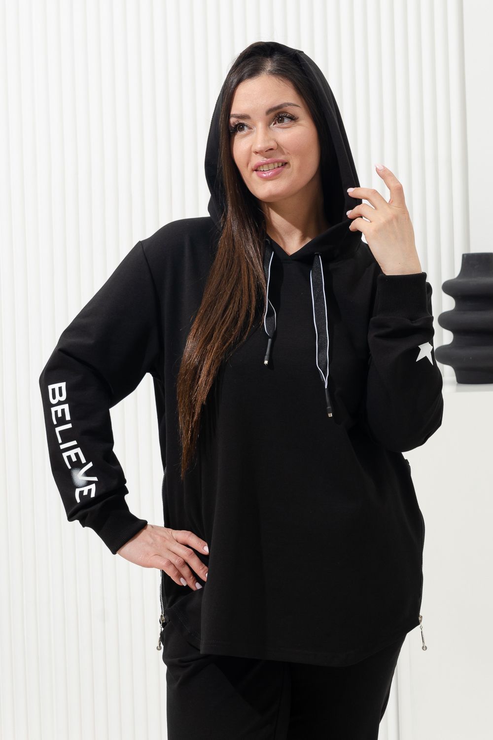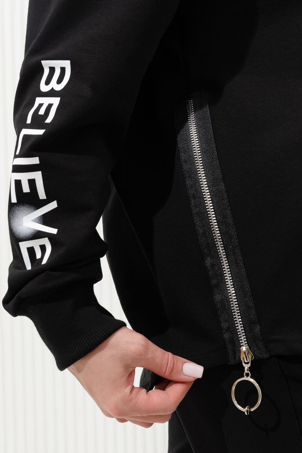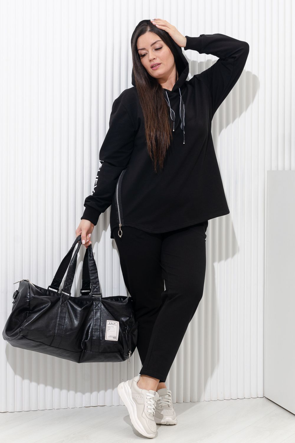 Костюм женский: толстовка и брюки. Брюки женские, свободные по бедрам, зауженные к низу. На передних частях брюк внутренние карманы. На задних частях брюк фигурные рельефы, переходящие в боковой шов. Толстовка прямого силуэта с капюшоном. Рукав спущенный. Низ толстовки фигурный, сбоку стильные молнии, при расстегивании образуют разрезы. На рукавах модный принт.