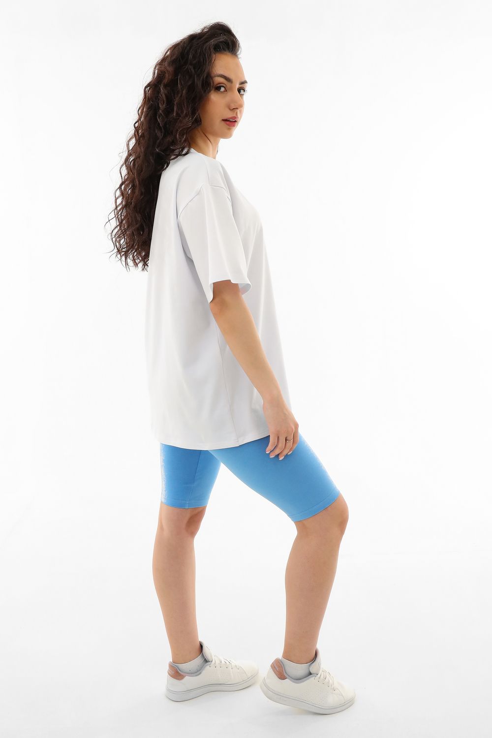 Спортивный костюм женский выполнен в белом цвете с голубыми акцентами, что придает ему неповторимый и свежий вид.