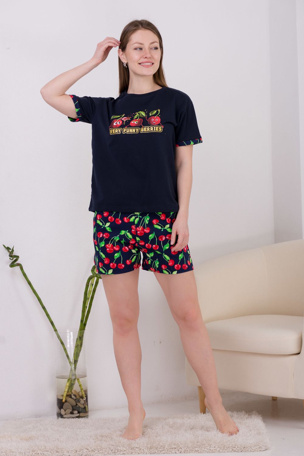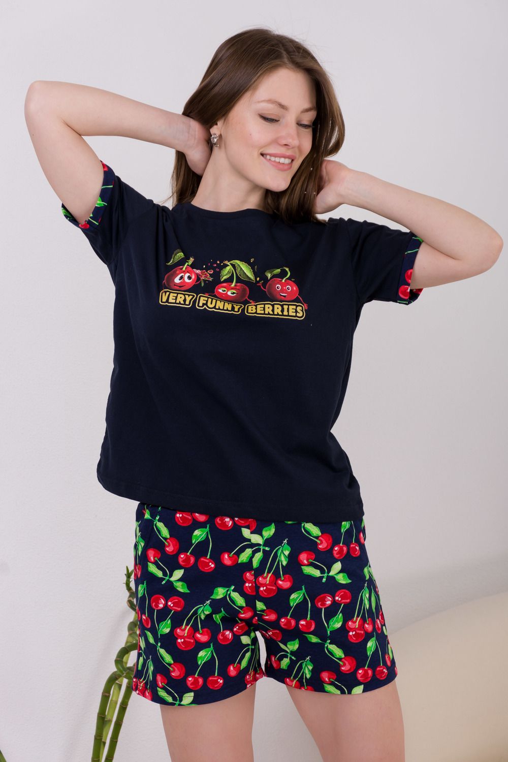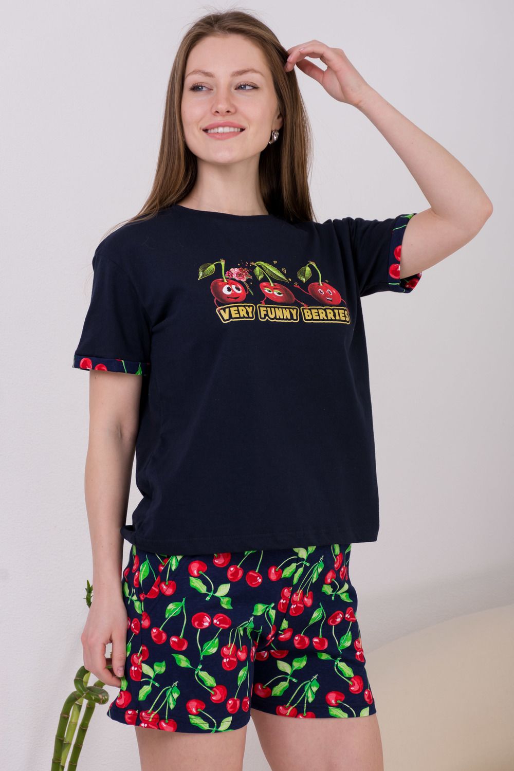 Костюм, состоящий из футболки и шорт с боковыми карманами. На рукавах манжеты с отворотами. Принт с вишенками делает изделие оригинальным. Костюм незаменим на отдыхе и дома.