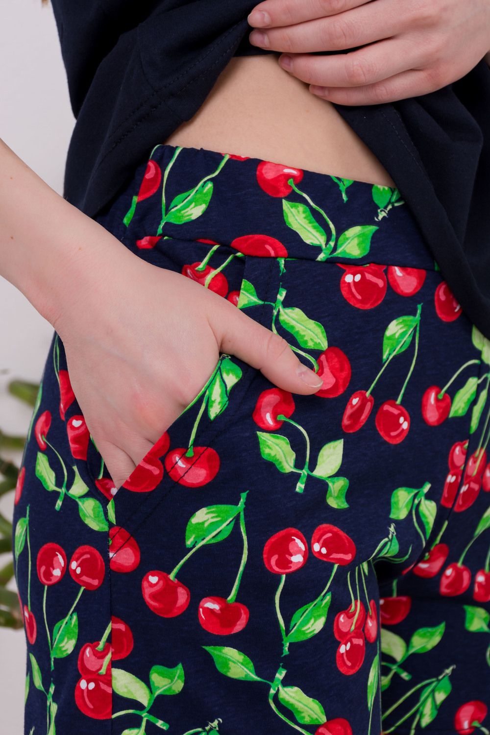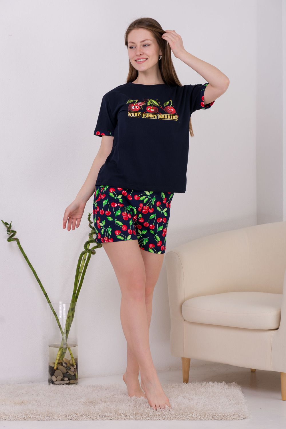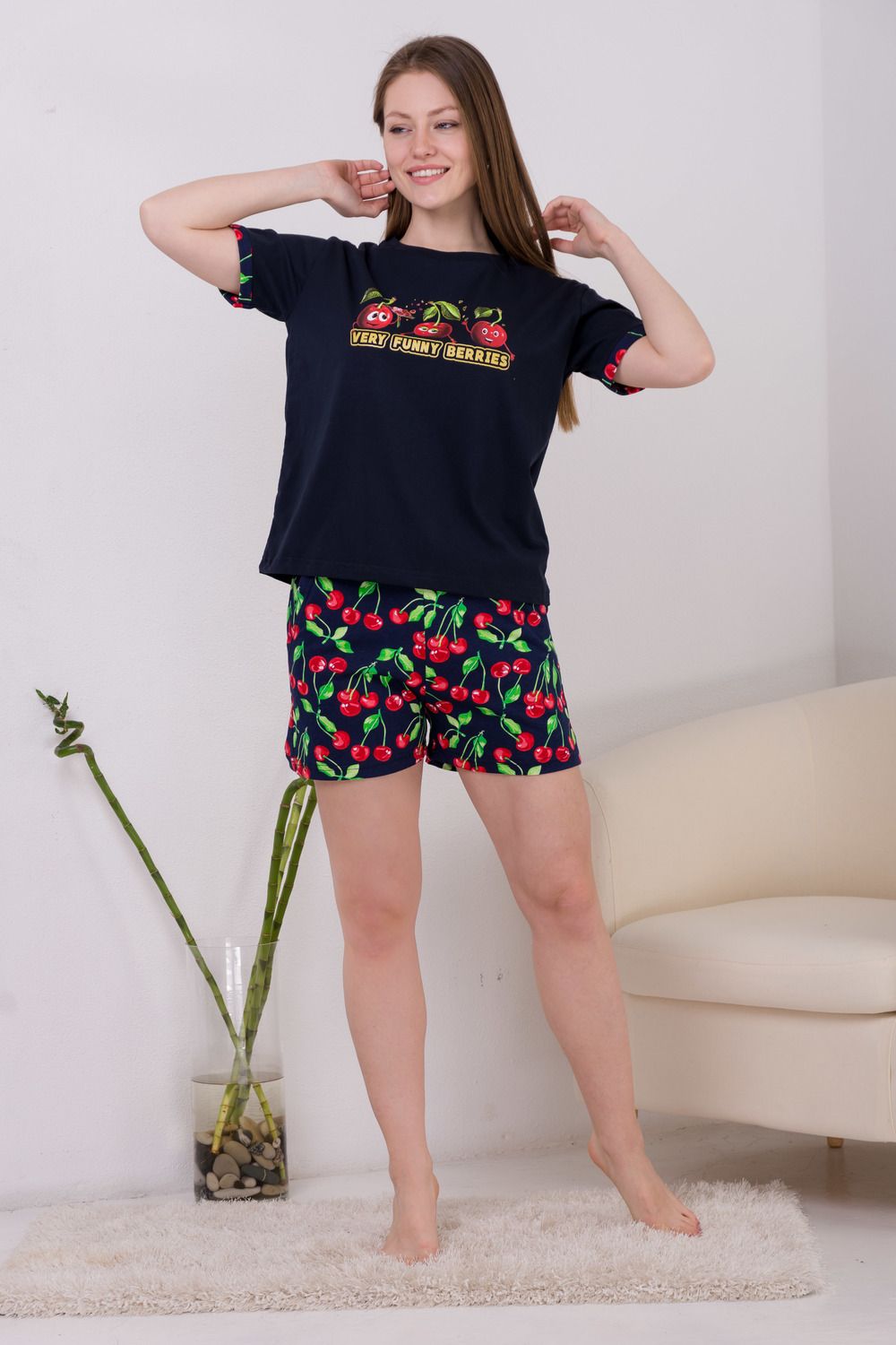 Костюм, состоящий из футболки и шорт с боковыми карманами. На рукавах манжеты с отворотами. Принт с вишенками делает изделие оригинальным. Костюм незаменим на отдыхе и дома.