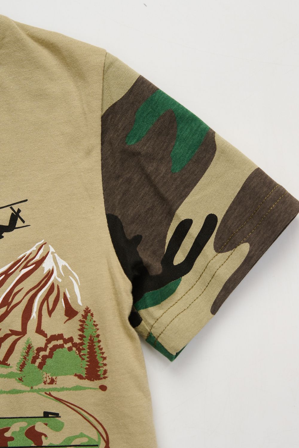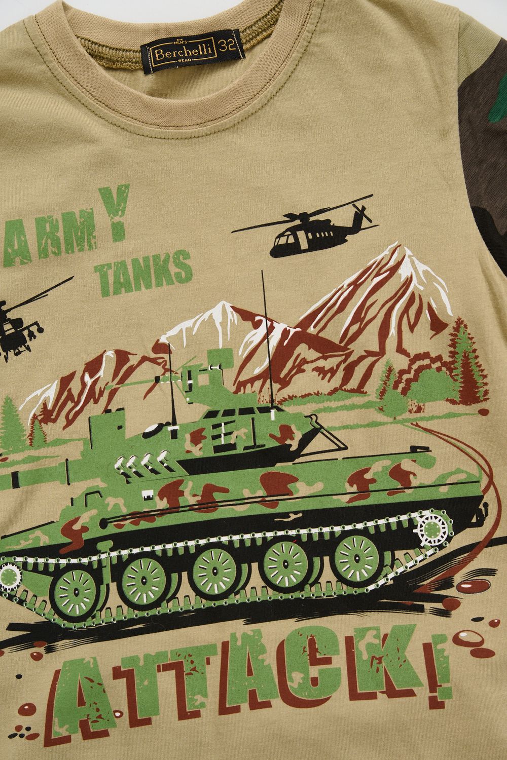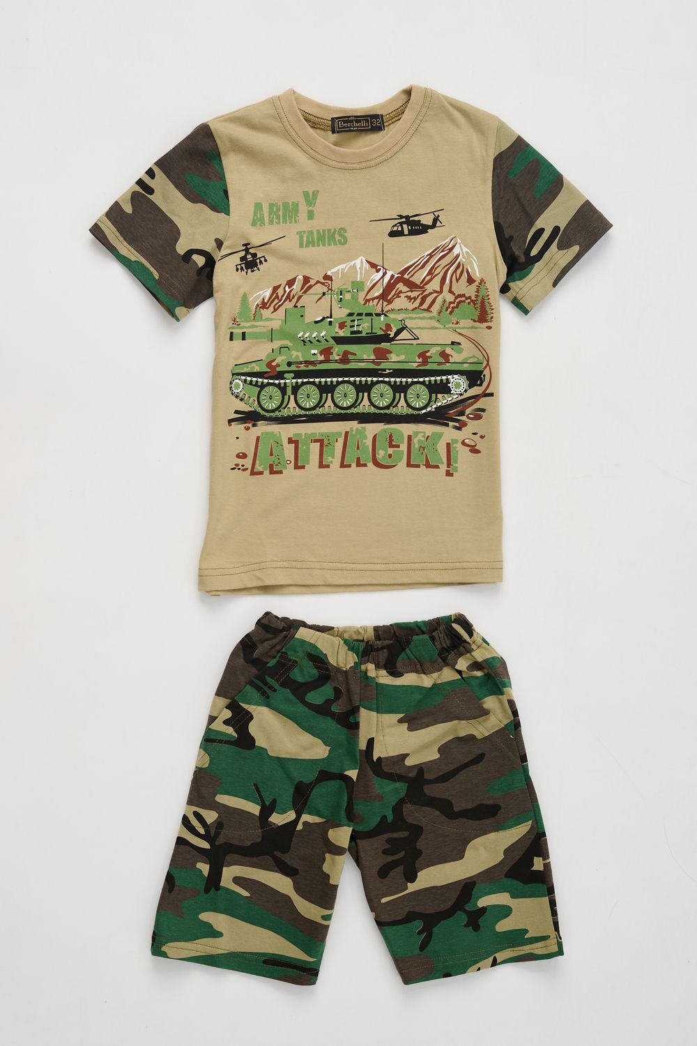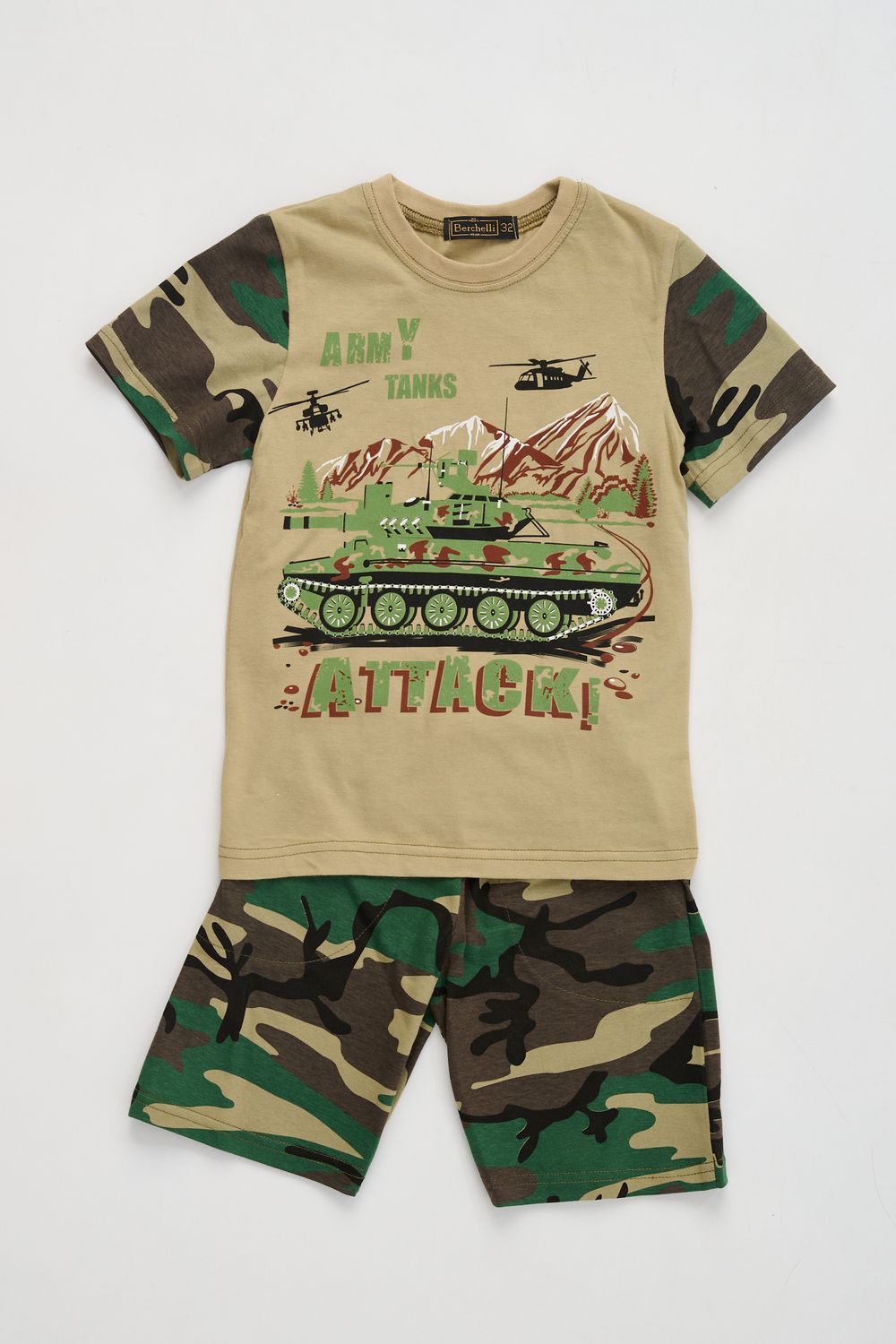 Костюм из кулирки для мальчиков футболка + шорты. Две расцветки — пиксель и флора. Футболка с принтом в виде БМД, рукава камуфлированные. Шорты аналогичного камуфляжного дизайна, по бокам карманы, длина до коленей. Может быть парой мужскому костюму Десант (продается отдельно). Размеры от 26 до 38.