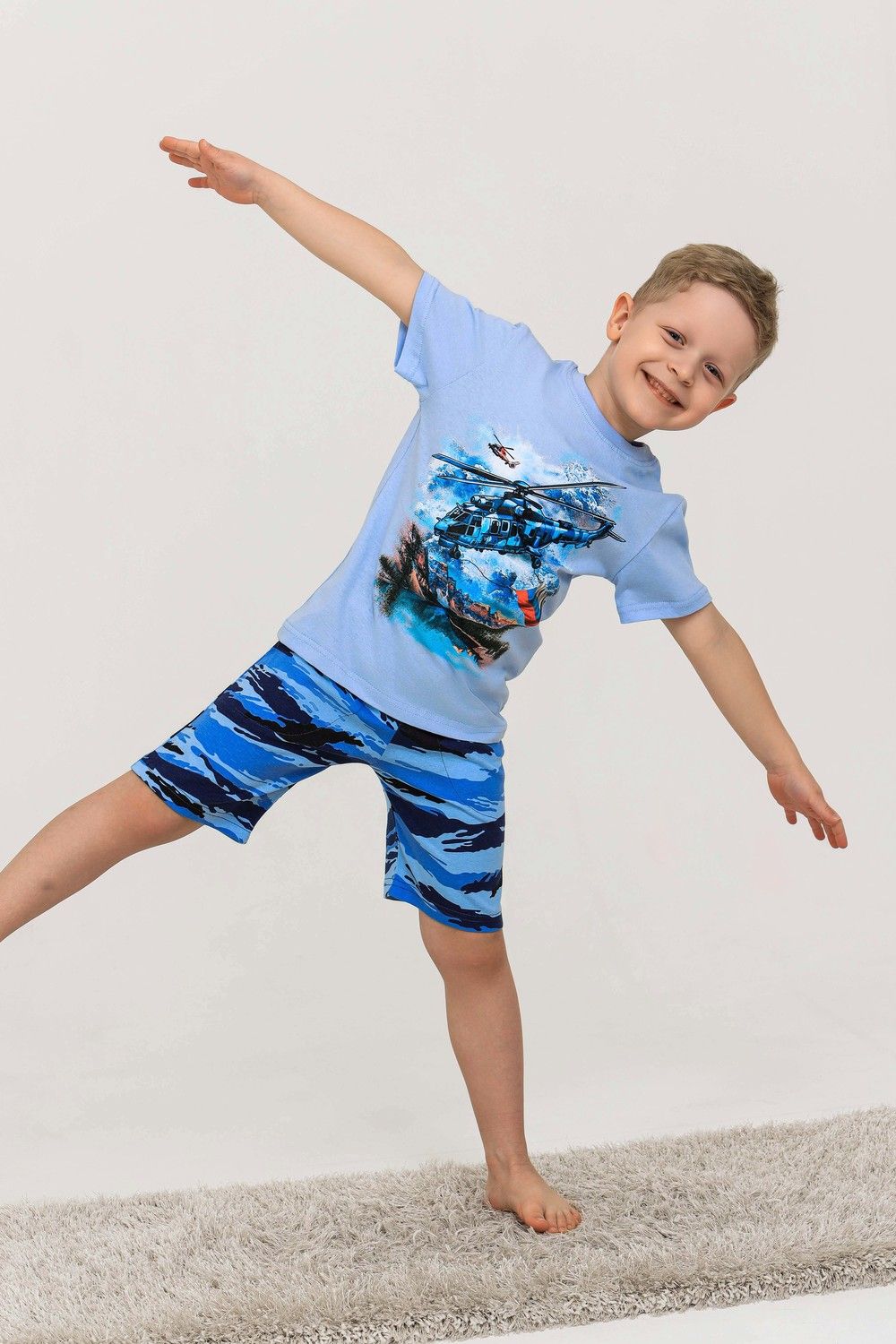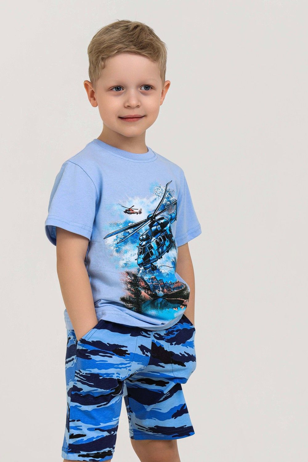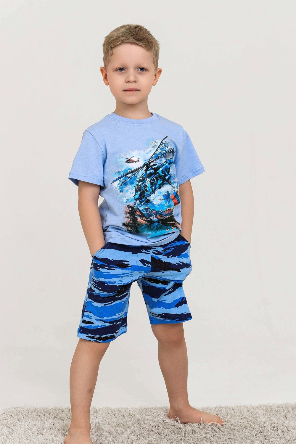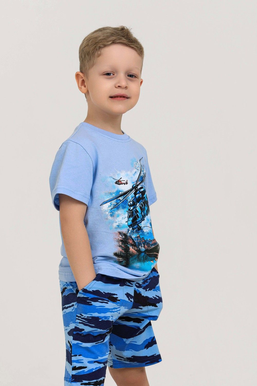 Костюм из кулирки для мальчиков футболка + шорты. Светлая футболка с принтом в виде изображения вертолета. Шорты в дизайне «милитари», по бокам карманы, длина чуть ниже коленей. Может быть парой мужскому костюму Вертолет (продается отдельно). Рисунок камуфляжа может немного отличаться