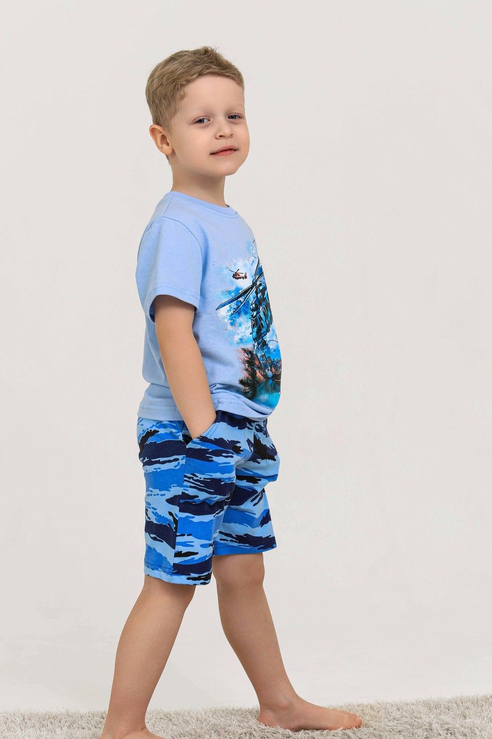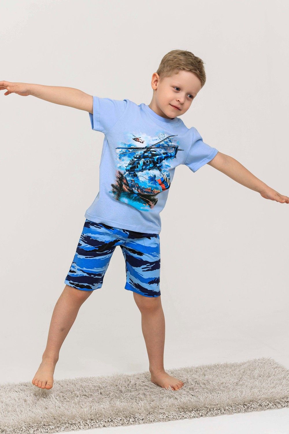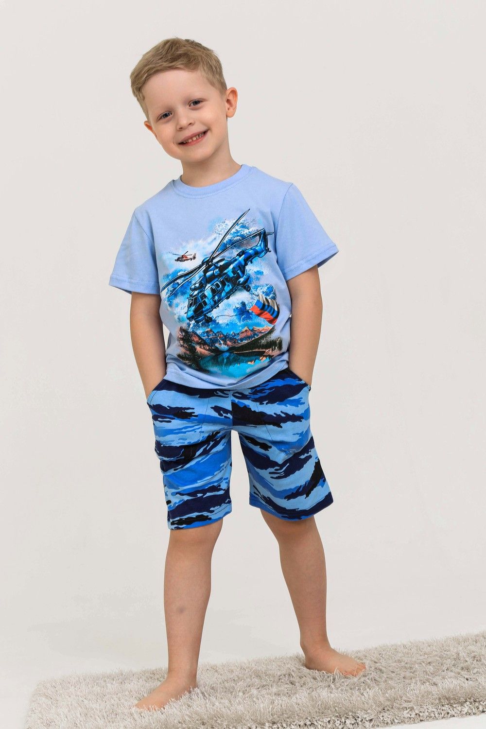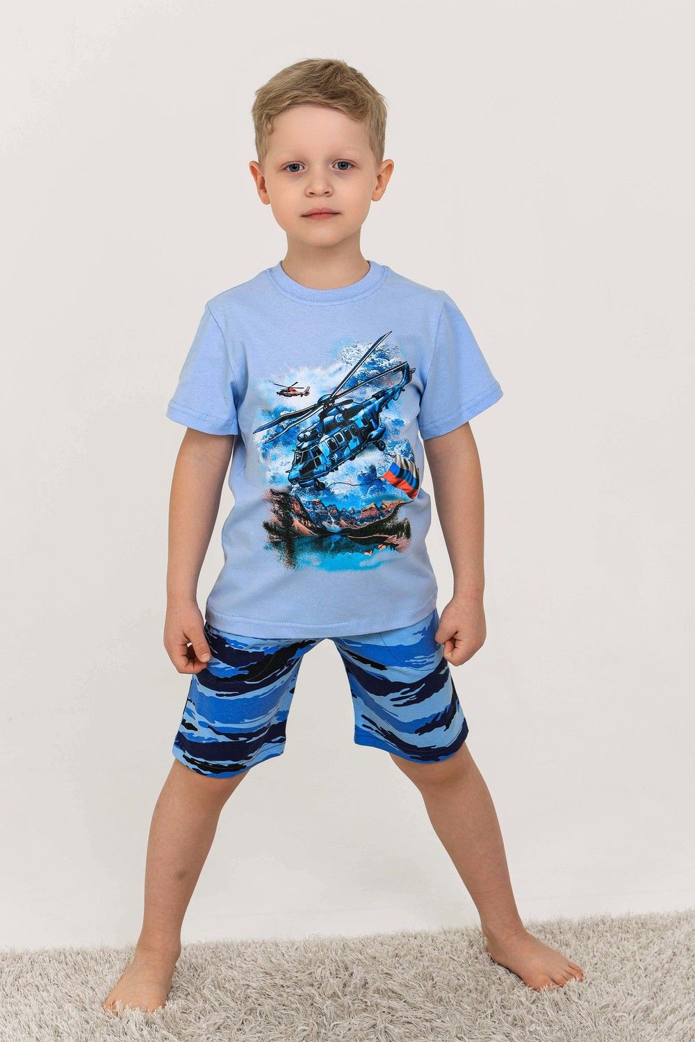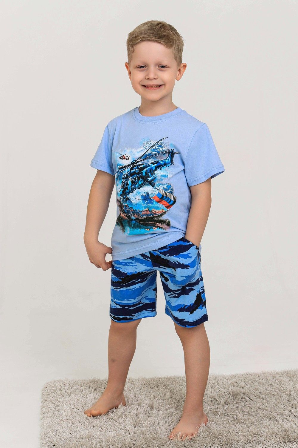 Костюм из кулирки для мальчиков футболка + шорты. Светлая футболка с принтом в виде изображения вертолета. Шорты в дизайне «милитари», по бокам карманы, длина чуть ниже коленей. Может быть парой мужскому костюму Вертолет (продается отдельно). Рисунок камуфляжа может немного отличаться