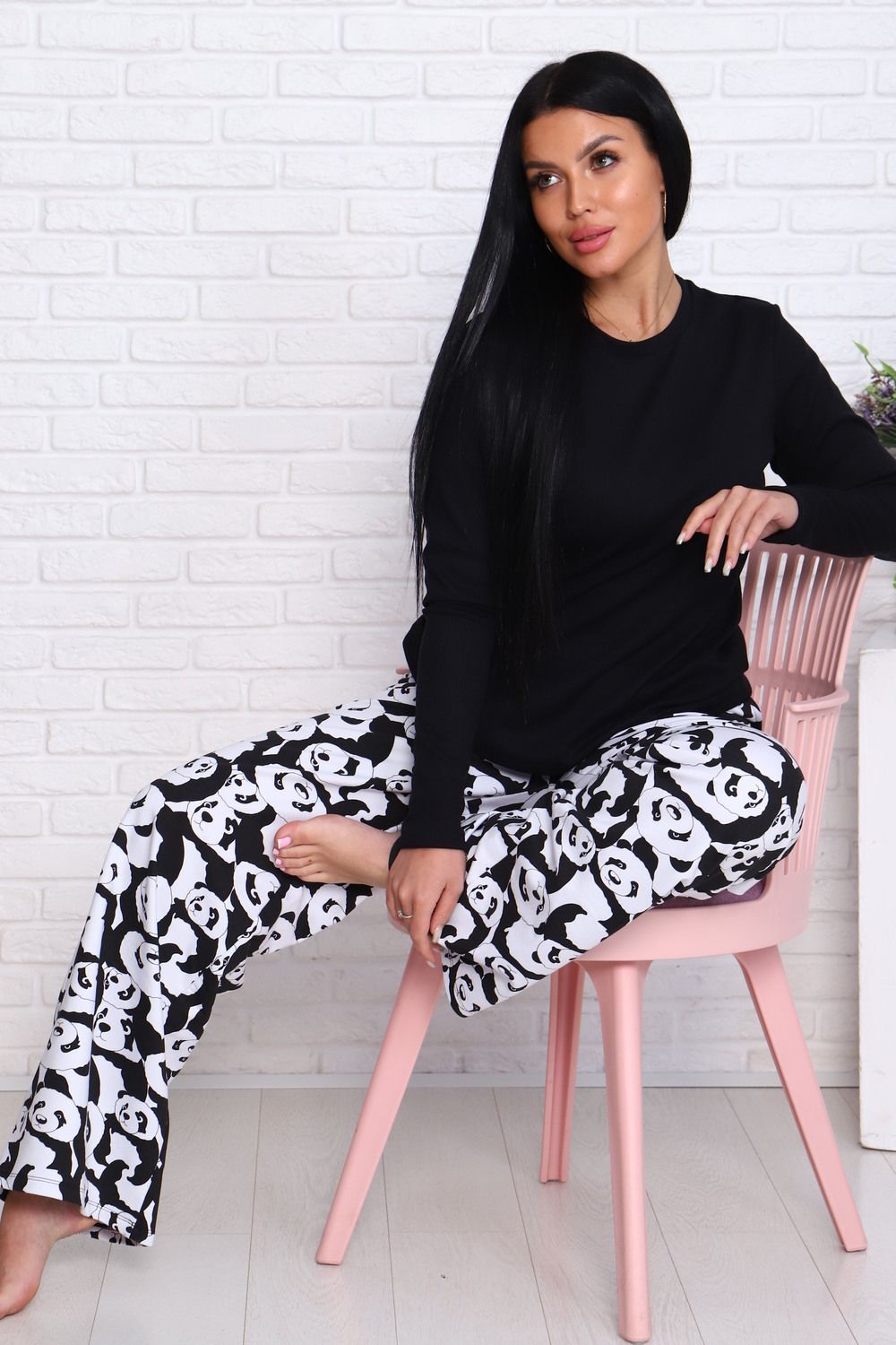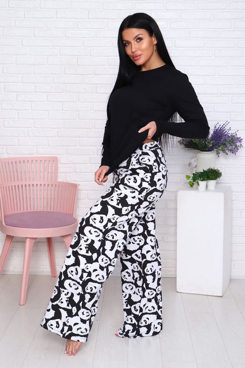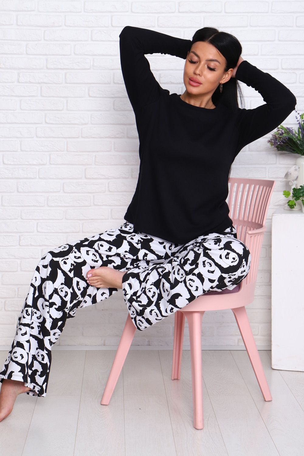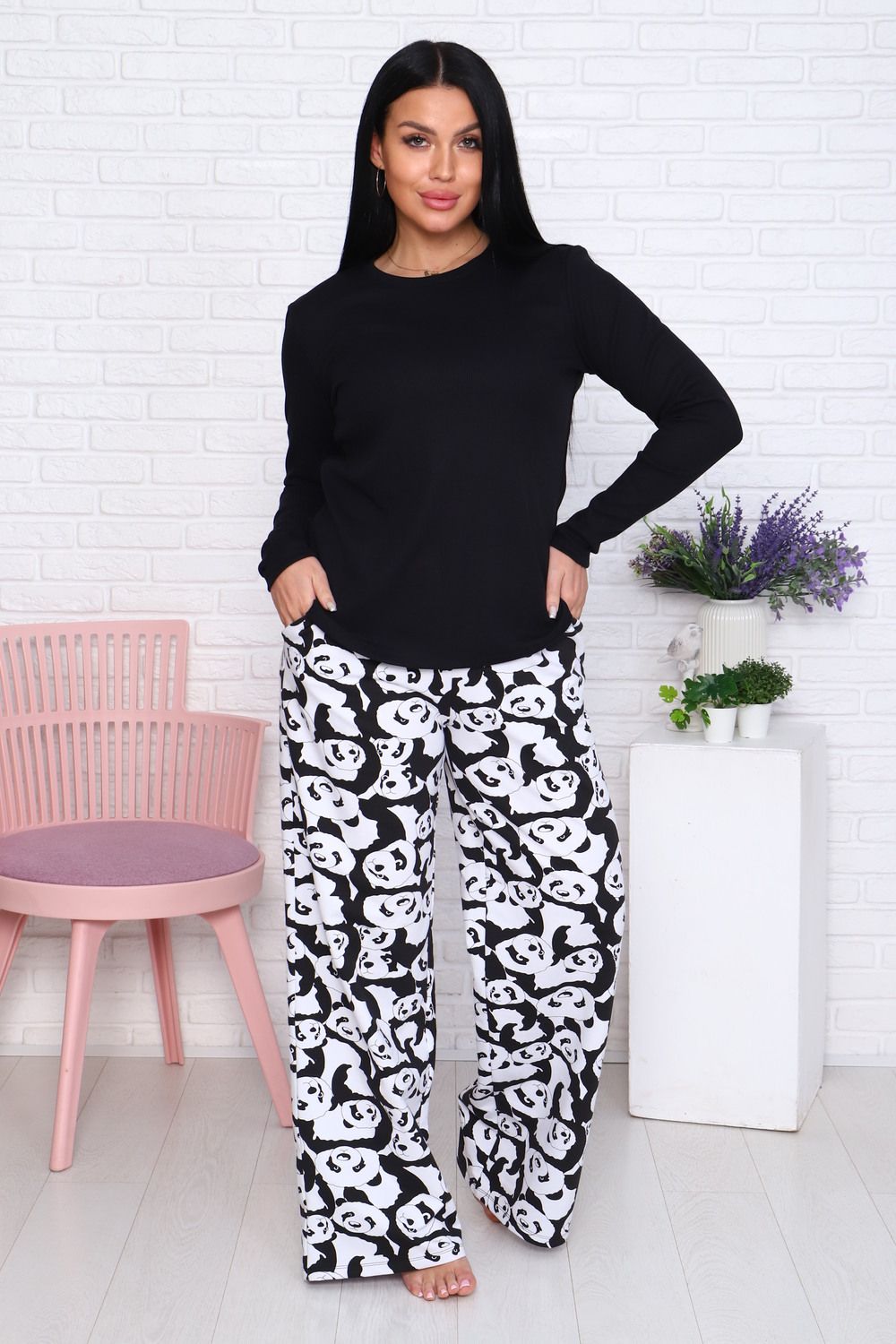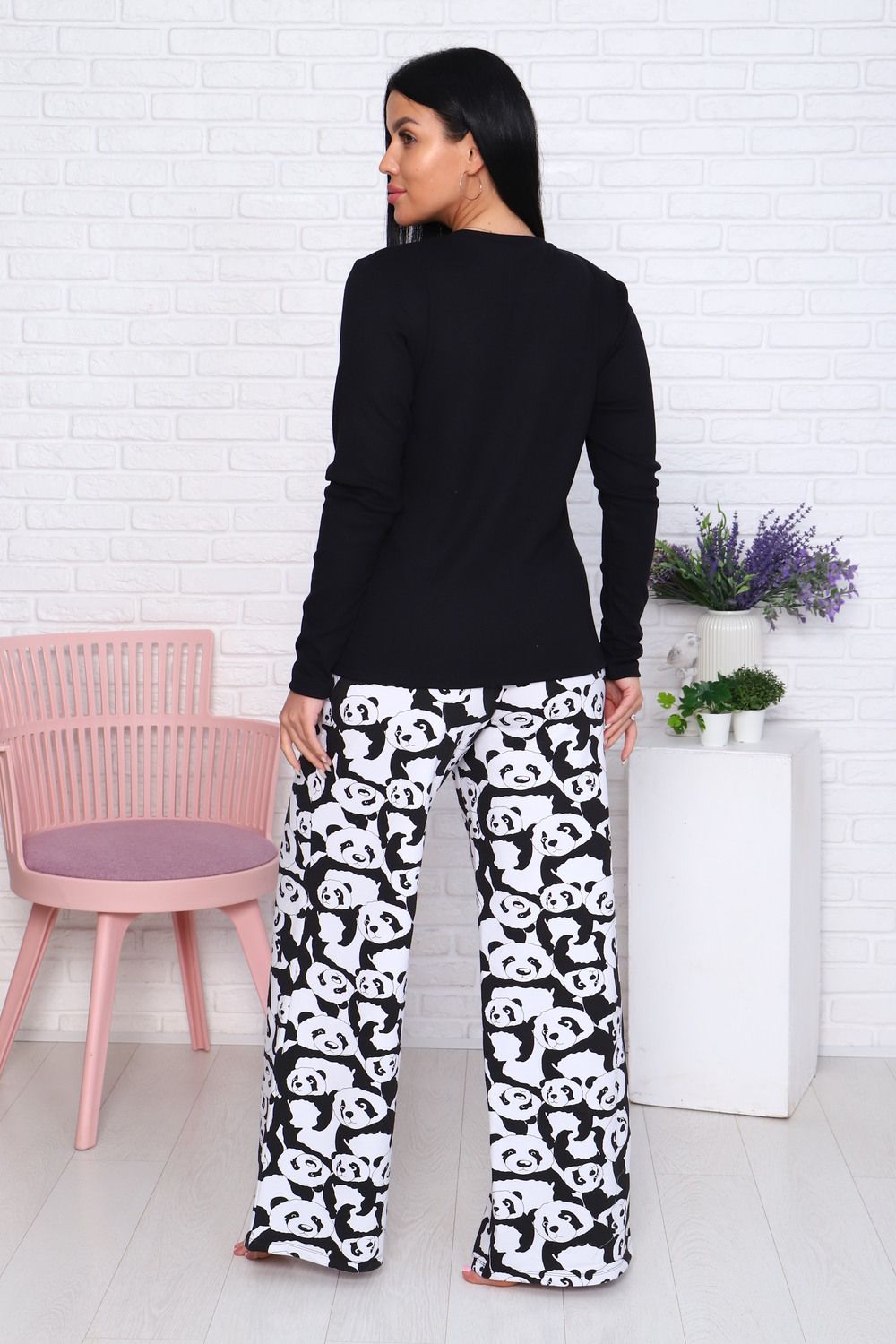 Домашний костюм – это отличный выбор для тех, кто любит активный образ жизни и ценит комфорт в одежде. Комплект состоит из широких брюк с принтом и лонгслива, который не сковывает движений. Состав: 95% Хлопок, 5% Эластан, материал брюк - футер 2-х нитка на резинке. Костюм можно комбинировать, сочетая различную одежду для дома. Пижама с брюками отлично подойдет в качестве подарка на новый год, день рождения, а также для фотосессии. Ее можно подарить маме, бабушке, сестре, подруге, девушке, родным и друзьям. Как любая женская одежда, костюм требует определенных правил ухода: стирка при 30 С, без отбеливания.