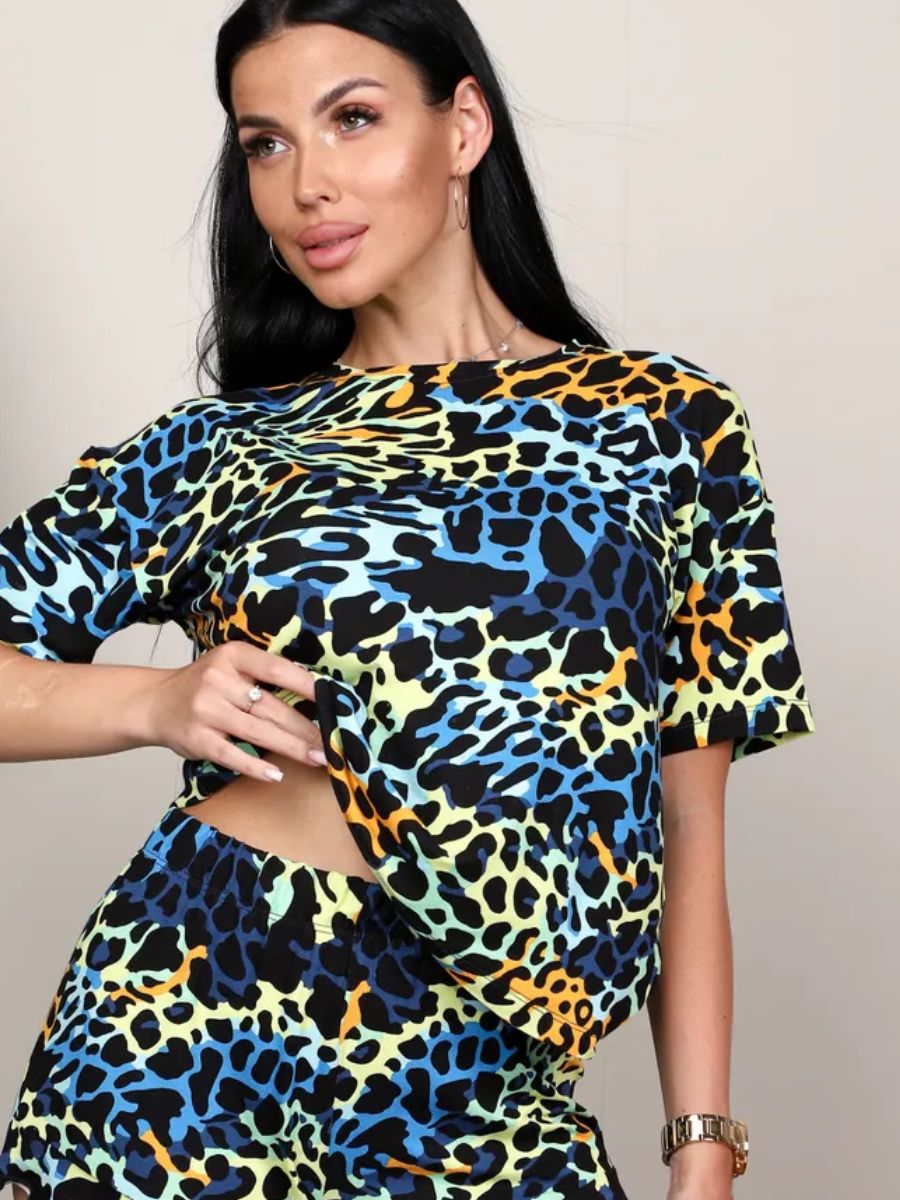 Представляем вашему вниманию стильный и удобный летний комплект от DANi.TEX BRAND - костюм из футболки и шорт. Этот яркий пижамный домашний костюм представлен в красивом молодежном стиле, что делает его отличным выбором для девушек. Футболка и шорты выполнены из 95%хлопка и 5% лайкры. Ткань пропускает воздух, впитывает влагу и приятна к телу, идеально подойдет как для домашнего отдыха, так и для сна. Костюм имеет свободный крой, который не обтягивает и позволяет свободно двигаться. Он подходит на любой рост и отлично сидит на фигуре. Футболка с круглым вырезом создает комфортное ощущение на шее, а шорты на резинке добавляют удобства и функциональности. Этот костюм легко ухаживать - достаточно бережной стирки при температуре до 30 градусов. Он отличается стильным дизайном с оригинальным рисунком леопардовый принт с привлекательным ярким цветом. Будьте в тренде с новой коллекцией от DANi.TEX BRAND! Этот товар является продукцией собственного производства бренда DANi.TEX BRAND, что гарантирует высокое качество и соответствие всем стандартам. Приобретая этот костюм, вы получите не только модный и красивый наряд, но и уверенность в его надежности и долговечности. Не упустите возможность приобрести эту новинку и добавить стильный элемент в свой гардероб!