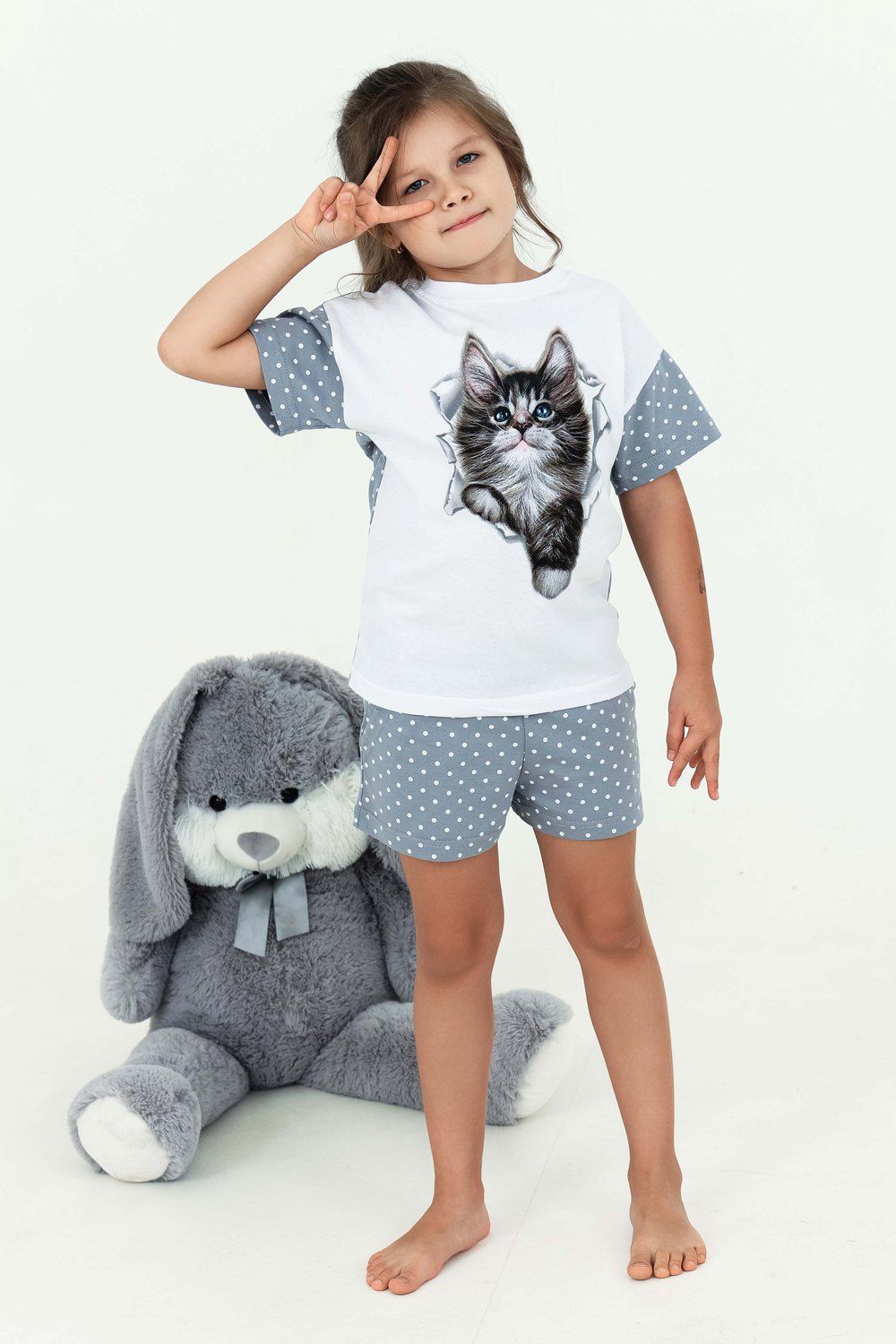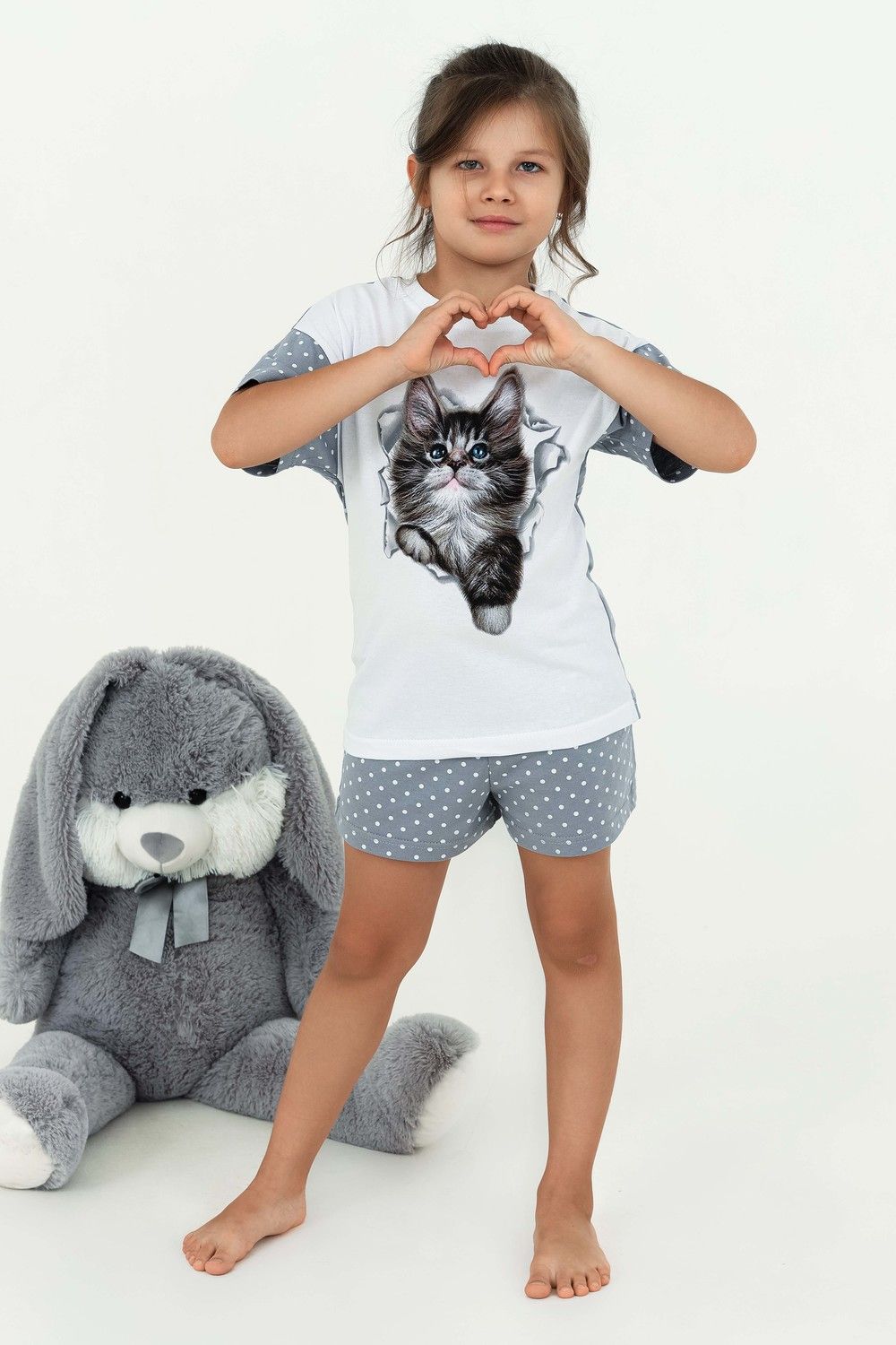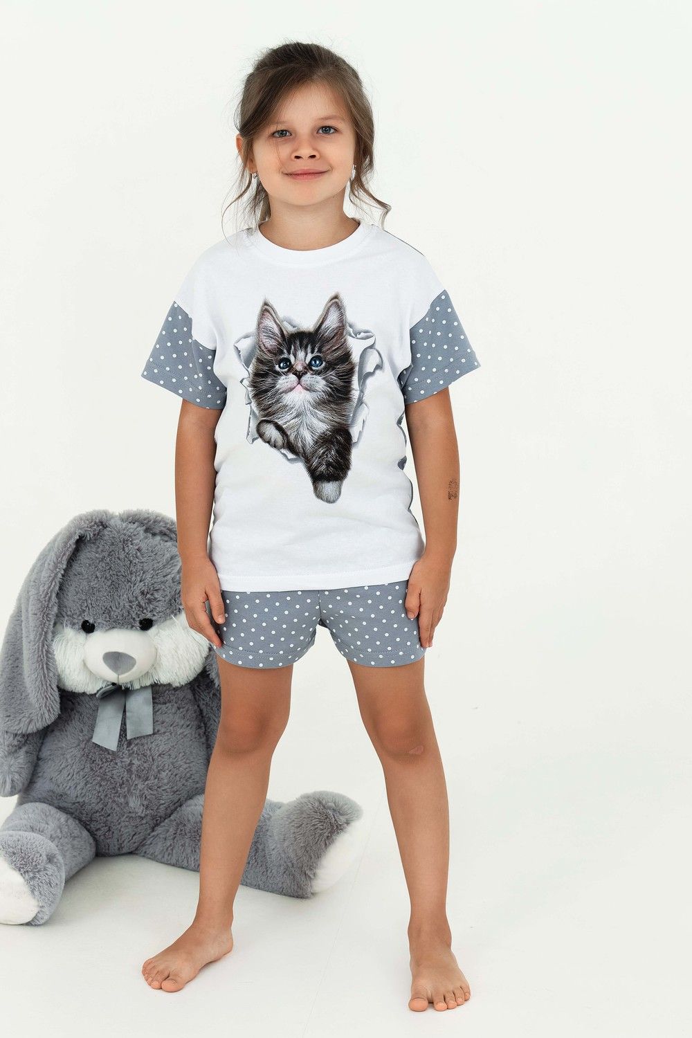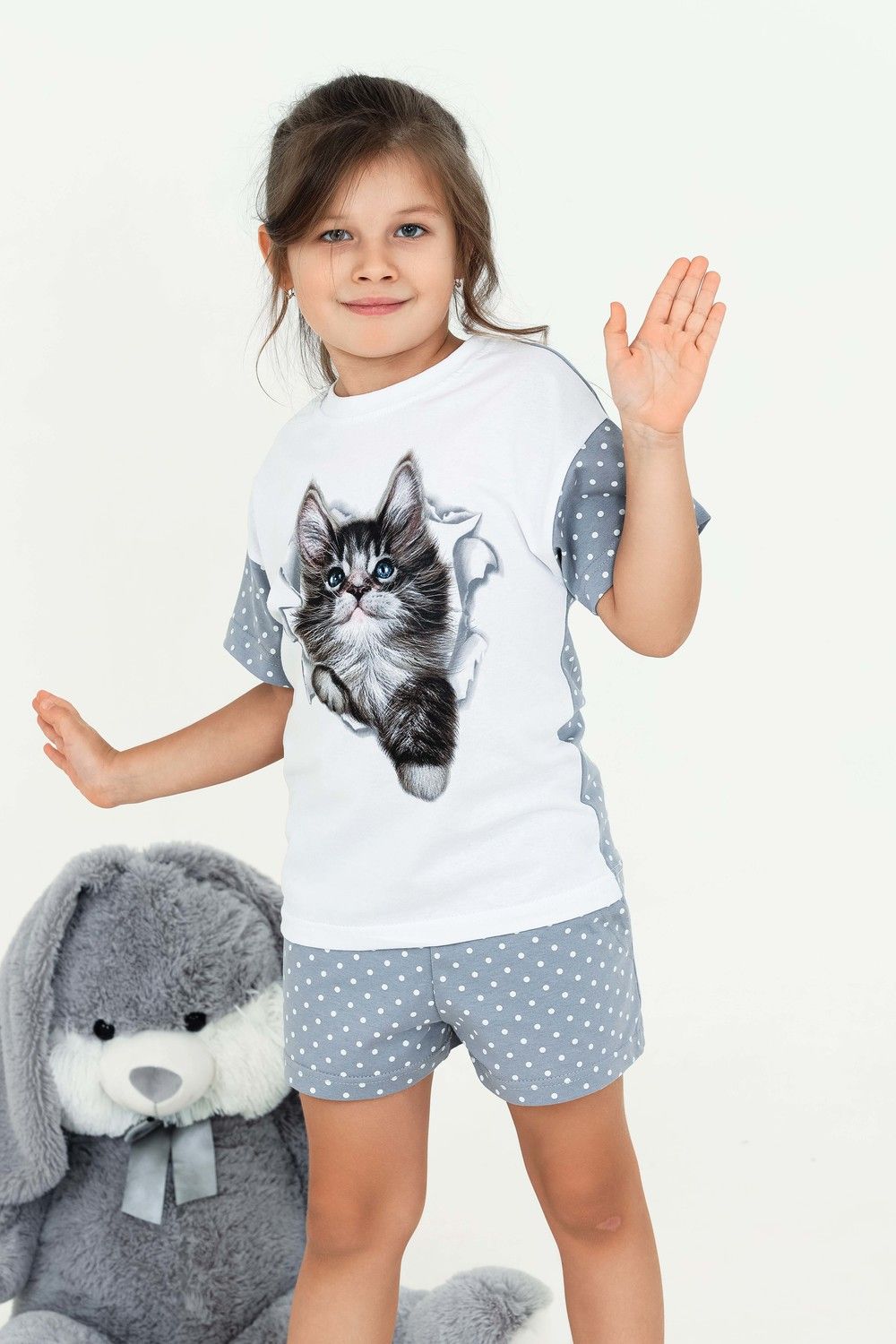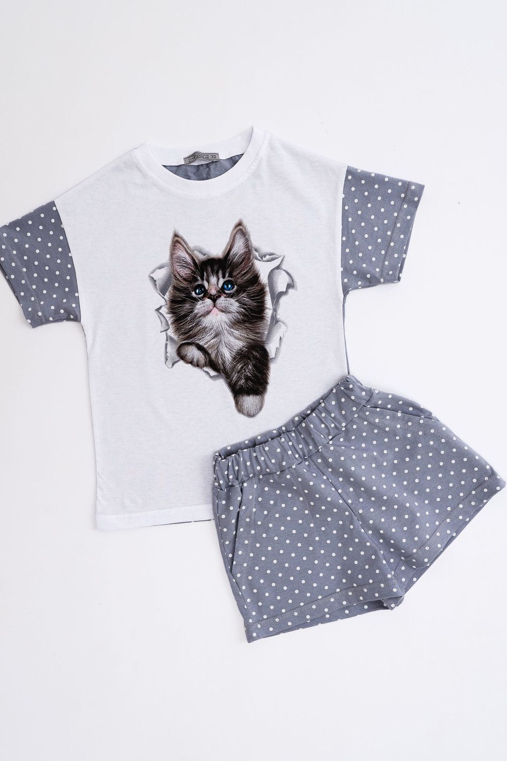 Домашний костюм для девочки с красивым котёнком Мэйкун. Рукава и спинка футболки из ткани-компаньона. Шортики свободного кроя на широком поясе с внутренними боковыми карманами.