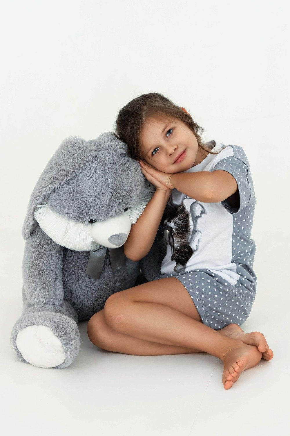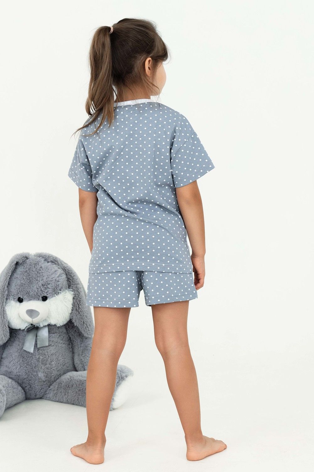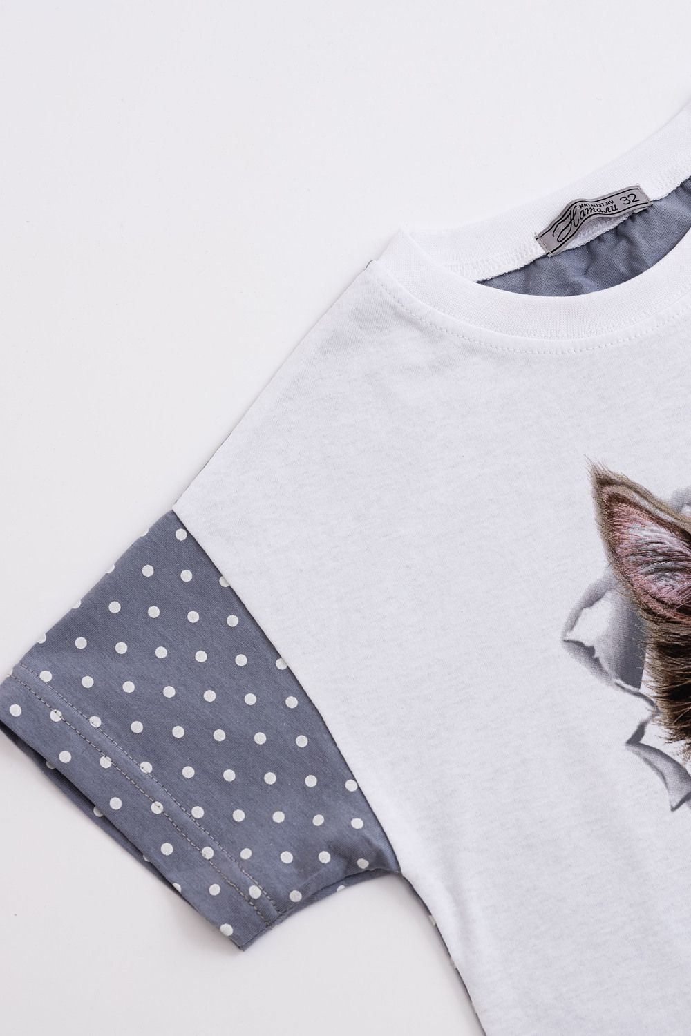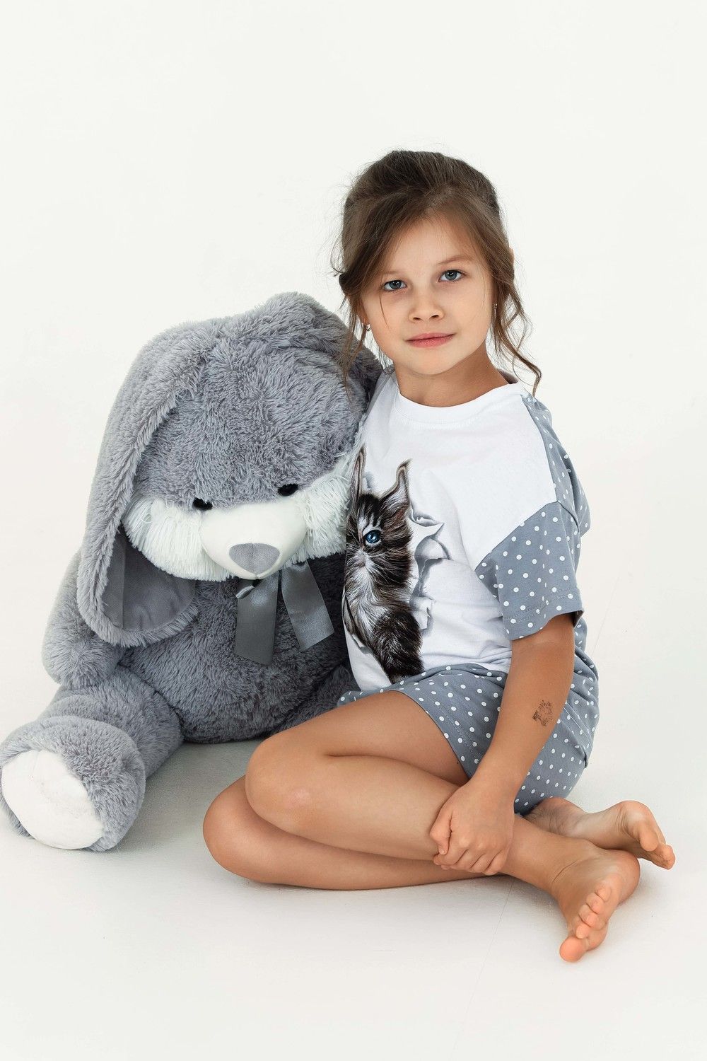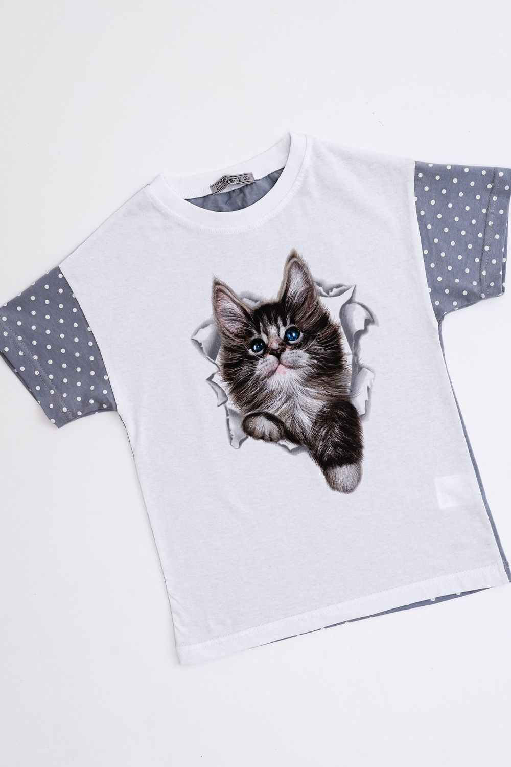 Домашний костюм для девочки с красивым котёнком Мэйкун. Рукава и спинка футболки из ткани-компаньона. Шортики свободного кроя на широком поясе с внутренними боковыми карманами.
