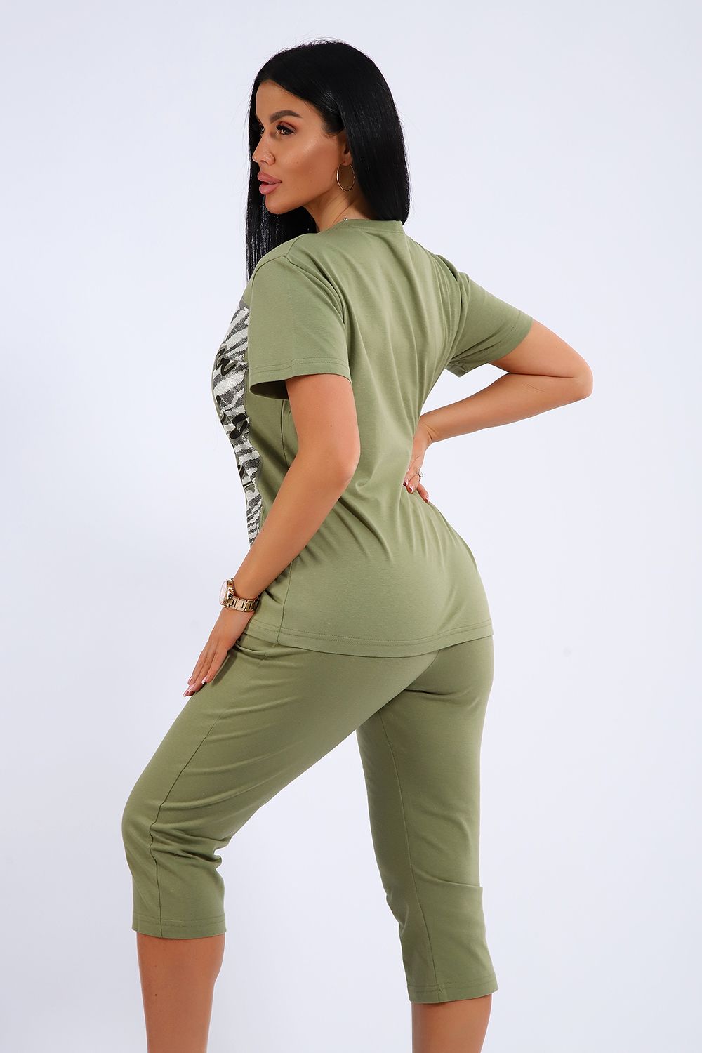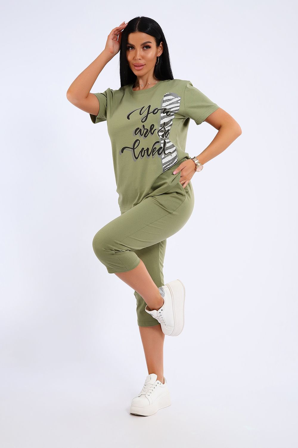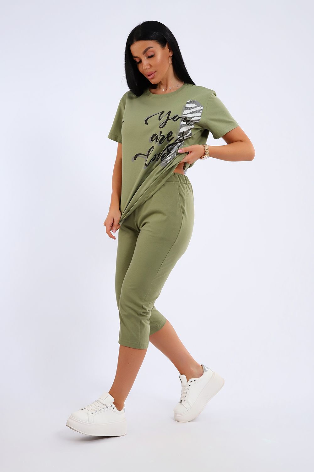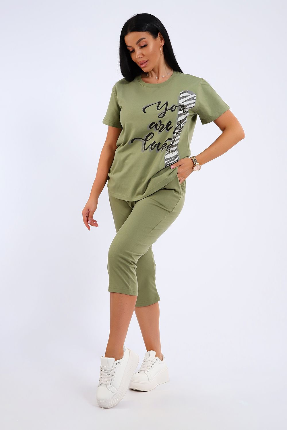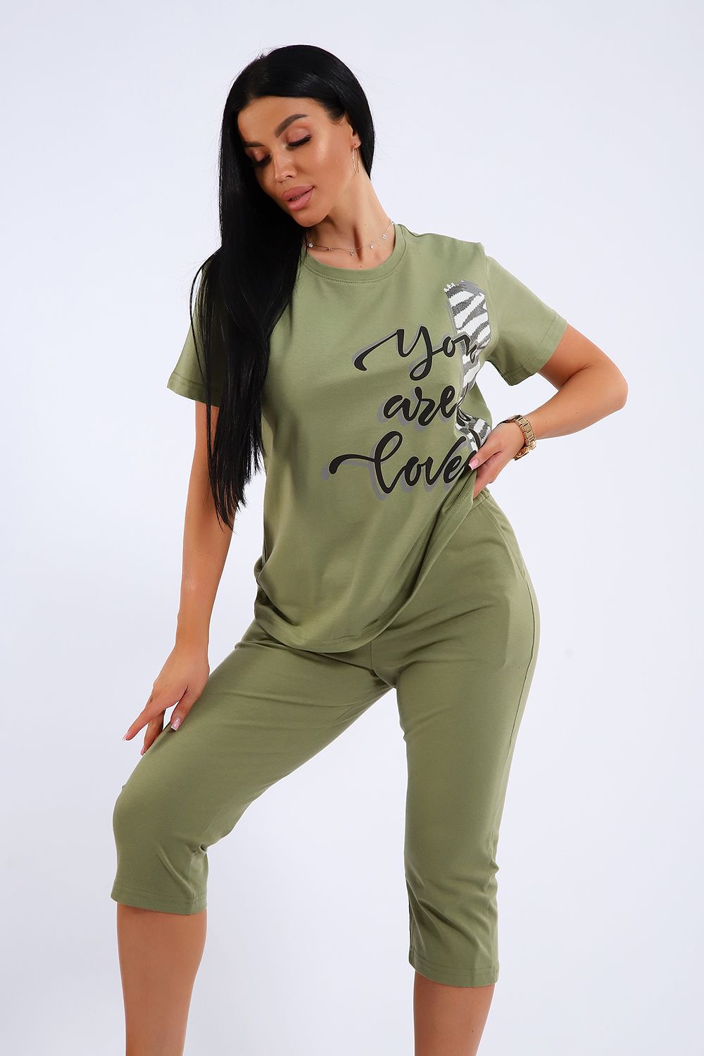 Универсальный костюм с бриджами, изготовленный из качественного хлопкового трикотажа идеально подходит для самых разных вариантов использования. Он может быть одеждой для сна, домашним нарядом, а так же костюмом для времяпровождения на свежем воздухе. Майка достаточно объёмная, чтобы не сковывать движений, полочка украшена броским принтом. Благодаря использованию мягкого трикотажа из 100% хлопка, вы будете наслаждаться комфортом и уютом в любой ситуации.