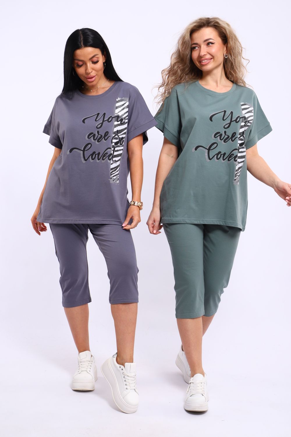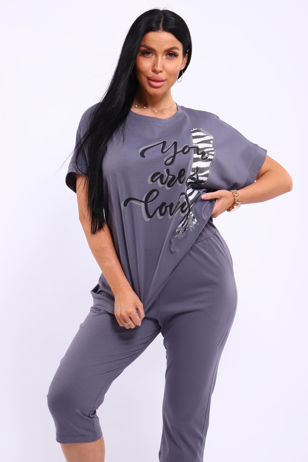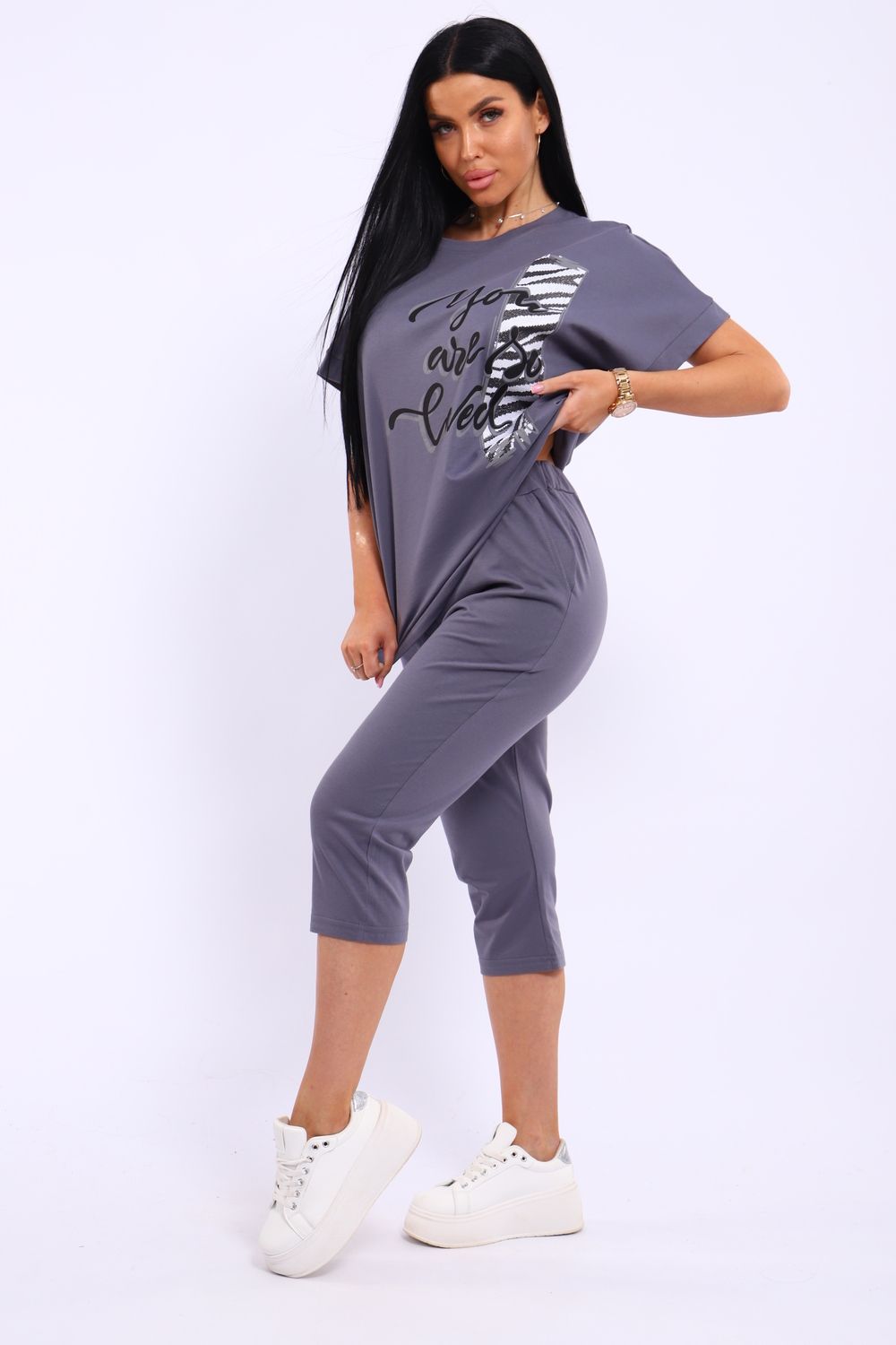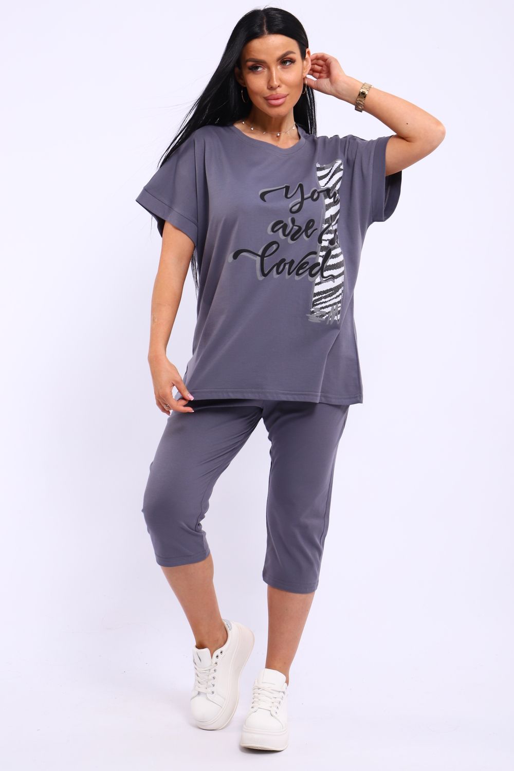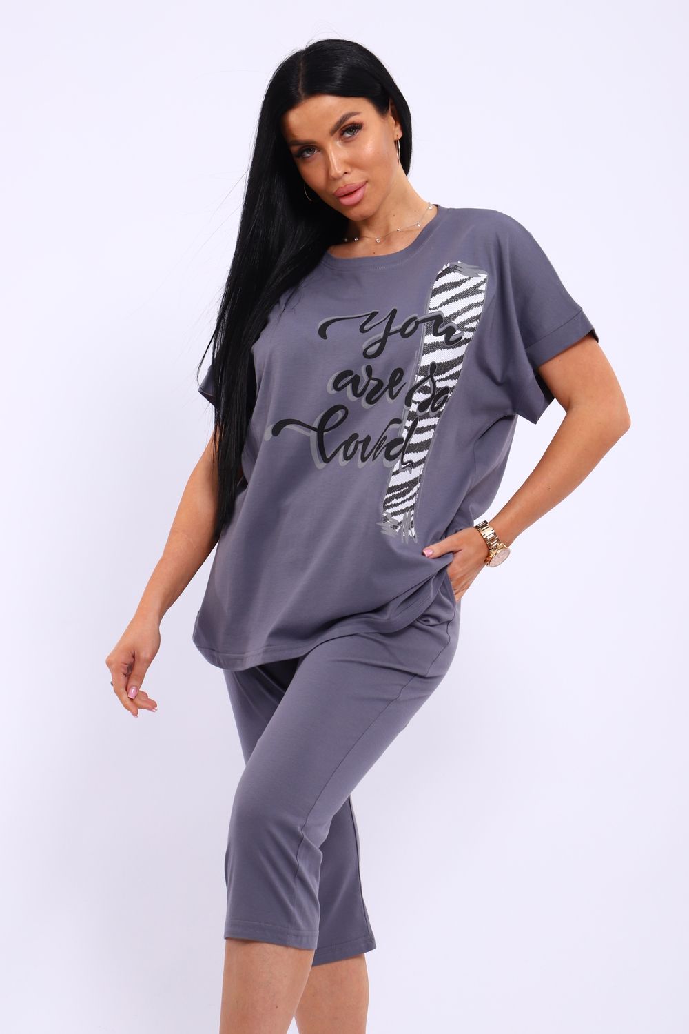 Универсальный костюм с бриджами, изготовленный из качественного хлопкового трикотажа идеально подходит для самых разных вариантов использования. Он может быть одеждой для сна, домашним нарядом, а так же костюмом для времяпровождения на свежем воздухе. Майка достаточно объёмная, чтобы не сковывать движений, полочка украшена броским принтом. Благодаря использованию мягкого трикотажа из 100% хлопка, вы будете наслаждаться комфортом и уютом в любой ситуации.