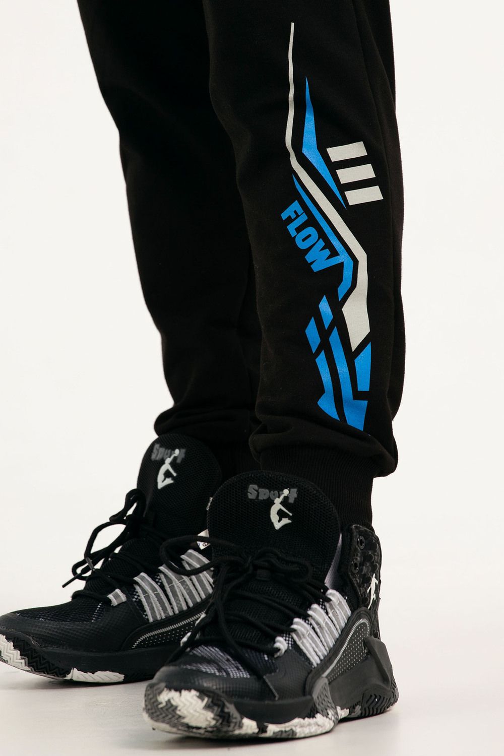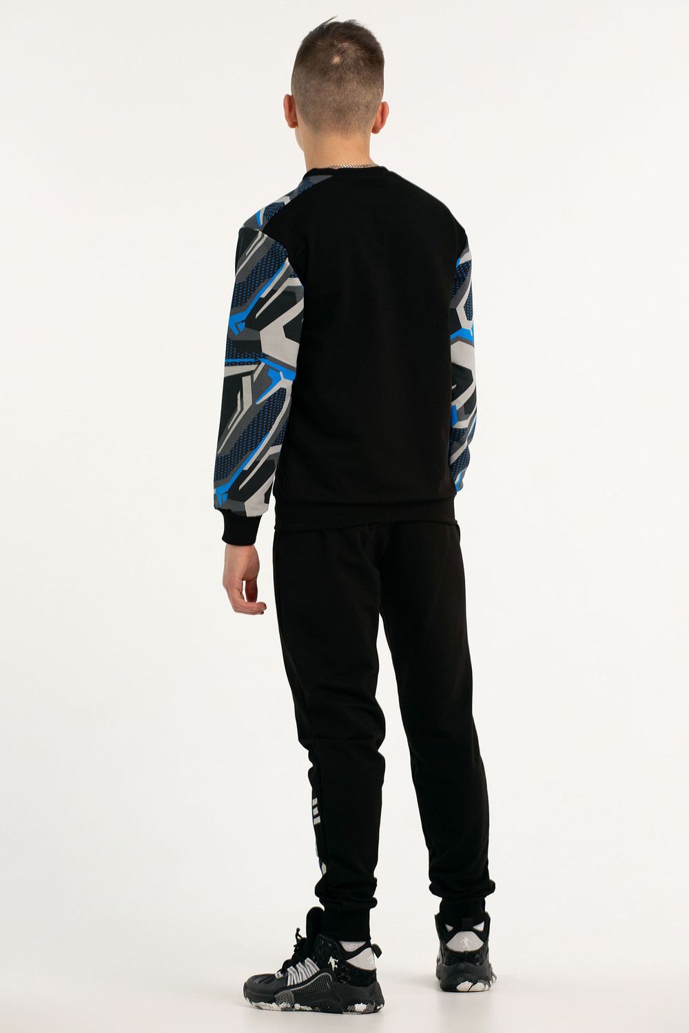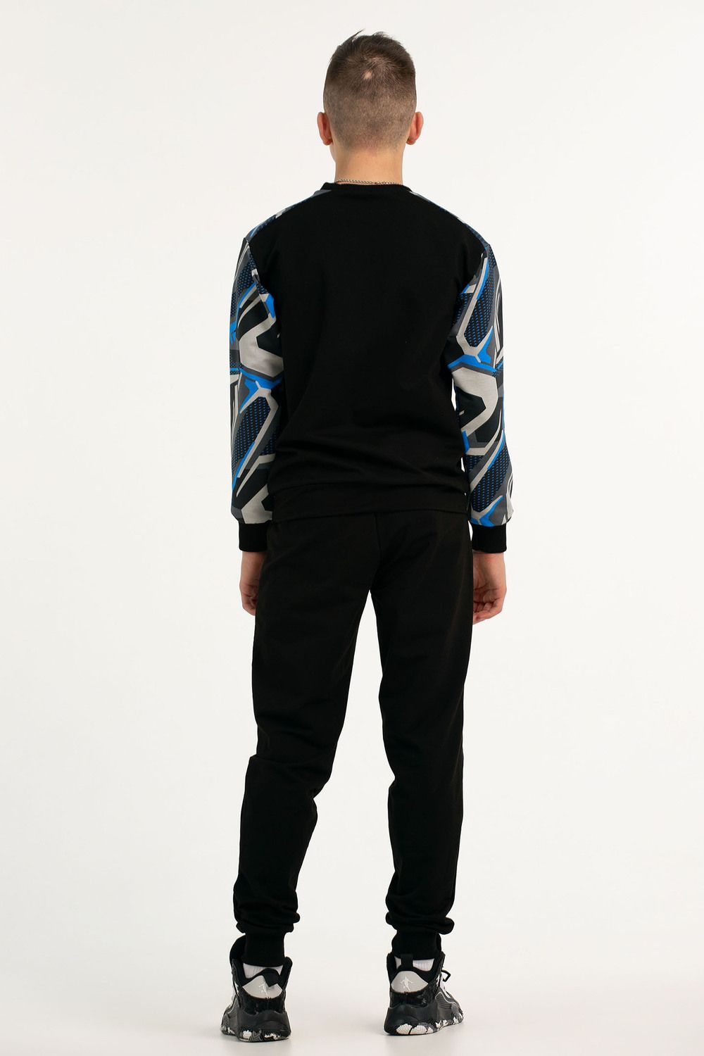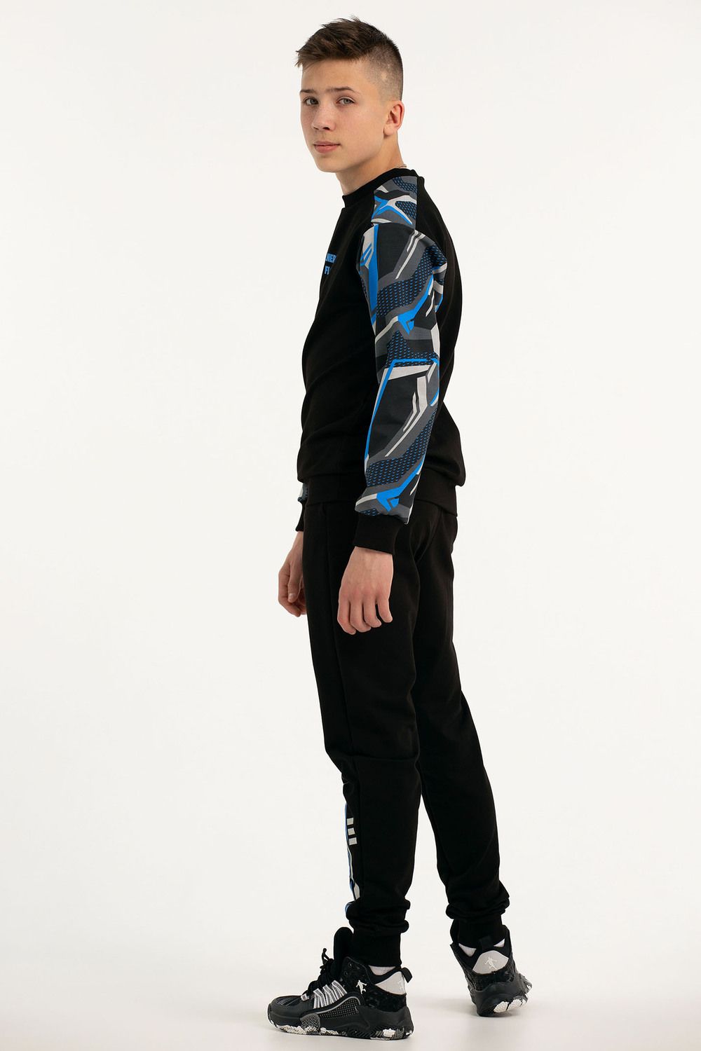 Костюм свободного кроя выполнен из футера 2-х нитки. Состоит из толстовки и брюк. Толстовка с манжетами и поясом из эластичного трикотажа. Рукав втачной со спущенной линией плеча. Брюки свободной посадки с карманами и манжетами из эластичного трикотажа.