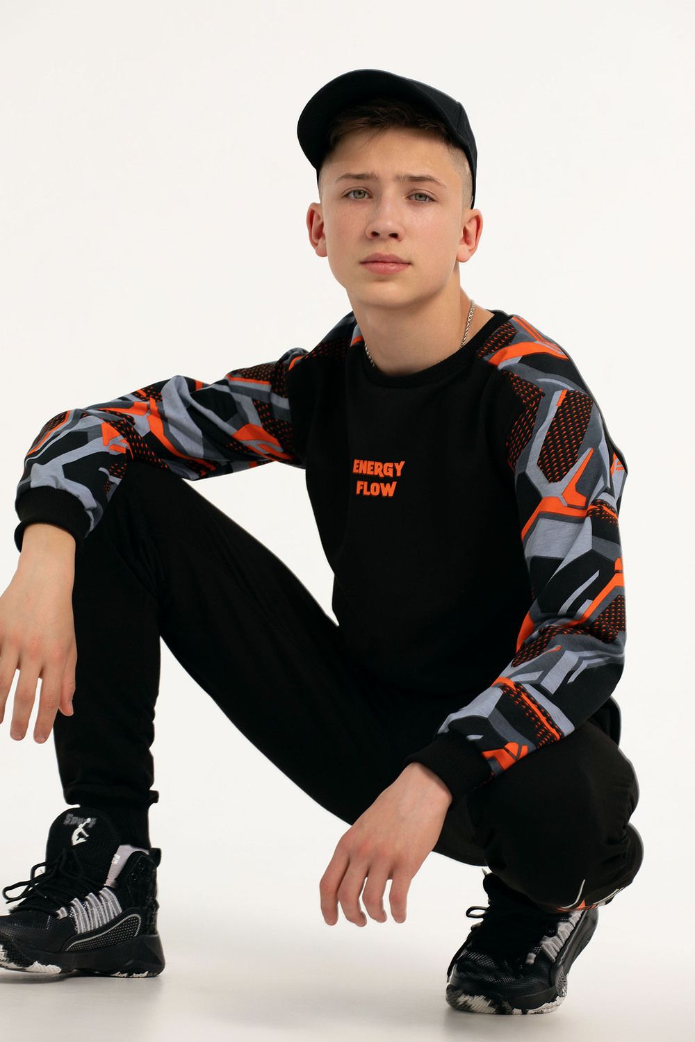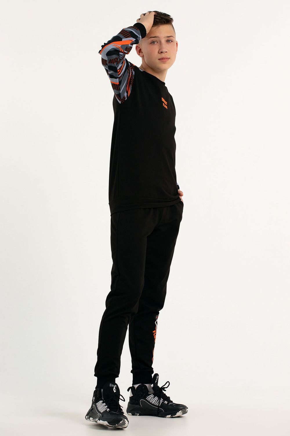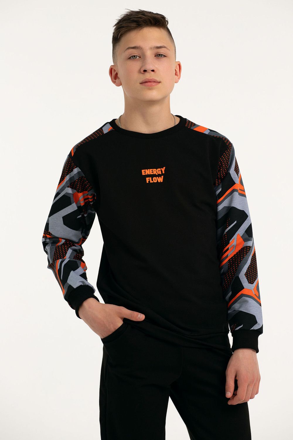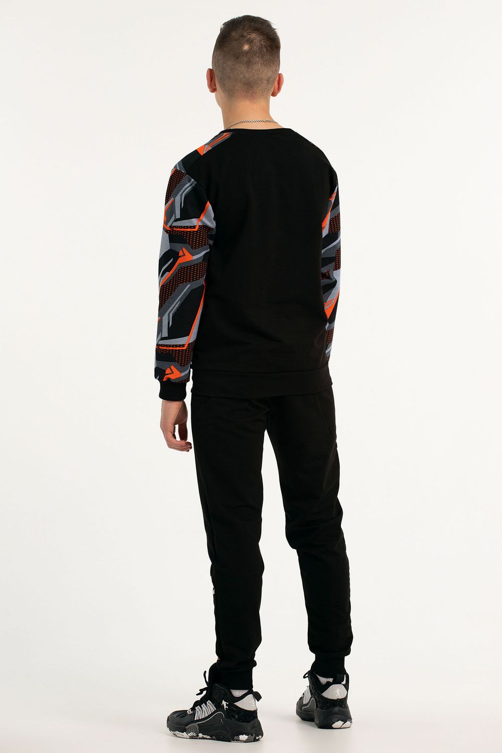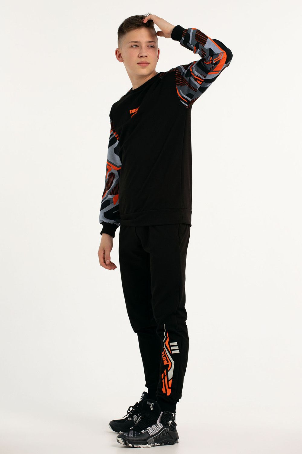 Костюм свободного кроя выполнен из футера 2-х нитки. Состоит из толстовки и брюк. Толстовка с манжетами и поясом из эластичного трикотажа. Рукав втачной со спущенной линией плеча. Брюки свободной посадки с карманами и манжетами из эластичного трикотажа.