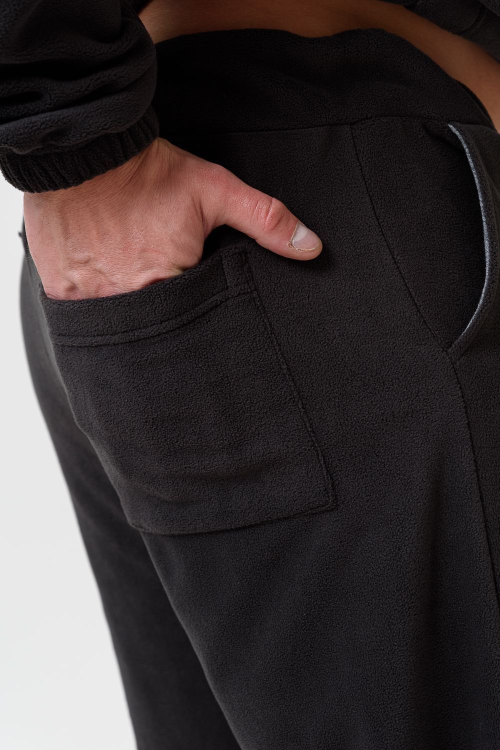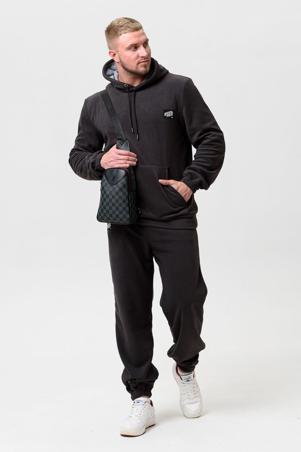 Костюм унисекс из флиса с брюками и худи. Худи с карманом кенгуру, капюшон со шнурком, нашивка в области груди. Брюки внизу на резинке, карманы в боках, нашивка под карманом. Костюм идеально подойдет для прогулок и отдыха. Размеры сдвоенные, 46-48, 50-52, 54-56.