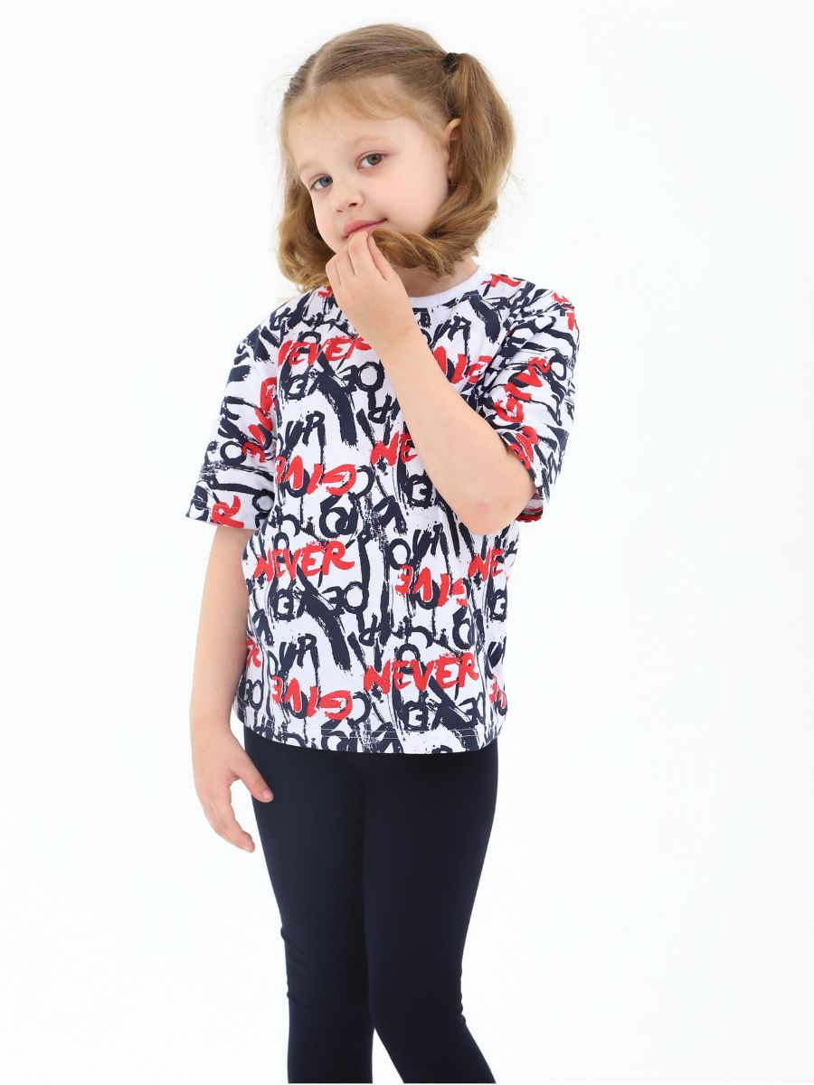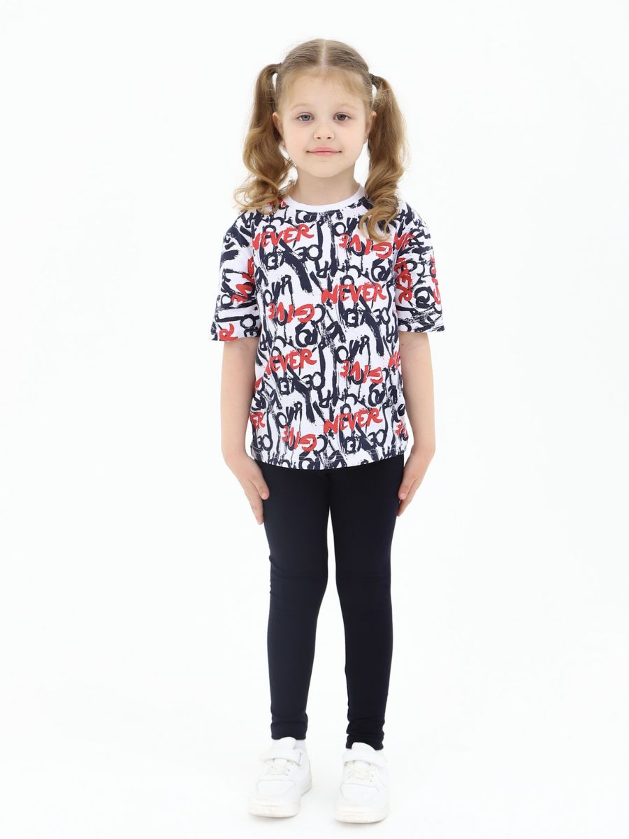Костюм состоит из легинс с эластичным поясом и футболки. Футболка выполнена из высококачественного хлопка, что гарантирует комфорт и удобство в носке. Лосины выполнены из кулирки с лайкрой — эластичного трикотажного полотна, которое не стесняет движения.