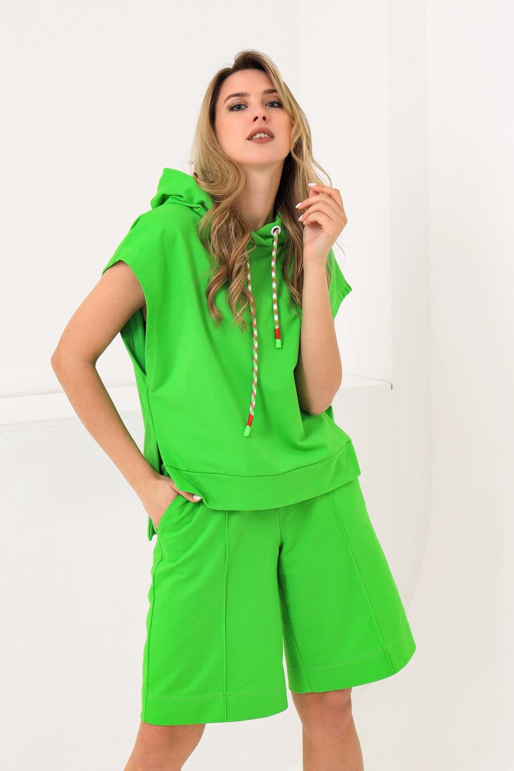 Новый летний дизайнерский костюм в спортивном стиле. Костюм для базового гардероба стильной современной девушки. Отличное решение на каждый день, для прогулок, отдыха, путешествий, поездок на море и пикника, для шоппинга. Для любого возраста и телосложения. Комфортный и женственный фасон - укороченная «жилетка-худи» свободного кроя, шорты с карманами, удобным поясом-резинкой, подчеркивающим талию, высокой посадкой и прямого кроя. В капюшон жилетки вставлен шнурок, который придает дополнительную стильность костюму. Ткань легко гладится, приятная на ощупь. Во время носки костюм сохраняет форму, не мнется. Трикотажный костюм — это удобно и практично. Вам не надо думать, что надеть, у Вас всегда есть в шкафу уже готовый модный образ. Шорты и «жилетку-худи» можно носить по отдельности. "Жилетку-худи" рекомендуем носить с топом
