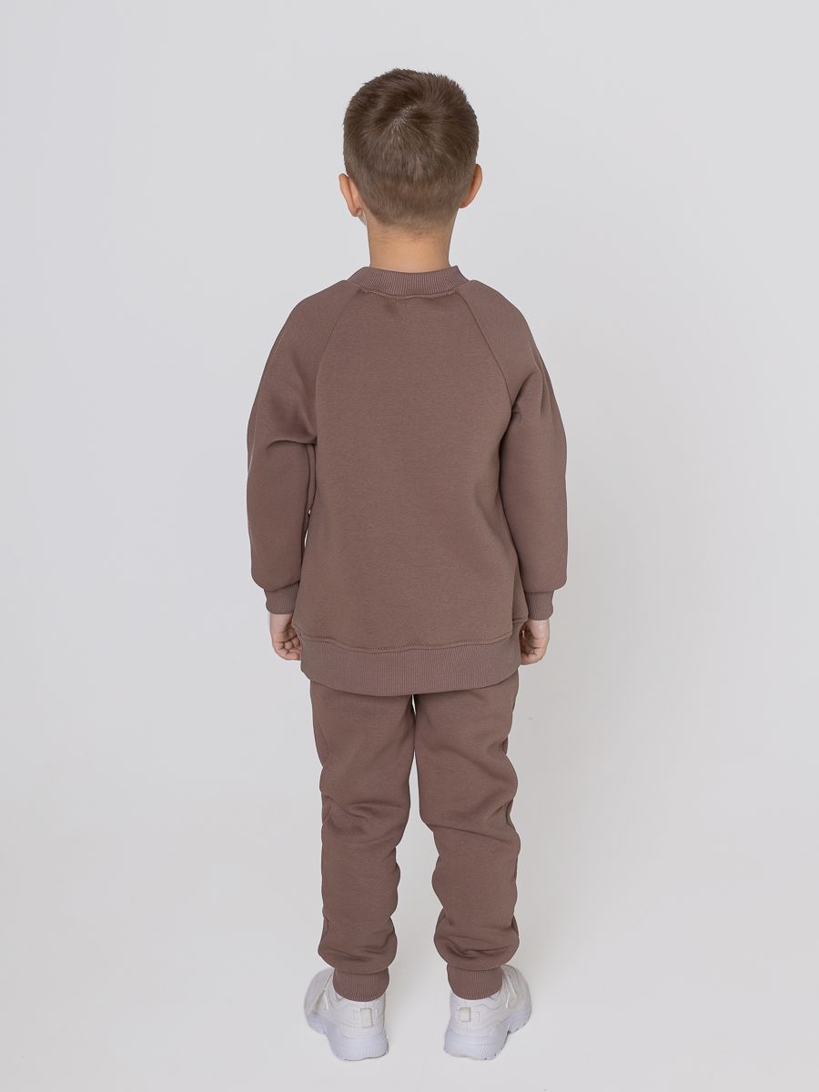 Костюм для мальчика предназначен для носки в прохладных помещениях и прогулки на улице, выполнен из мягкого футера с начёсом. Толстовка на поясе, рукава покроя реглан на манжетах. Штанишки с карманами в боковых швах, на манжетах, пояс на резинке.Принт на толстовке, нанесённый методом шелкографии.