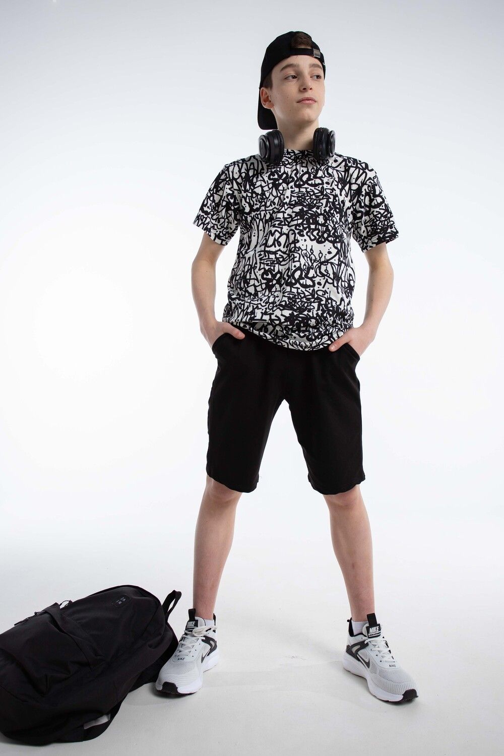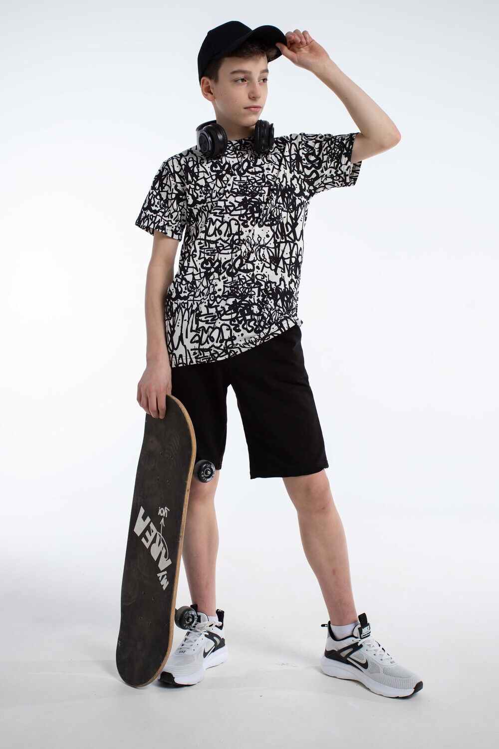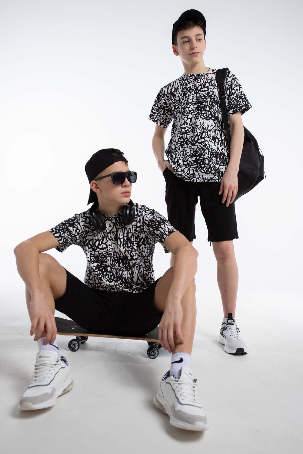 Костюм для подростков состоит из двух изделий - футболки и шорт. Футболка выполнена из ткани с абстрактным принтом. Футболка прямого свободного кроя, круглый вырез горловины, втачной рукав. Шорты выполнены из футера 2-х нитки, прямого кроя, с удобной посадкой. С боковыми карманами и шнурком.