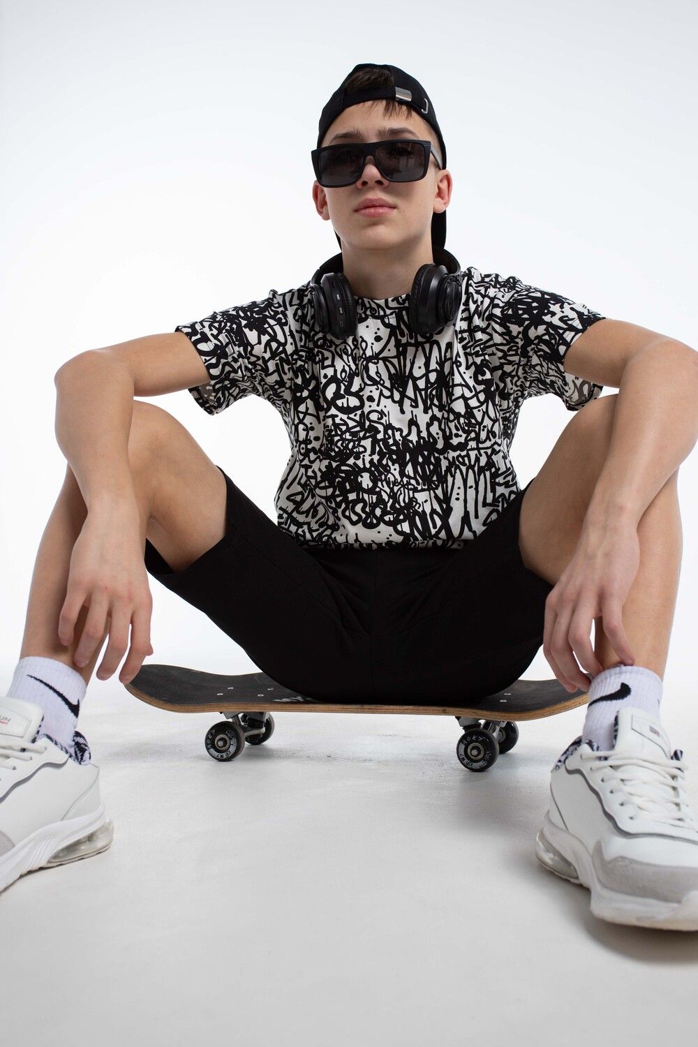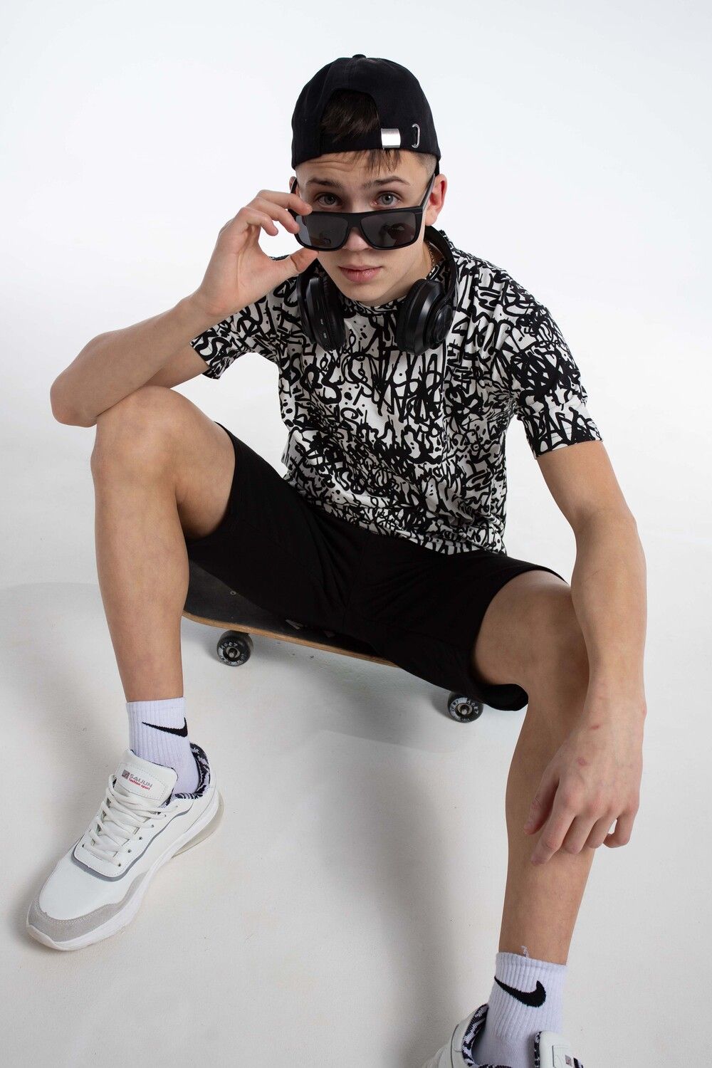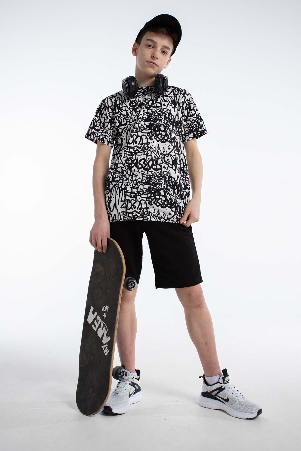 Костюм для подростков состоит из двух изделий - футболки и шорт. Футболка выполнена из ткани с абстрактным принтом. Футболка прямого свободного кроя, круглый вырез горловины, втачной рукав. Шорты выполнены из футера 2-х нитки, прямого кроя, с удобной посадкой. С боковыми карманами и шнурком.