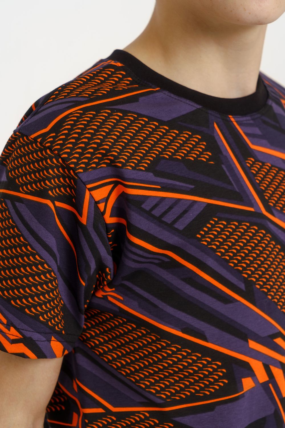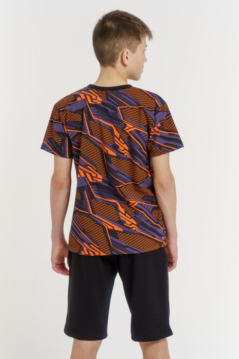 Костюм для подростков состоит из двух изделий - футболки и шорт. Футболка выполнена из ткани с абстрактным принтом. Футболка прямого свободного кроя, круглый вырез горловины, втачной рукав. Шорты выполнены из футера 2-х нитки, прямого кроя, с удобной посадкой. На передней половинке шорт - печать.
