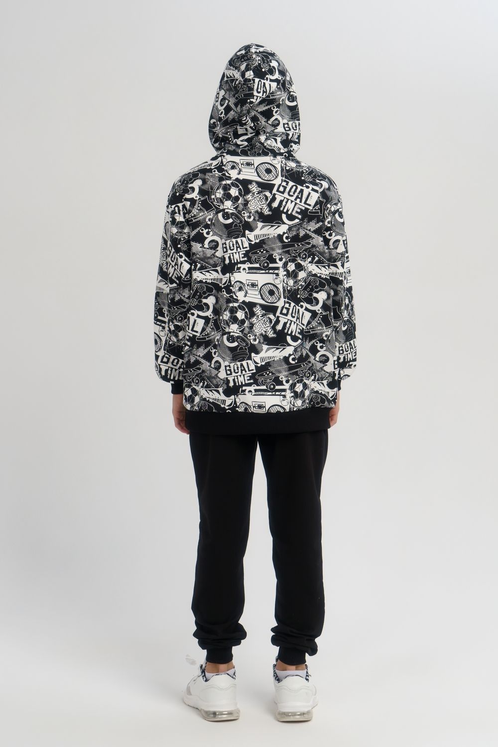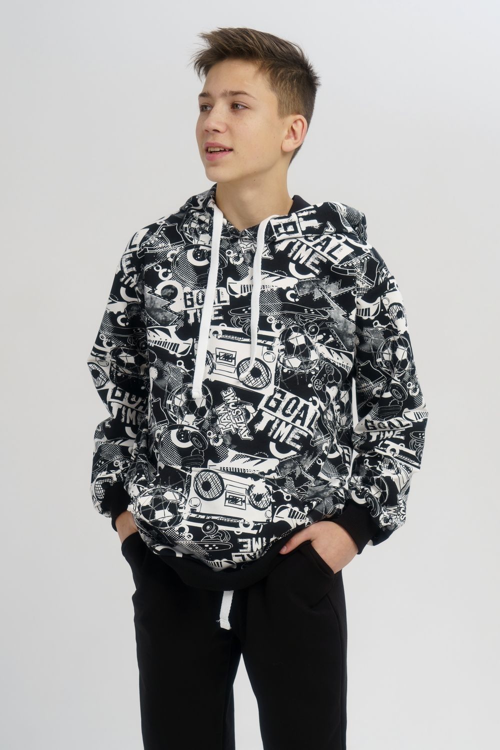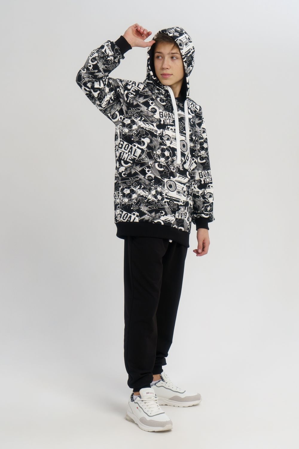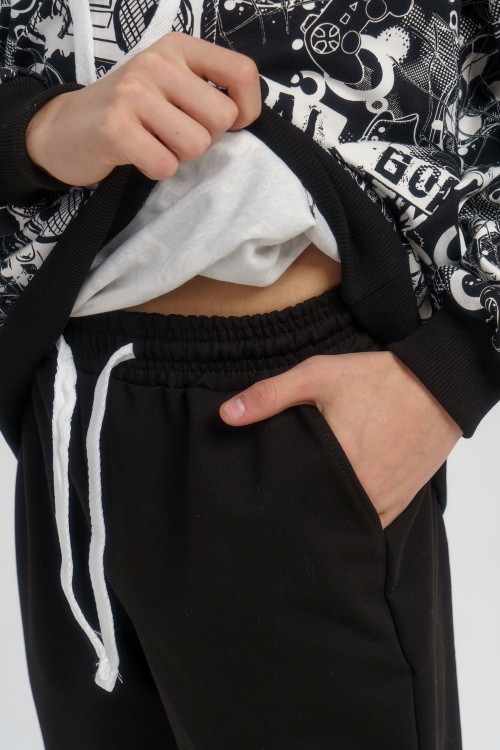 Костюм свободного кроя выполнен из футера 2-х нитки. Состоит из толстовки и брюк. Толстовка с манжетами и поясом из эластичного трикотажа. Рукав втачной со спущенной линией плеча. Брюки свободной посадки с карманами и манжетами из эластичного трикотажа.