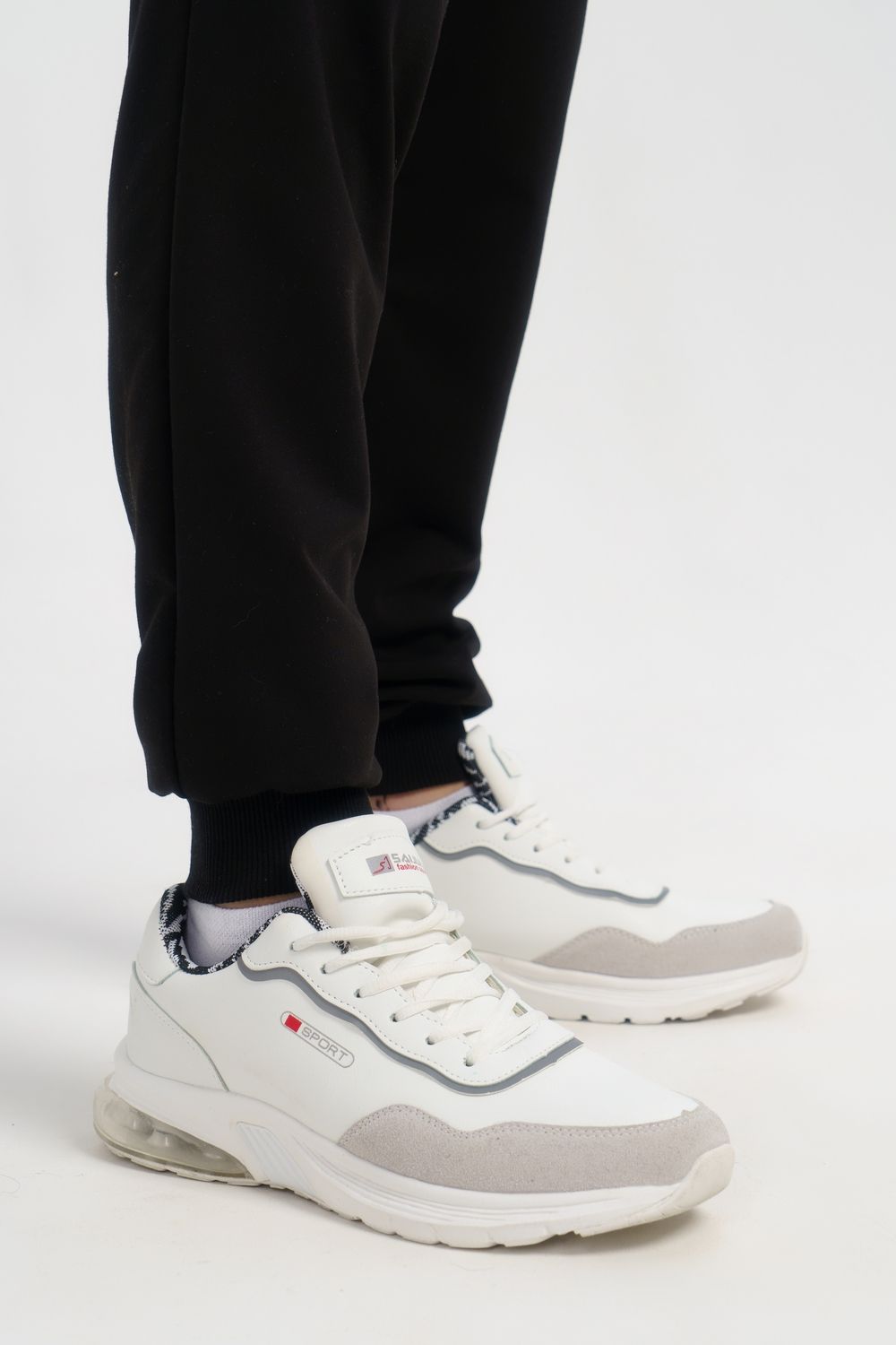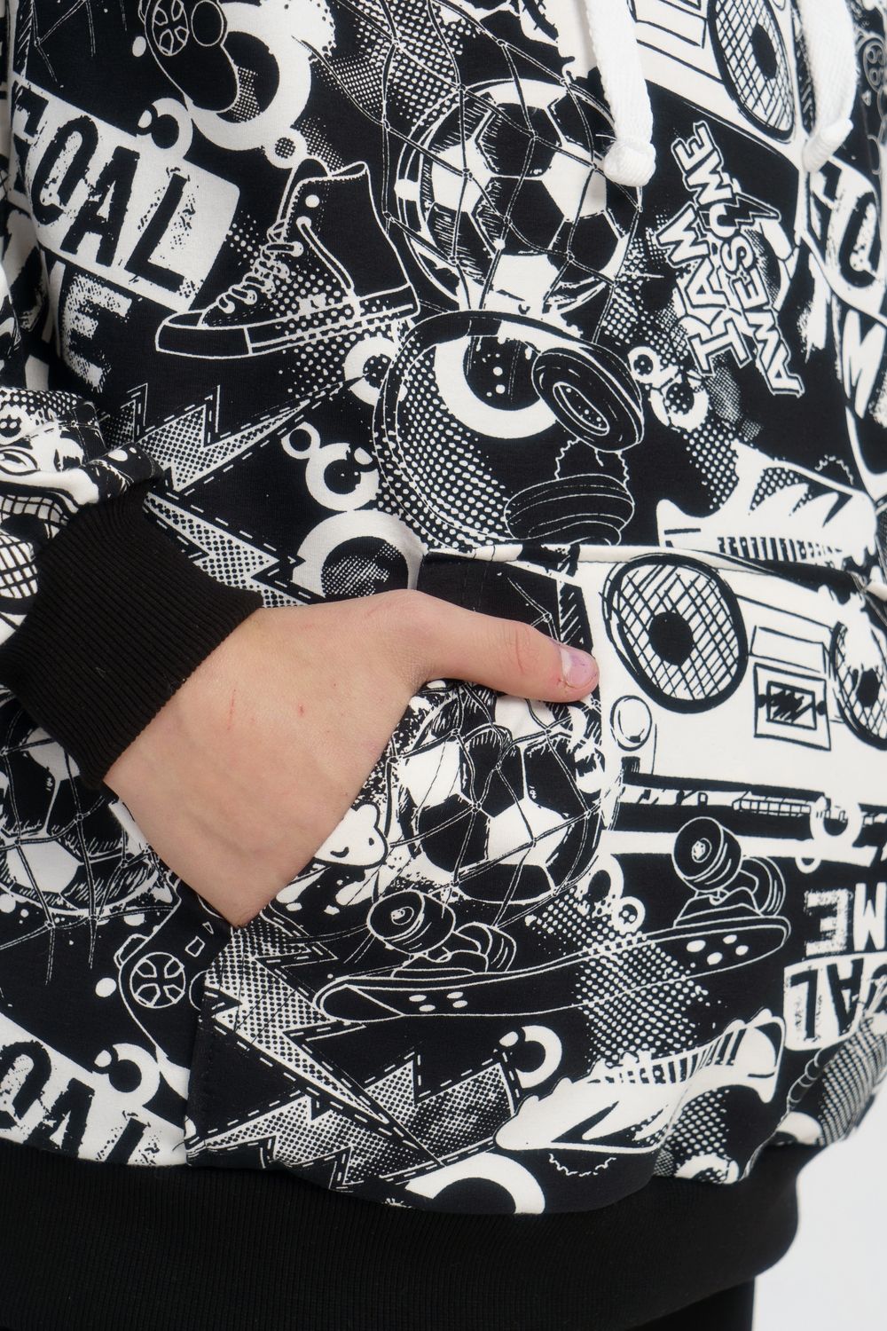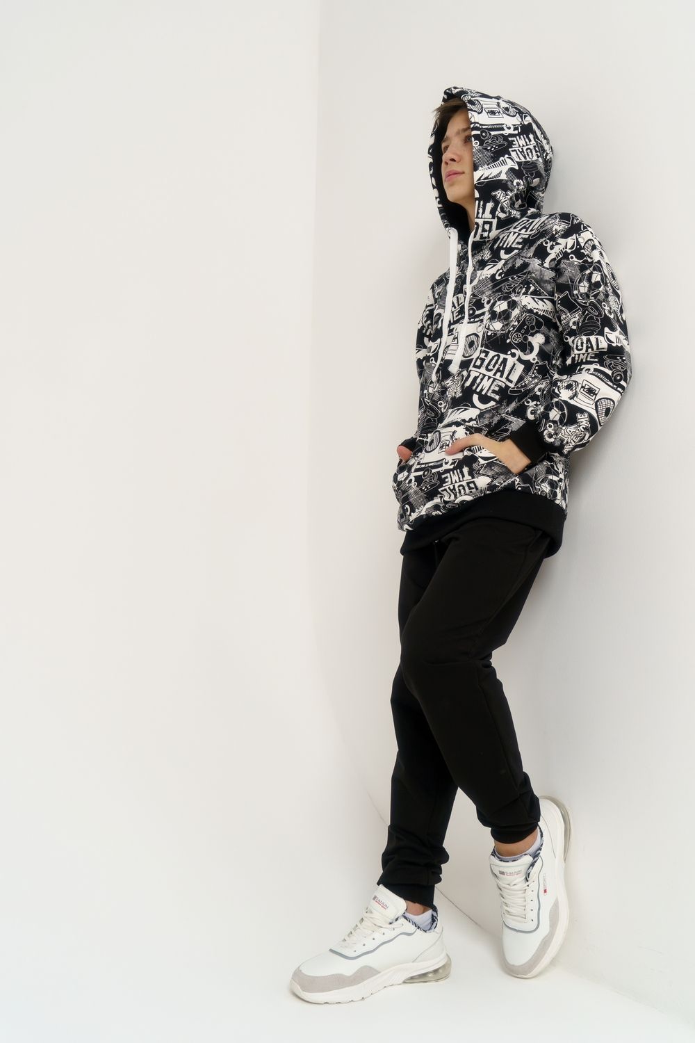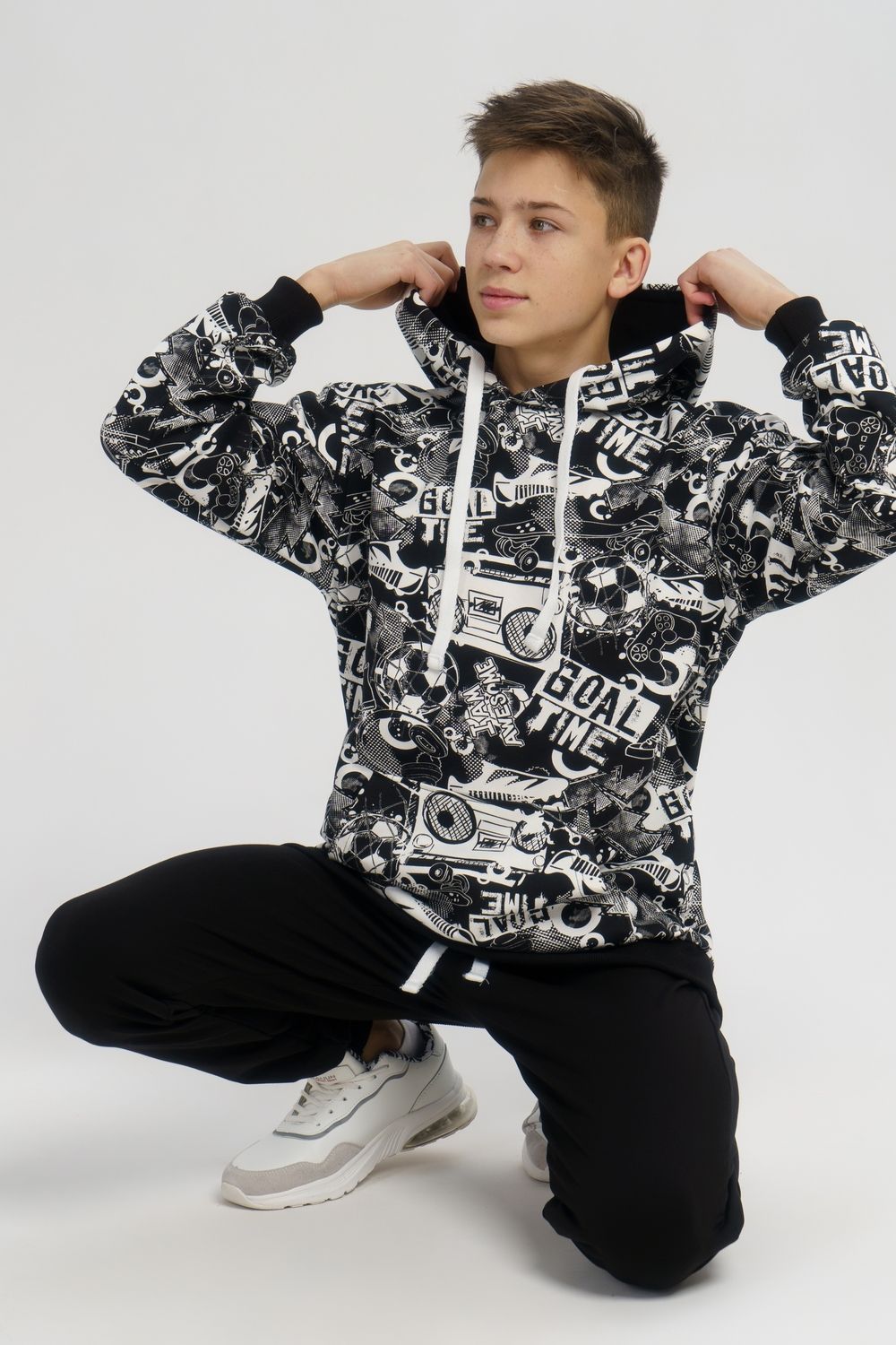 Костюм свободного кроя выполнен из футера 2-х нитки. Состоит из толстовки и брюк. Толстовка с манжетами и поясом из эластичного трикотажа. Рукав втачной со спущенной линией плеча. Брюки свободной посадки с карманами и манжетами из эластичного трикотажа.