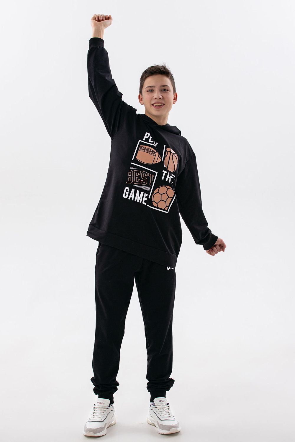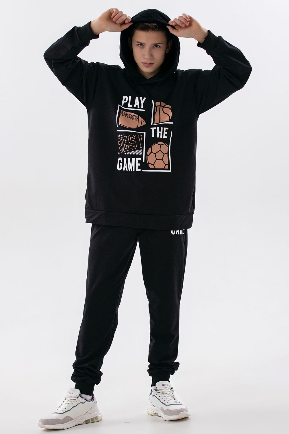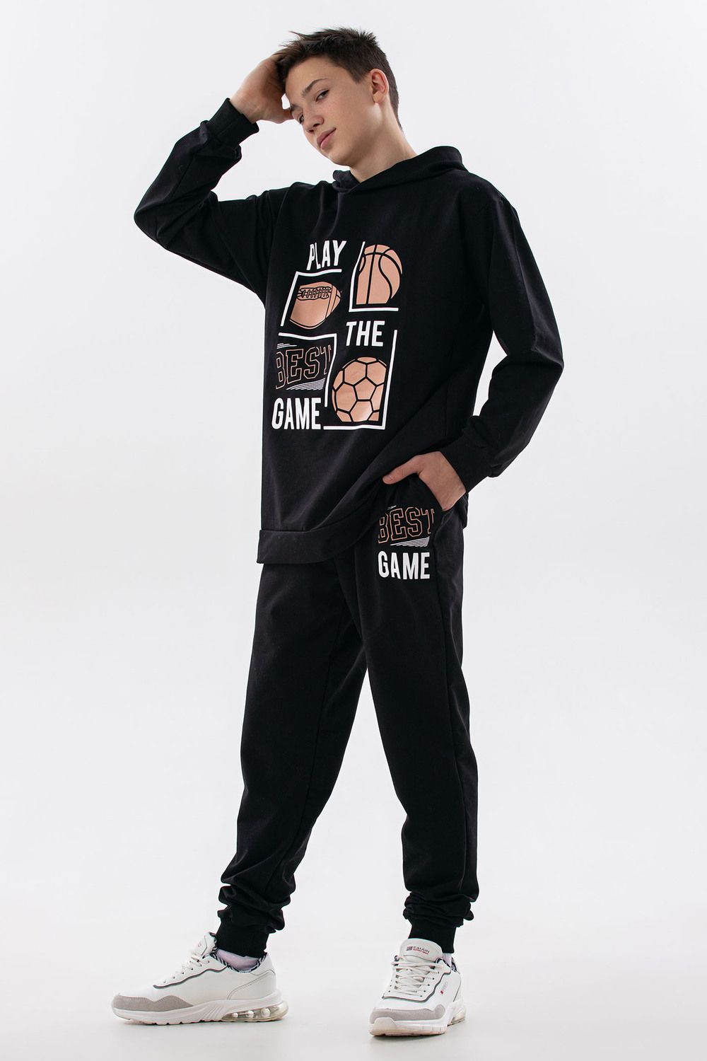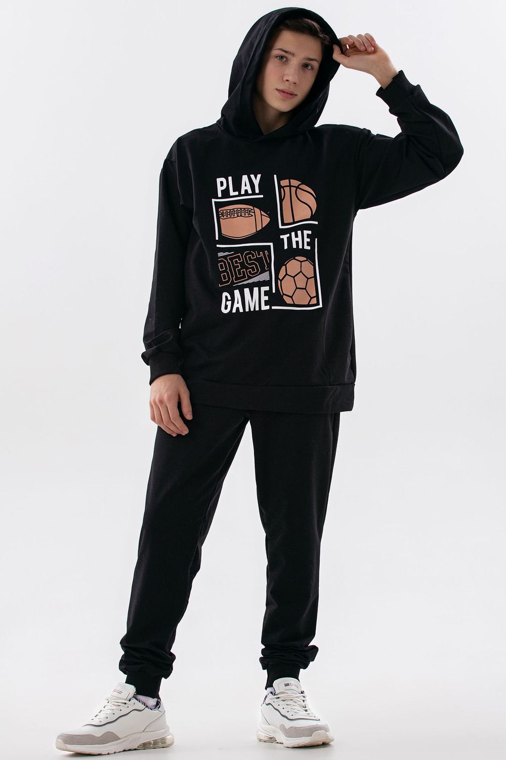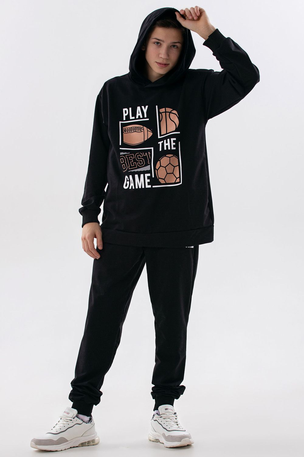 Костюм свободного кроя выполнен из футера 2-х нитки. Состоит из толстовки и брюк. Толстовка с манжетами и поясом из эластичного трикотажа. Рукав втачной со спущенной линией плеча. На полочке принт. Брюки свободной посадки с карманами и манжетами из эластичного трикотажа.