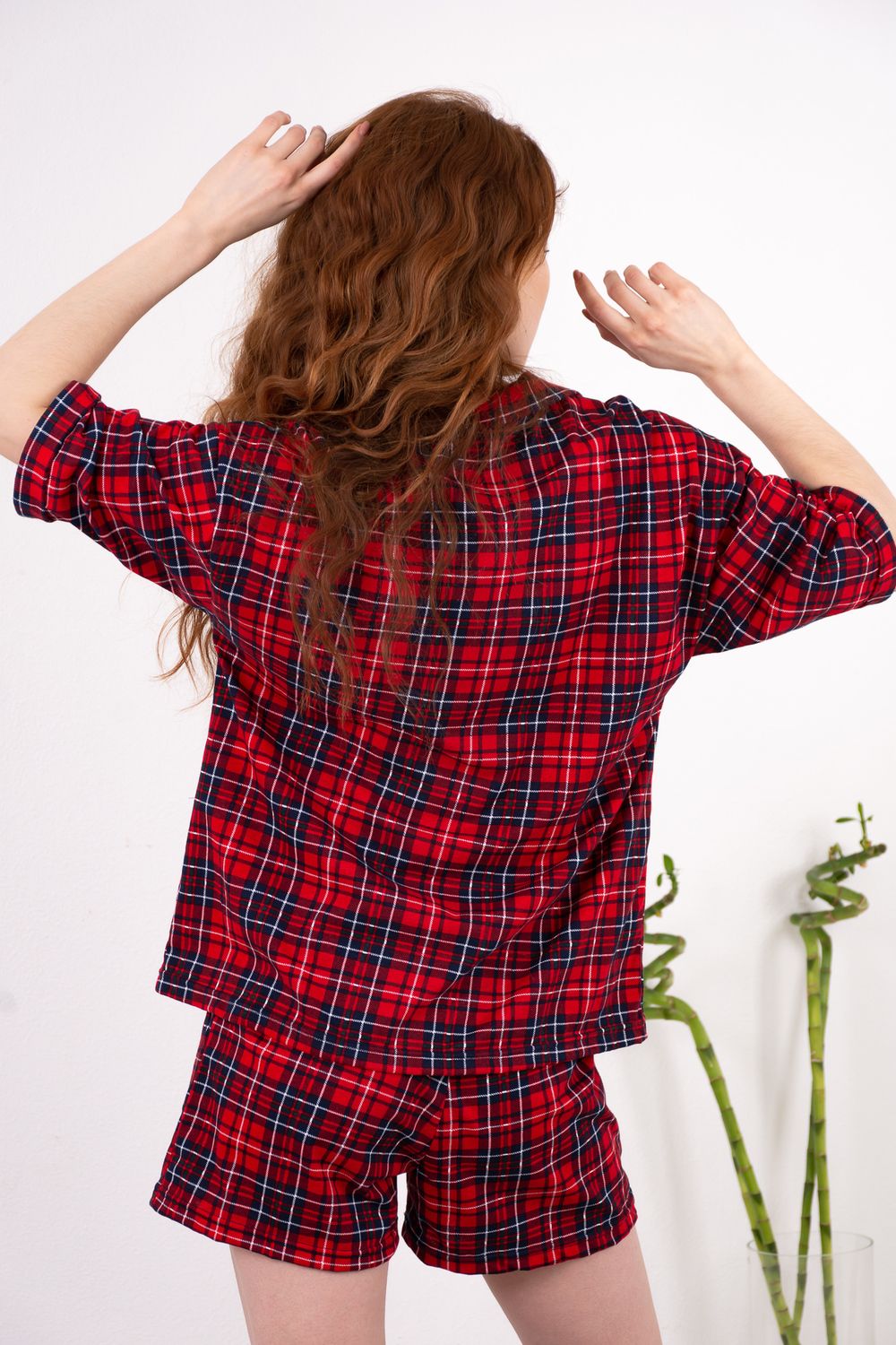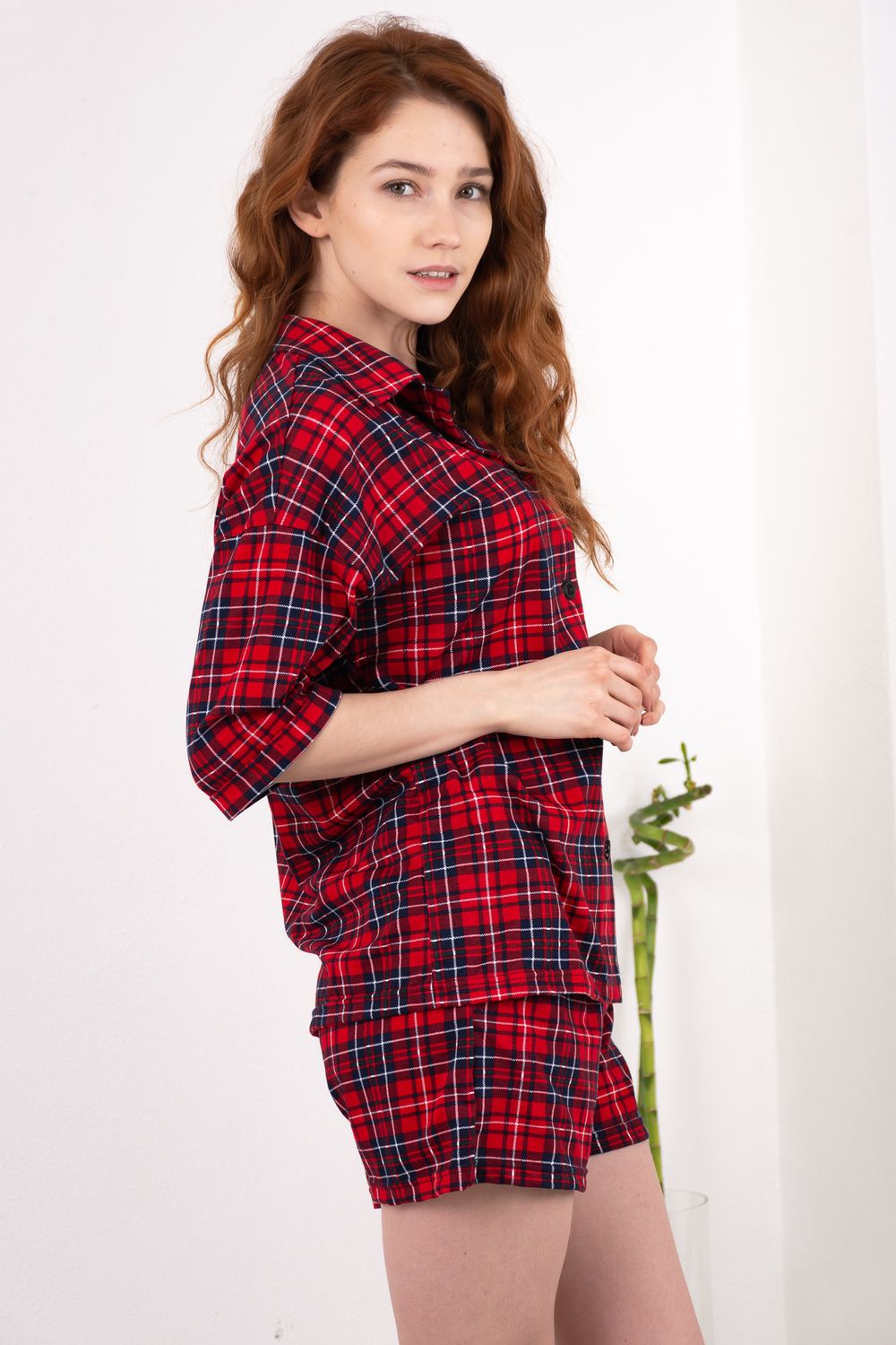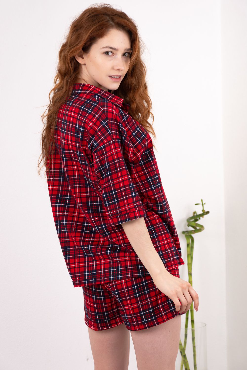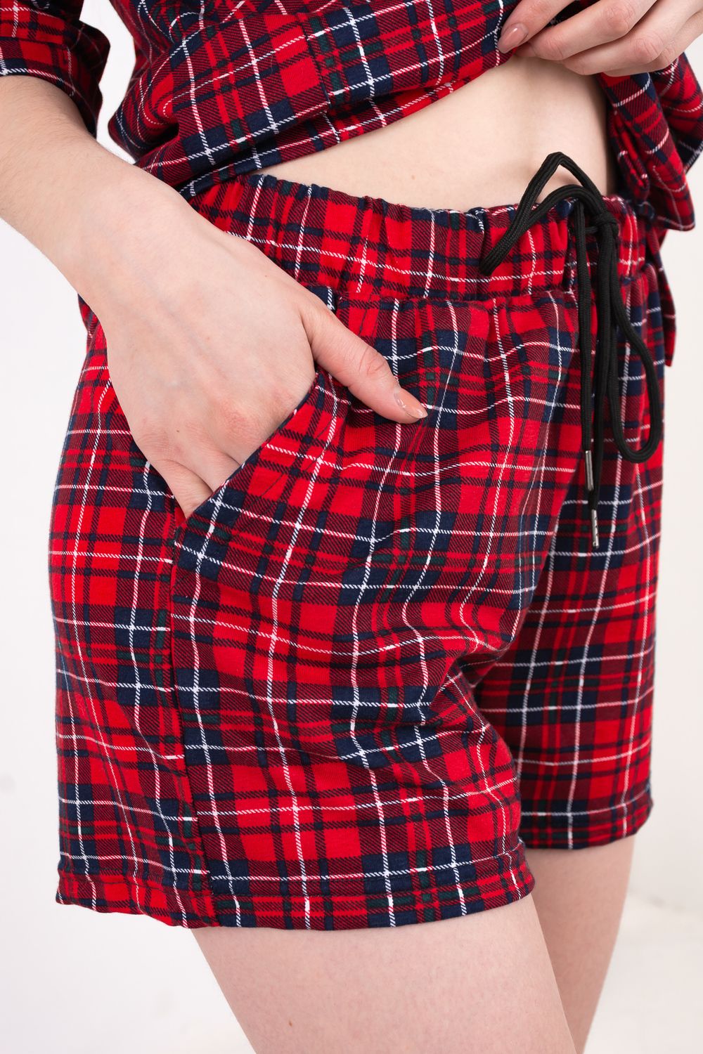 Костюм, состоящий из рубашки и шорт. Рубашка из лёгкого мягкого трикотажного полотна прямого силуэта, на пуговицах, отложной воротник, втачной рукав с манжетами, застёжка на пуговицах. Шорты свободного кроя с боковыми карманами. В притачной пояс вставлен шнурок, благодаря которому можно регулировать ширину пояса.