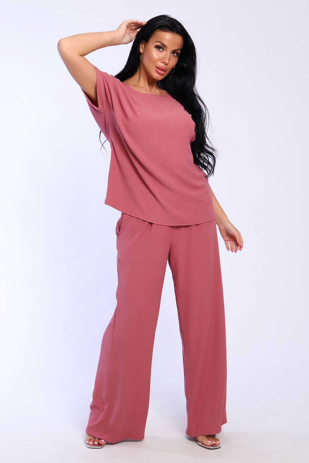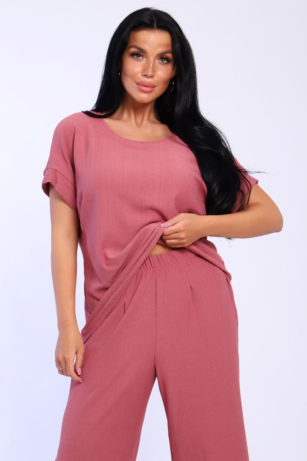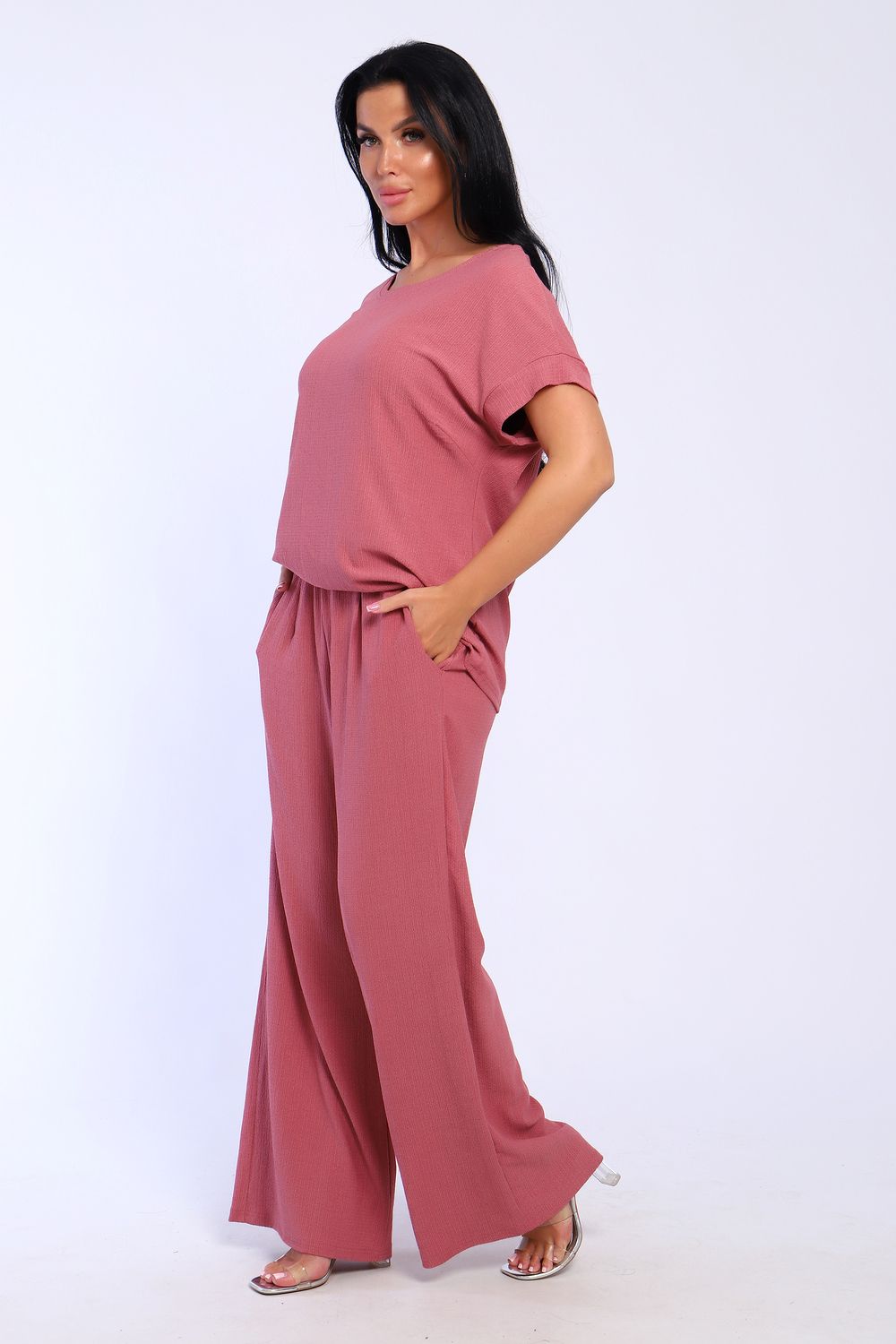Брюки палаццо и футболка со спущенной проймой и с круглым вырезом горловины из тонкого, струящего материала - жатка. Такой красивый модный костюм не оставит равнодушной ни одну модницу. Вещи представлены стандартных и больших размеров для дам с пышными формами. Расклешенные брючки с завышенной талией на резинке с карманами отличаются удобным кроем, они стандартной длины и превосходно садятся по фигуре женщин, визуально удлиняют ноги и придают силуэту идеальные очертания. Благодаря наличию нагрудных вытачек футболка идеально садиться по фигуре.