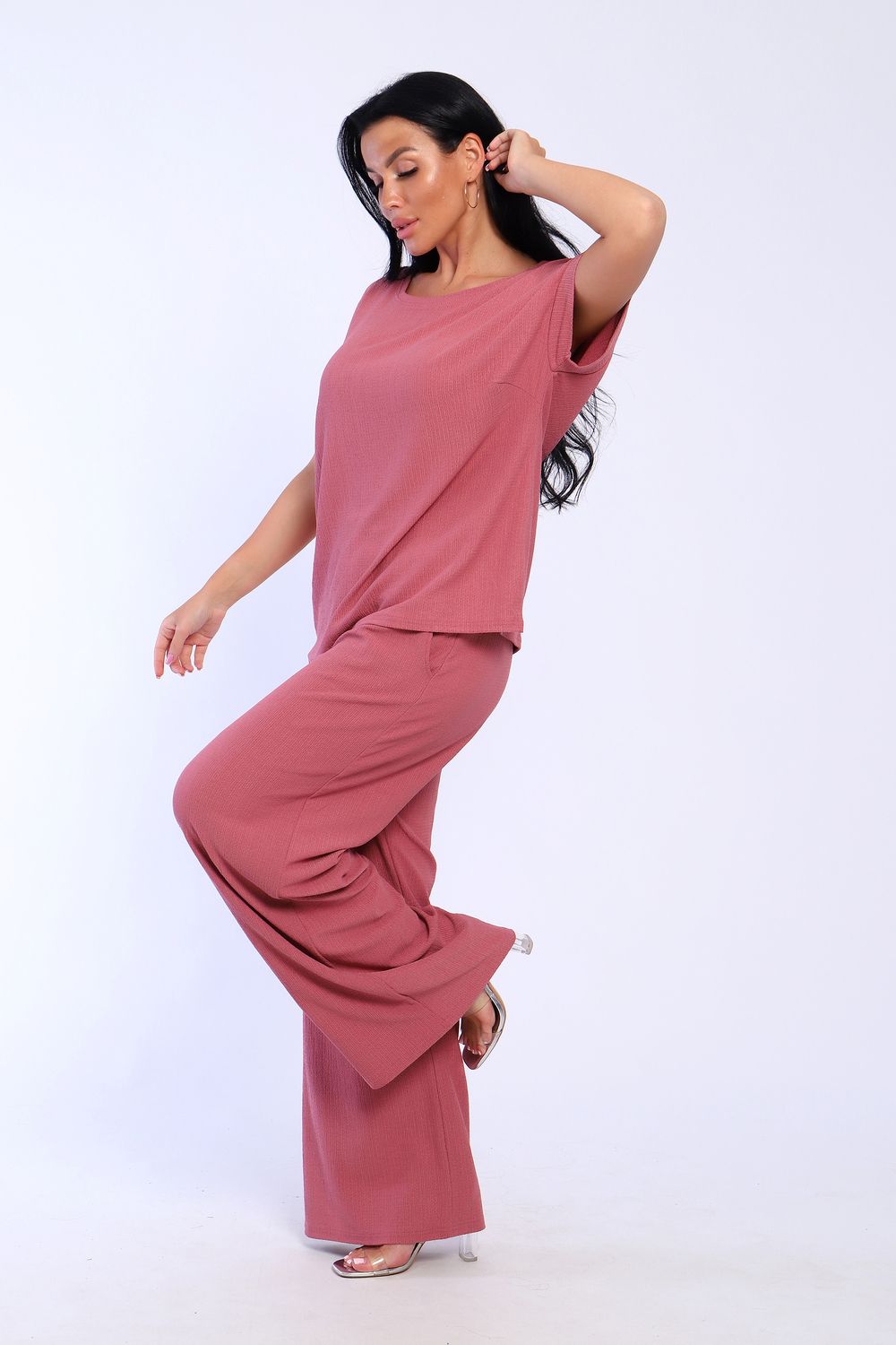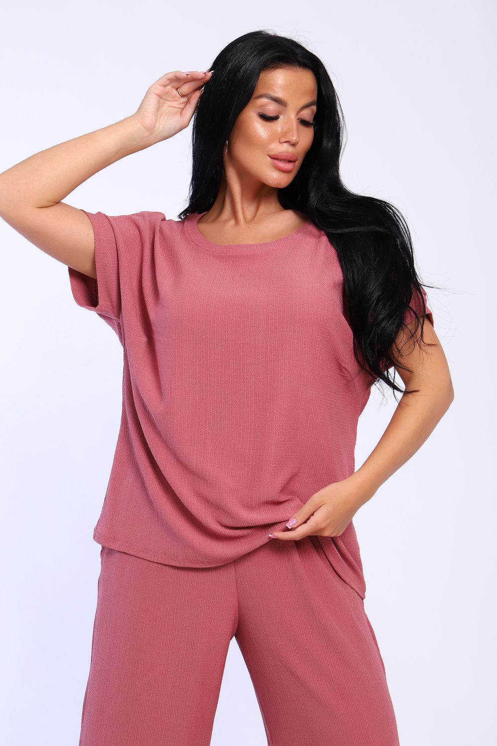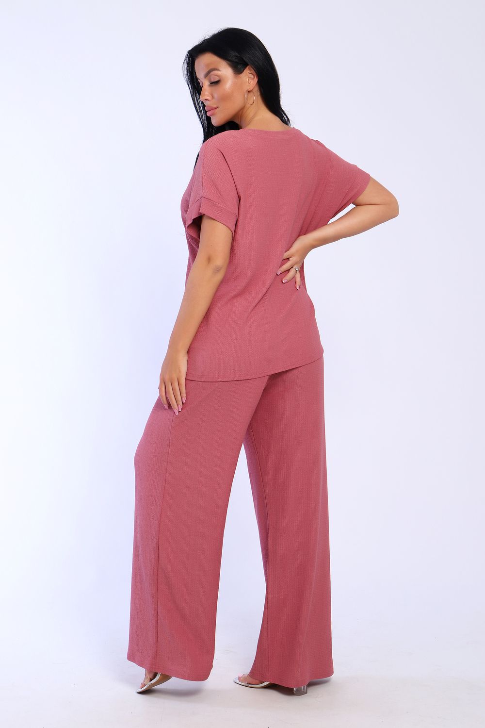 Брюки палаццо и футболка со спущенной проймой и с круглым вырезом горловины из тонкого, струящего материала - жатка. Такой красивый модный костюм не оставит равнодушной ни одну модницу. Вещи представлены стандартных и больших размеров для дам с пышными формами. Расклешенные брючки с завышенной талией на резинке с карманами отличаются удобным кроем, они стандартной длины и превосходно садятся по фигуре женщин, визуально удлиняют ноги и придают силуэту идеальные очертания. Благодаря наличию нагрудных вытачек футболка идеально садиться по фигуре.