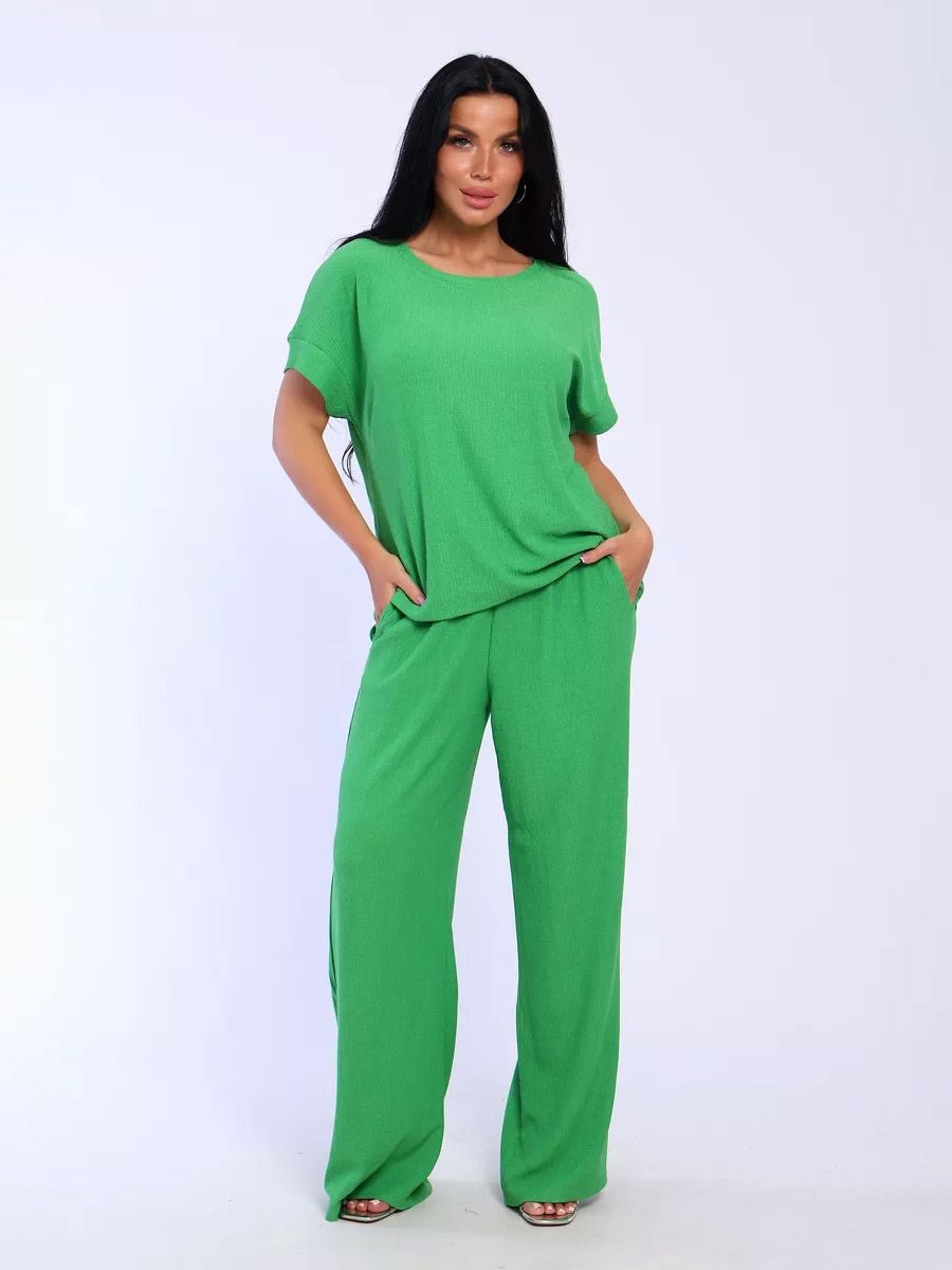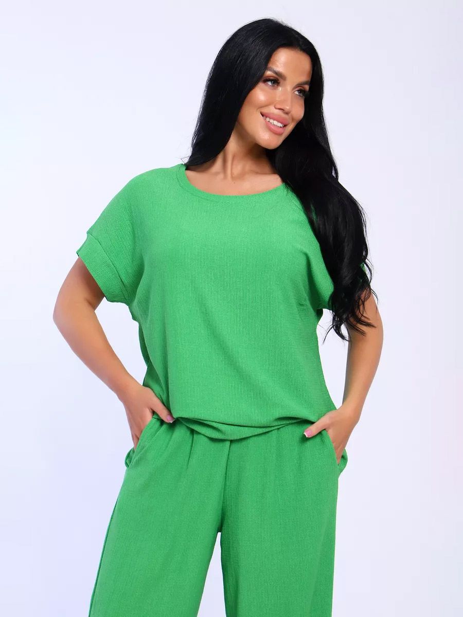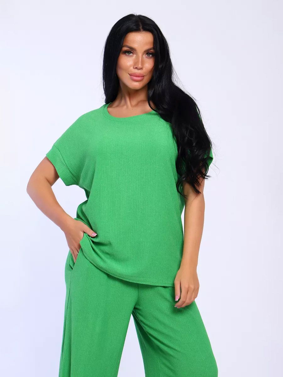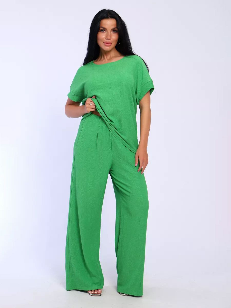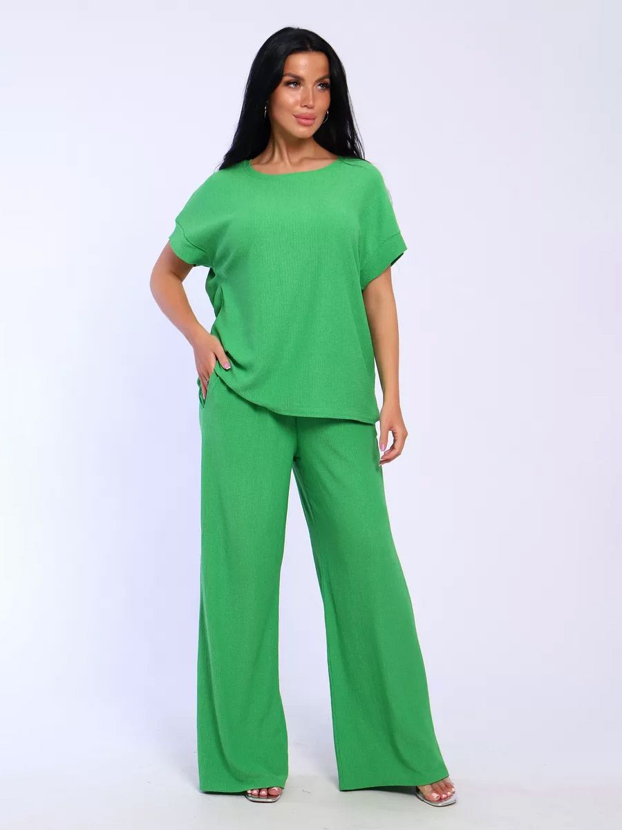 Брюки палаццо и футболка со спущенной проймой и с круглым вырезом горловины из тонкого, струящего материала - жатка. Такой красивый модный костюм не оставит равнодушной ни одну модницу. Вещи представлены стандартных и больших размеров для дам с пышными формами. Расклешенные брючки с завышенной талией на резинке с карманами отличаются удобным кроем, они стандартной длины и превосходно садятся по фигуре женщин, визуально удлиняют ноги и придают силуэту идеальные очертания. Благодаря наличию нагрудных вытачек футболка идеально садиться по фигуре.