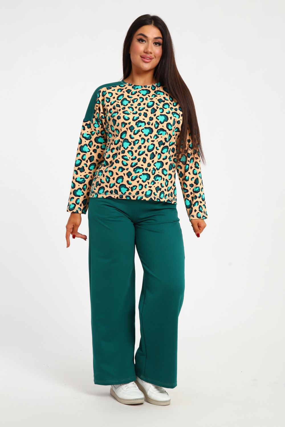Трикотажный женский костюм предназначен для девушек, ценящих комфорт, удобство и спортивный стиль. Он имеет свободный крой, который подходит для тех, кто предпочитает свободные вещи. Джемпер со спущенным рукавом. Штаны клеш в стиле палаццо с карманами имеют завышенную посадку и визуально вытягивают фигуру, что особенно актуально для невысоких и полных девушек. Модель подчеркивает фигуру и скрывает все недостатки. Подойдет для прогулок в кино с друзьями, путешествий, работы в офисе, праздника, а также как вечерний модный образ на свидание.