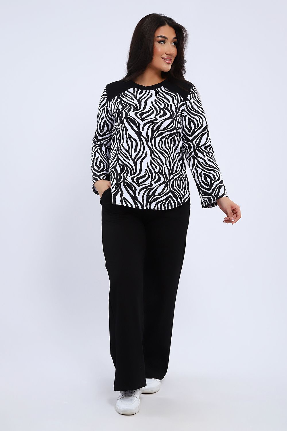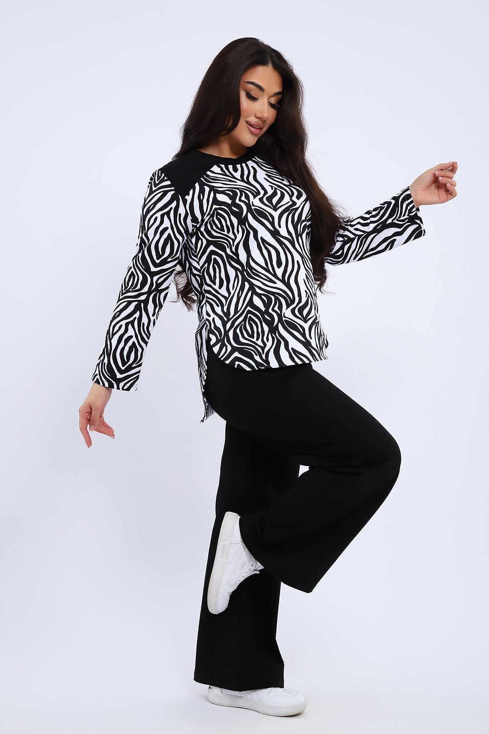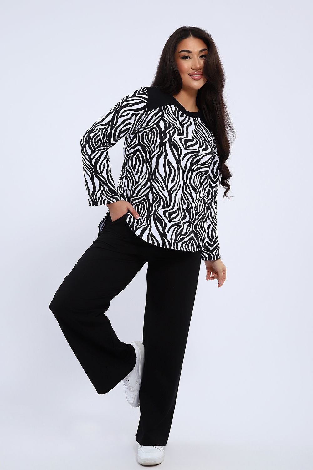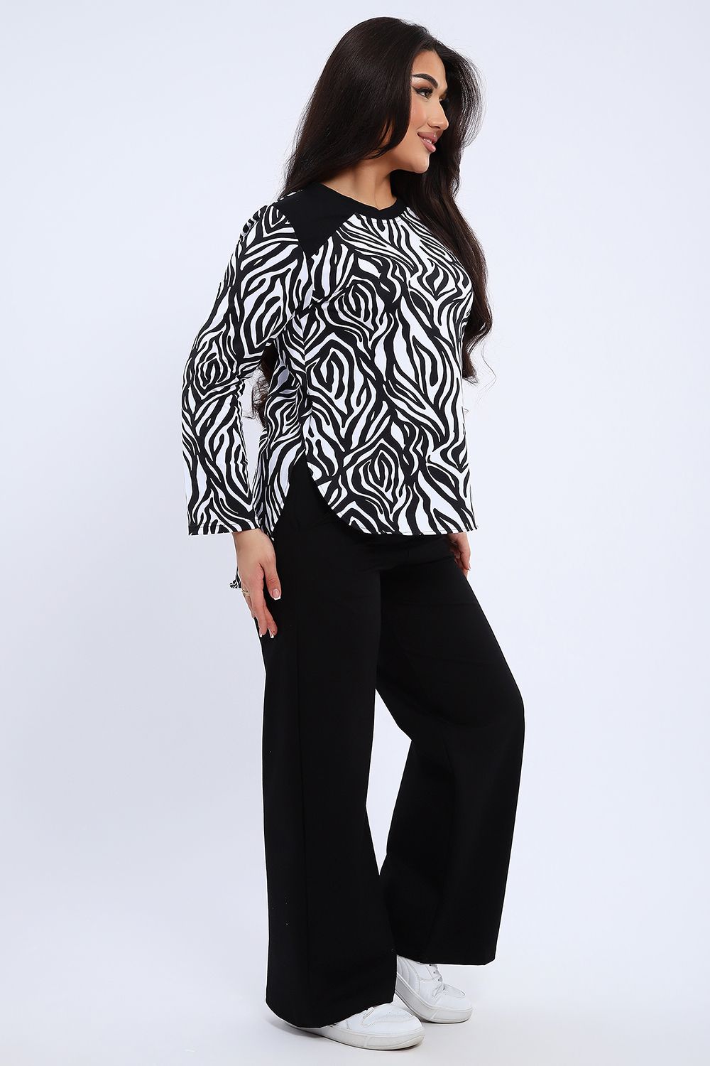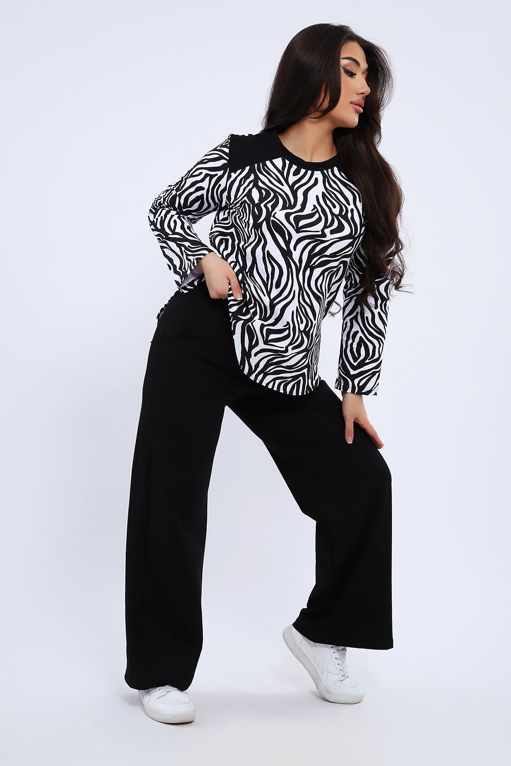 Оригинальный брючный костюм.Трикотажный женский костюм предназначен для девушек, ценящих комфорт, удобство и спортивный стиль. Блузка со вставками, штаны клеш в стиле палаццо с карманами имеют завышенную посадку и визуально вытягивают фигуру, что особенно актуально для невысоких и полных девушек. Модель подчеркивает фигуру и скрывает все недостатки. Подойдет для прогулок в кино с друзьями, путешествий, работы в офисе, праздника, а также как вечерний модный образ на свидание.